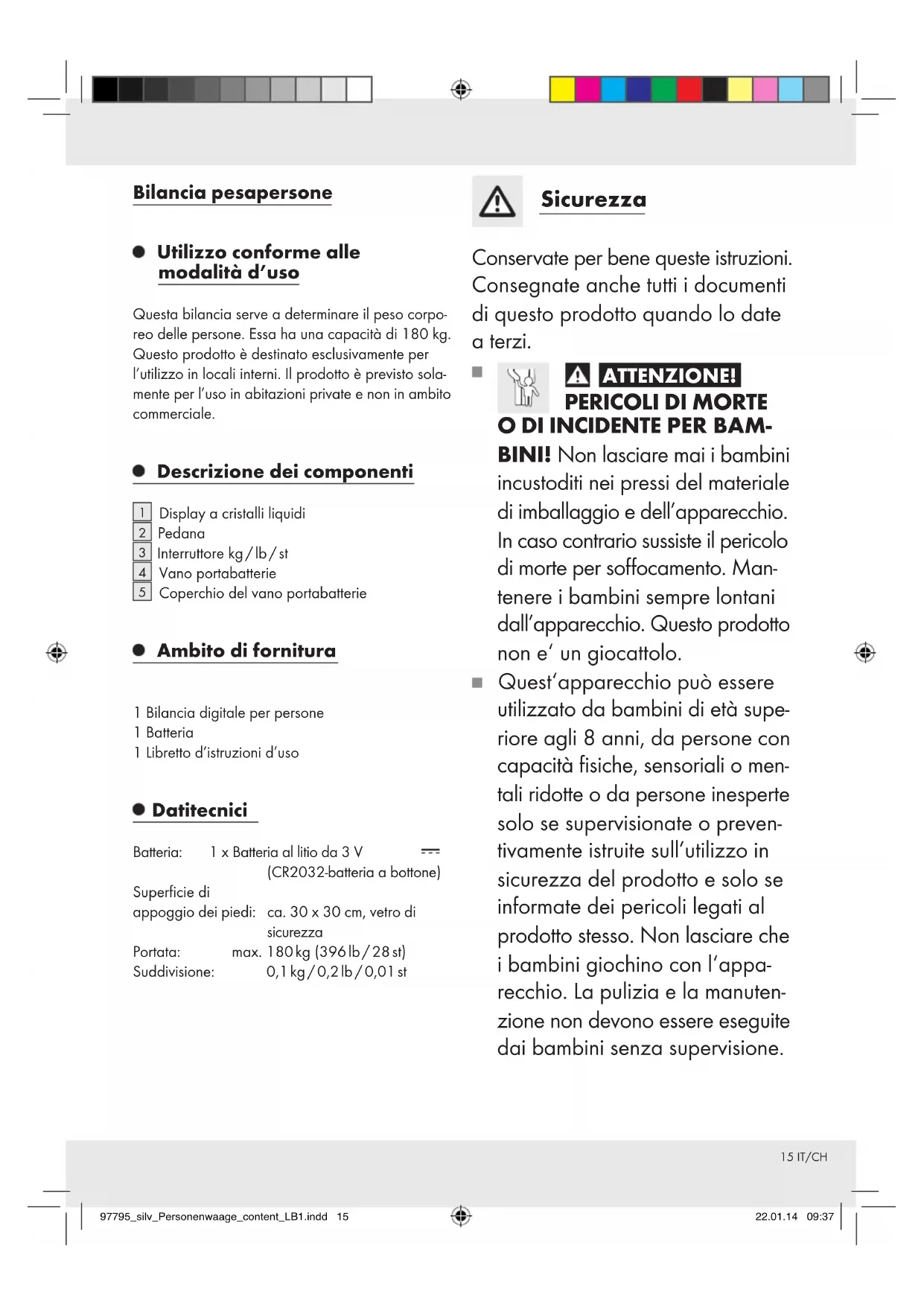 BINI! Non lasciare mai i bambini incustoditi nei pressi del materiale di imballaggio e dell’apparecchio. In caso contrario sussiste il pericolo di morte per soffocamento. Man- tenere i bambini sempre lontani dall’apparecchio. Questo prodotto non e‘ un giocattolo. Quest‘apparecchio può essere utilizzato da bambini di età supe- riore agli 8 anni, da persone con capacità fisiche, sensoriali o men- tali ridotte o da persone inesperte solo se supervisionate o preven- tivamente istruite sull’utilizzo in sicurezza del prodotto e solo se informate dei pericoli legati al prodotto stesso. Non lasciare che i bambini giochino con l‘appa- recchio. La pulizia e la manuten- zione non devono essere eseguite dai bambini senza supervisione. 97795_silv_Personenwaage_content_LB1.indd 15 22.01.14 09:3716 IT/CH ATTENZIONE! PERICOLO DI LESIONE! Non caricare la bilancia con un peso superiore ai 180 kg. Il vetro di sicurezza potrebbe rompersi e provocare ferite da taglio. ATTENZIONE! PERICOLO DI LESIONE! Non salire sulla bilancia con piedi bagnati e non utilizzare la bilancia quando la superficie di appoggio dei piedi è umida. Sussiste il pericolo di scivolamento. Proteggere la bilancia da colpi, umidità, polvere, agenti chimici, forti oscillazioni di temperatura e da fonti di calore (forni, caloriferi) troppo vicini. Controllare l’apparecchio prima di avviarlo per verificare l’eventuale presenza di danneggiamenti. Non mettere in esercizio un apparec- chio danneggiato. In caso di guasti o di apparecchio difettoso rimuovere la batteria. In caso contrario sussiste il rischio di perdite. Fare eseguire riparazioni sola- mente dal Centro assistenza o da un elettricista qualificato. Pericoli nel maneggiare le batterie ATTENZIONE! PERICOLO DI MORTE! Le batterie non de- vono finire in mano ai bambini. Non lasciare batterie in giro. Sussiste il pericolo che bambini o animali domestici le ingoino. In tal caso, chiedere subito l’inter- vento di un medico. ATTENZIONE! PERI-