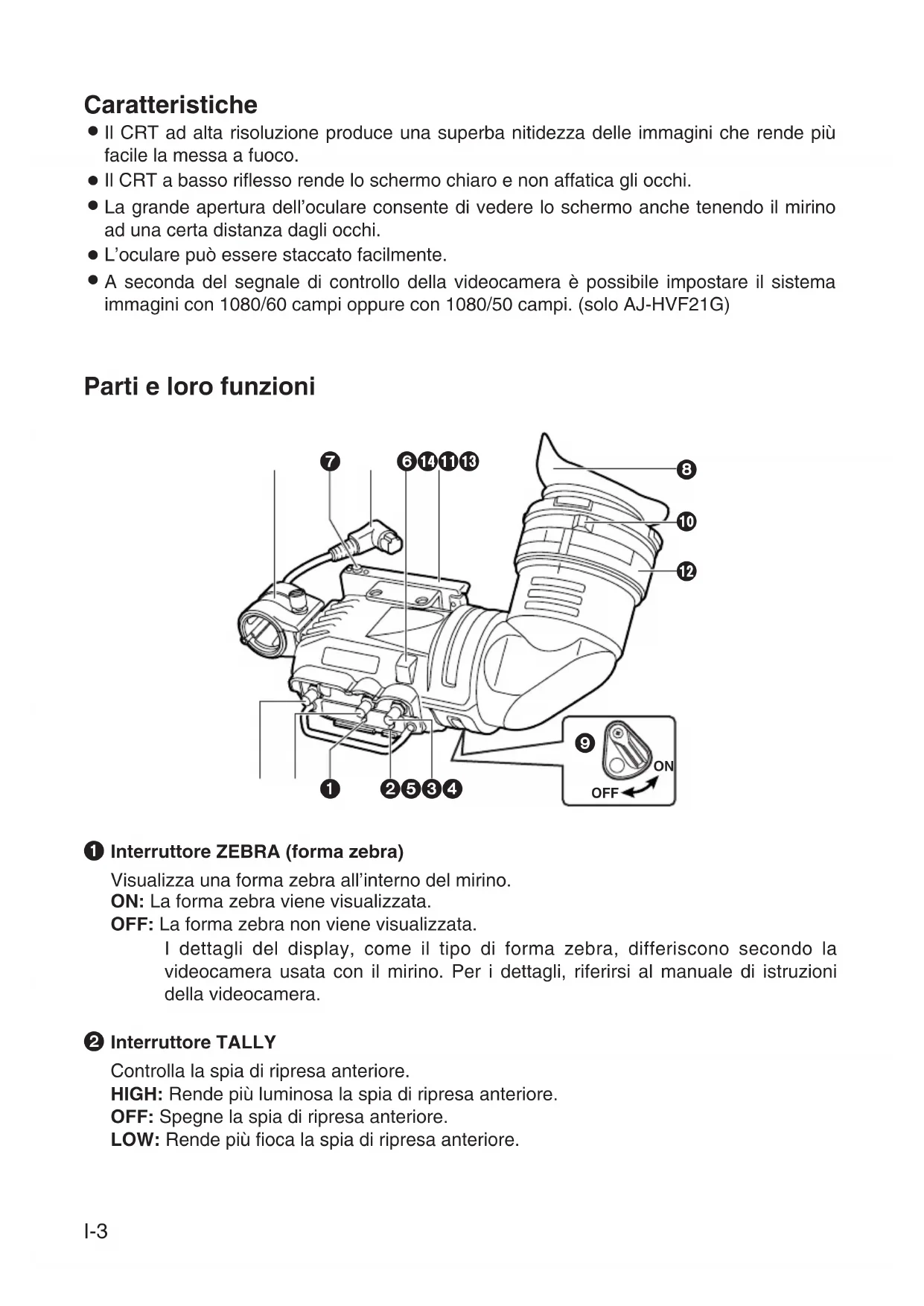 Attaccare il cavo connettore microfono alla presa MIC IN. MirinoSupportomicrofono 04.21G/27G伊(16)06.4.617:09ページ14I-15 Alimentazione: C.c. 12 V (fornita dalla videocamera) Assorbimento di corrente: 3,8 W (AJ-HVF21G) 4,1 W (AJ-HVF27BG) Dati tecnici Cinescopio: Cinescopio 2 pollici monocromatico ad alta risoluzione Sistema immagini: 1080 righe, 50/60 campi selezionabili (AJ-HVF21G) 720 righe, 60 campi (AJ-HVF27BG) Controlli di regolazione esterna: Controlli (BRIGHT, CONTRAST, PEAKING) Interruttori (TALLY HIGH/OFF/LOW, ZEBRA ON/OFF) Temperatura di esercizio: 0°C – 40°C Umidità permissibile: 85% o meno (senza condensa) Dimensioni esterne (L