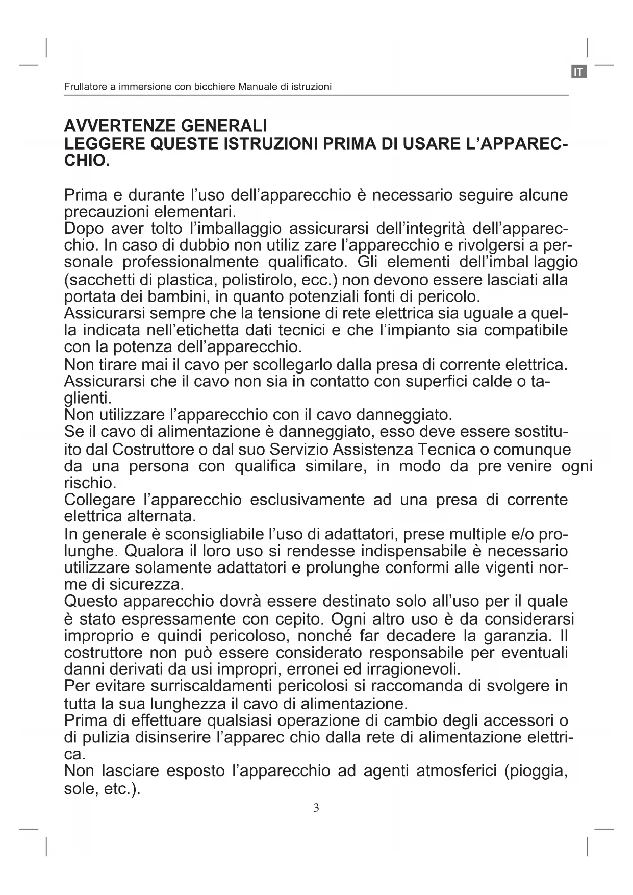 Se il cavo di alimentazione è danneggiato, esso deve essere sostituito dal Costruttore o dal suo Servizio Assistenza Tecnica o comunque da una persona con qualifica similare, in modo da pre venire ogni rischio.