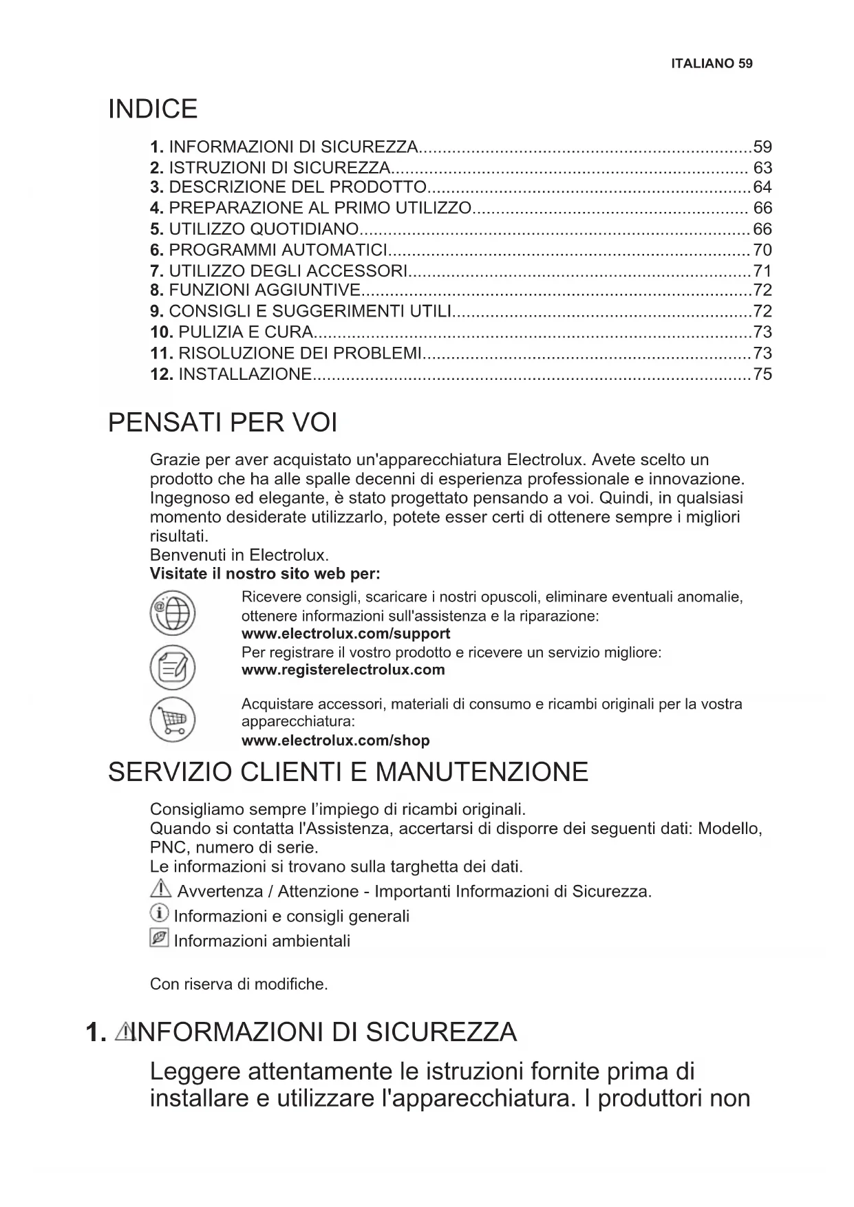 Grazie per aver acquistato un'apparecchiatura Electrolux. Avete scelto un prodotto che ha alle spalle decenni di esperienza professionale e innovazione. Ingegnoso ed elegante, è stato progettato pensando a voi. Quindi, in qualsiasi momento desiderate utilizzarlo, potete esser certi di ottenere sempre i migliori risultati. Benvenuti in Electrolux. Visitate il nostro sito web per: Ricevere consigli, scaricare i nostri opuscoli, eliminare eventuali anomalie, ottenere informazioni sull'assistenza e la riparazione: www.electrolux.com/support Per registrare il vostro prodotto e ricevere un servizio migliore: www.registerelectrolux.com Acquistare accessori, materiali di consumo e ricambi originali per la vostra apparecchiatura: www.electrolux.com/shop