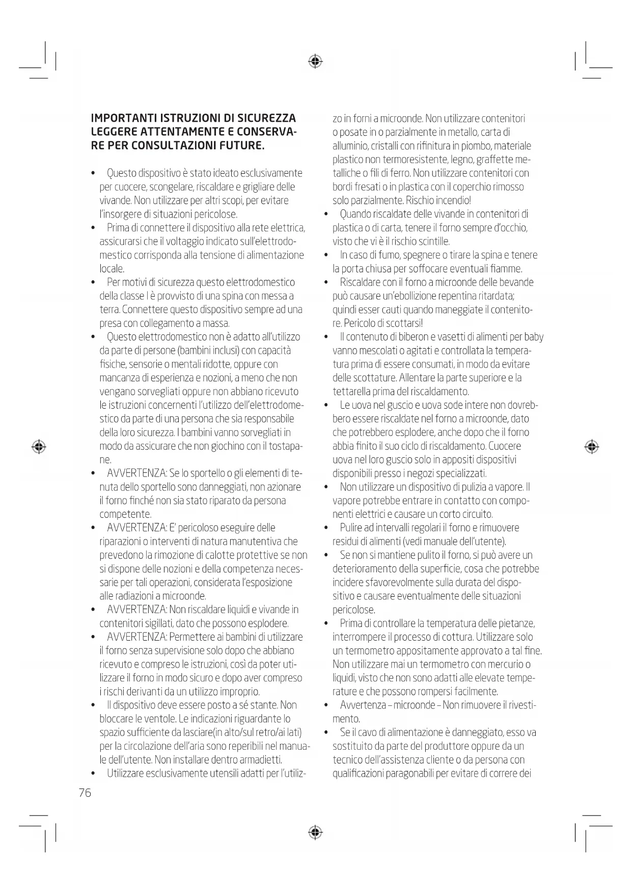 - Questodispositivoèstatoideatoesclusivamente percuocere,scongelare,riscaldareegrigliaredelle vivande.Nonutilizzareperaltriscopi,perevitare l'insorgere di situazioni pericolose.