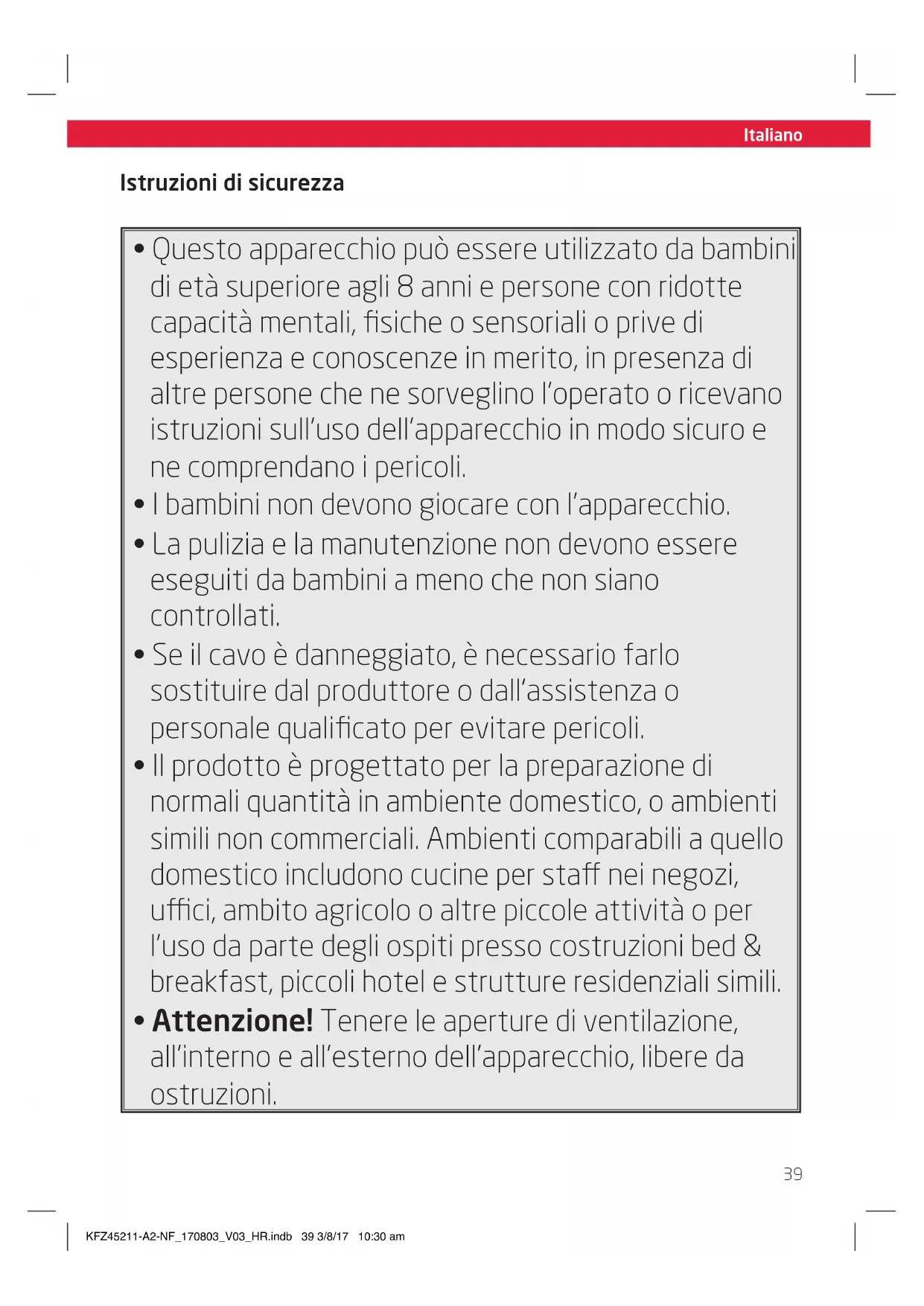 - Attenzione! Tenere le aperture di ventilazione, all’interno e all’esterno dell’apparecchio, libere da ostruzioni. KFZ45211-A2-NF_170803_V03_HR.indb 39 3/8/17 10:30 amItaliano