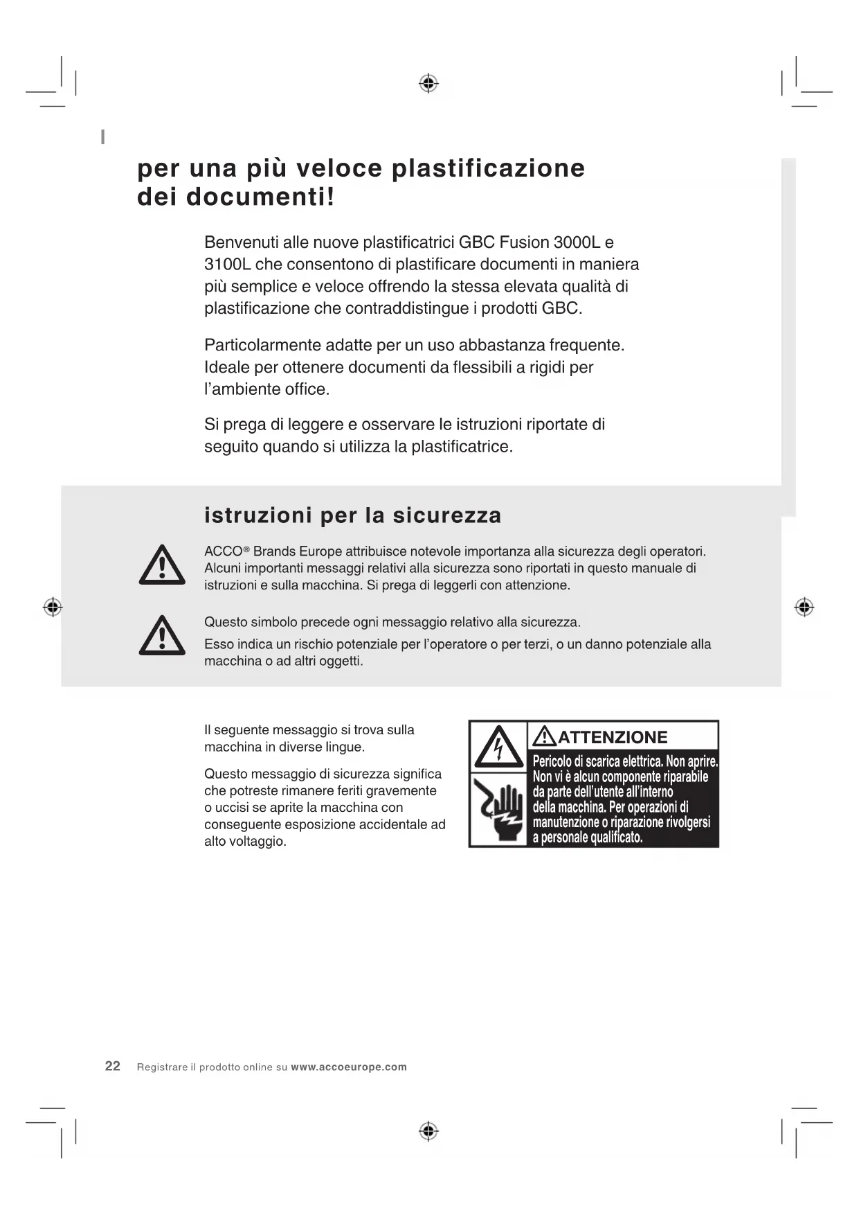 22 Registrare il prodotto online su www.accoeurope.comI assistenza Si prega di non tentare di eettuare interventi di manutenzione o riparazione da soli. Staccare la macchina dalla presa elettrica e rivolgersi per le riparazioni a un rivenditore o distributore GBC. informazioni importanti