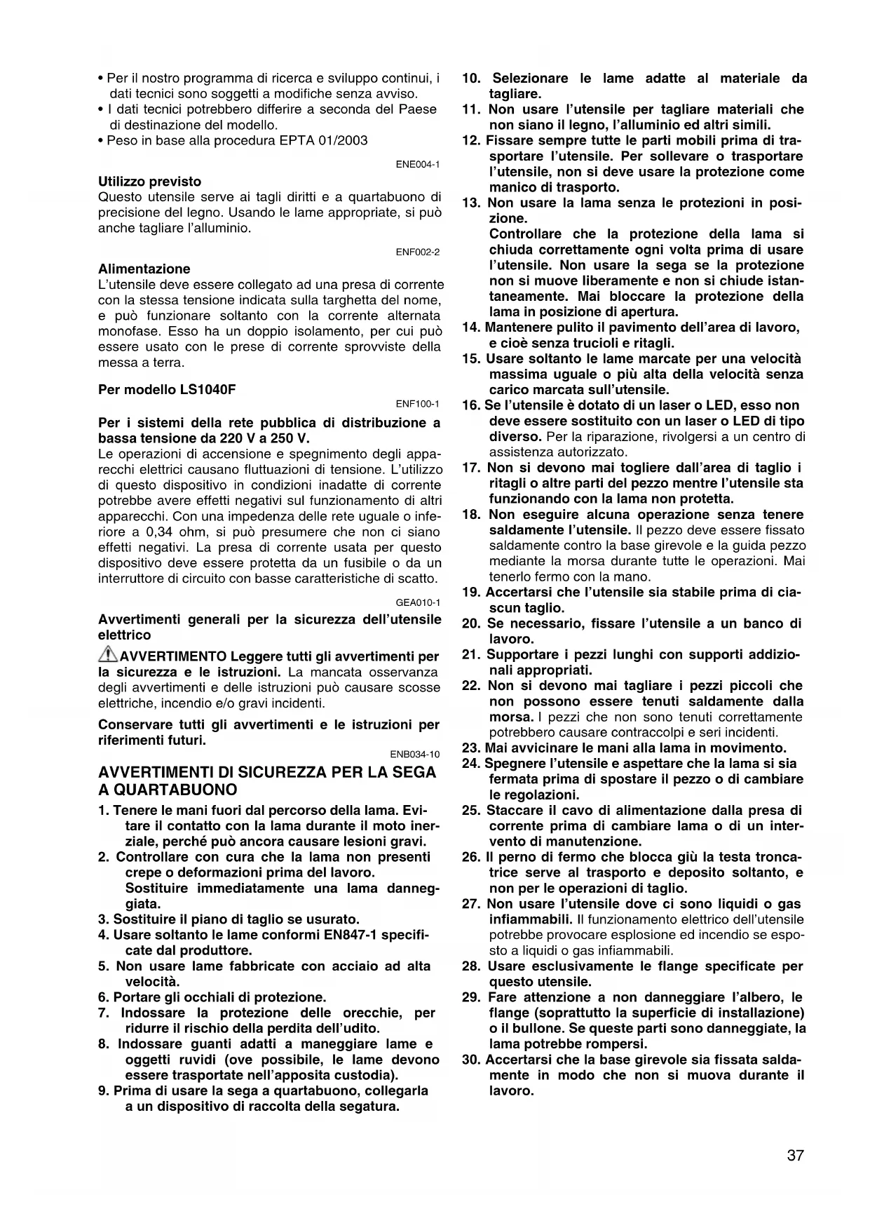 - Peso in base alla procedura EPTA 01/2003 ENE004-1 Utilizzo previsto Questo utensile serve ai tagli diritti e a quartabuono di precisione del legno. Usando le lame appropriate, si può anche tagliare l’alluminio. ENF002-2 Alimentazione L’utensile deve essere collegato ad una presa di corrente con la stessa tensione indicata sulla targhetta del nome, e può funzionare soltanto con la corrente alternata monofase. Esso ha un doppio isolamento, per cui può essere usato con le prese di corrente sprovviste della messa a terra. Per modello LS1040F ENF100-1 Per i sistemi della rete pubblica di distribuzione a bassa tensione da 220 V a 250 V. Le operazioni di accensione e spegnimento degli appa- recchi elettrici causano fluttuazioni di tensione. L’utilizzo di questo dispositivo in condizioni inadatte di corrente potrebbe avere effetti negativi sul funzionamento di altri apparecchi. Con una impedenza delle rete uguale o infe- riore a 0,34 ohm, si può presumere che non ci siano effetti negativi. La presa di corrente usata per questo dispositivo deve essere protetta da un fusibile o da un interruttore di circuito con basse caratteristiche di scatto. GEA010-1 Avvertimenti generali per la sicurezza dell’utensile elettrico AVVERTIMENTO Leggere tutti gli avvertimenti per la sicurezza e le istruzioni. La mancata osservanza degli avvertimenti e delle istruzioni può causare scosse elettriche, incendio e/o gravi incidenti. Conservare tutti gli avvertimenti e le istruzioni per riferimenti futuri. ENB034-10