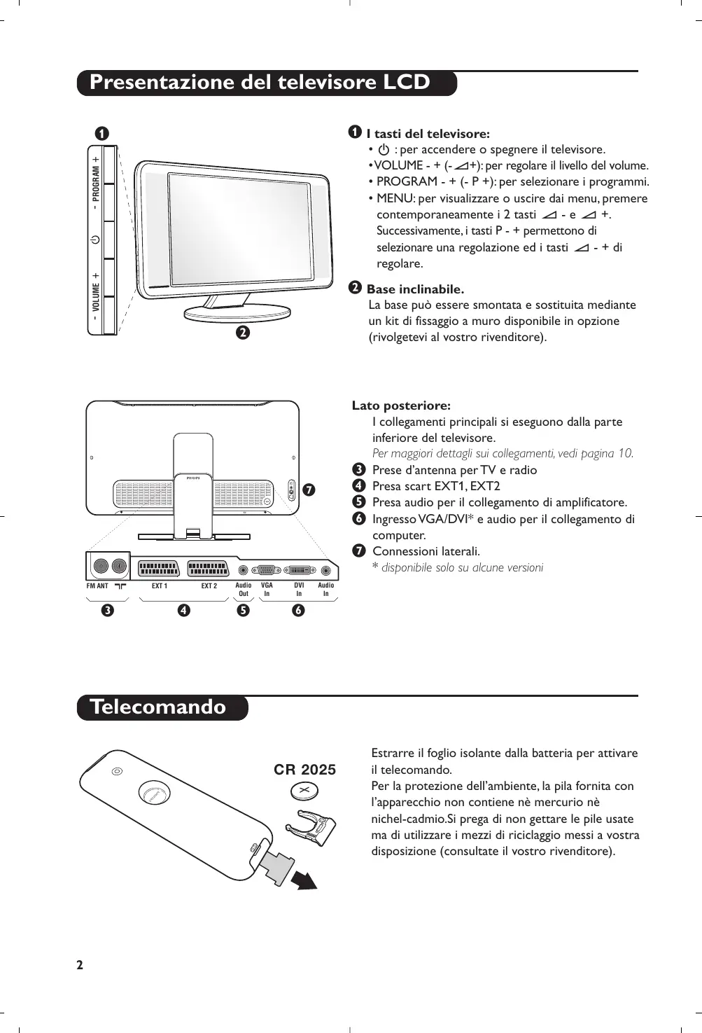 Lato posteriore: I collegamenti principali si eseguono dalla parte inferiore del televisore. Per maggiori dettagli sui collegamenti, vedi pagina 10. “ Prese d’antenna per TV e radio ‘ Presa scart EXT1, EXT2 ( Presa audio per il collegamento di amplificatore. § Ingresso VGA/DVI* e audio per il collegamento di computer. è Connessioni laterali.