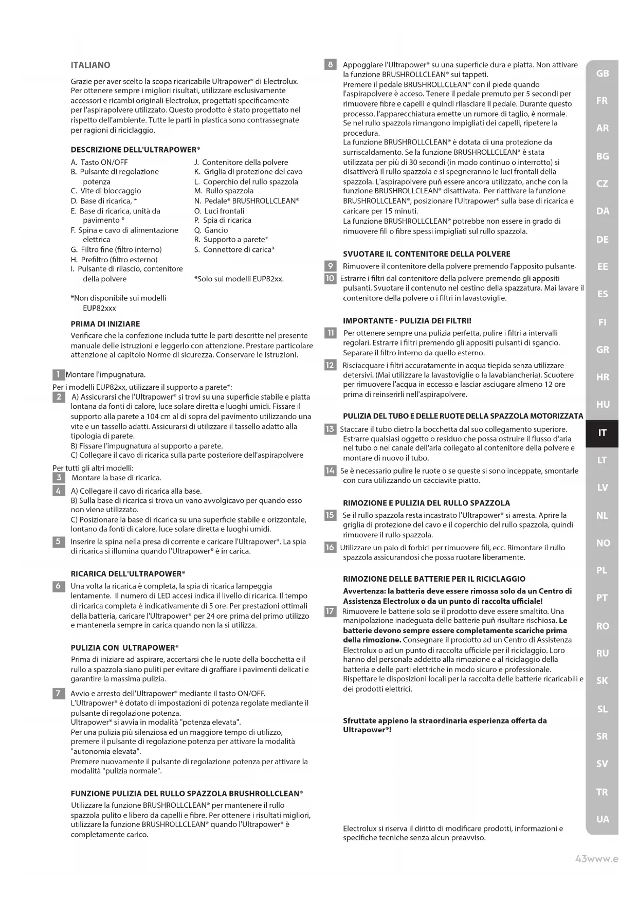 Electrolux si riserva il diritto di modicare prodotti, informazioni e speciche tecniche senza alcun preavviso. ITALIANO Grazie per aver scelto la scopa ricaricabile Ultrapower® di Electrolux. Per ottenere sempre i migliori risultati, utilizzare esclusivamente accessori e ricambi originali Electrolux, progettati specicamente per l'aspirapolvere utilizzato. Questo prodotto è stato progettato nel rispetto dell'ambiente. Tutte le parti in plastica sono contrassegnate per ragioni di riciclaggio. DESCRIZIONE DELL'ULTRAPOWER® A. Tasto ON/OFF B. Pulsante di regolazione potenza C. Vite di bloccaggio D. Base di ricarica, * E. Base di ricarica, unità da pavimento * F. Spina e cavo di alimentazione elettrica G. Filtro ne (ltro interno) H. Preltro (ltro esterno)