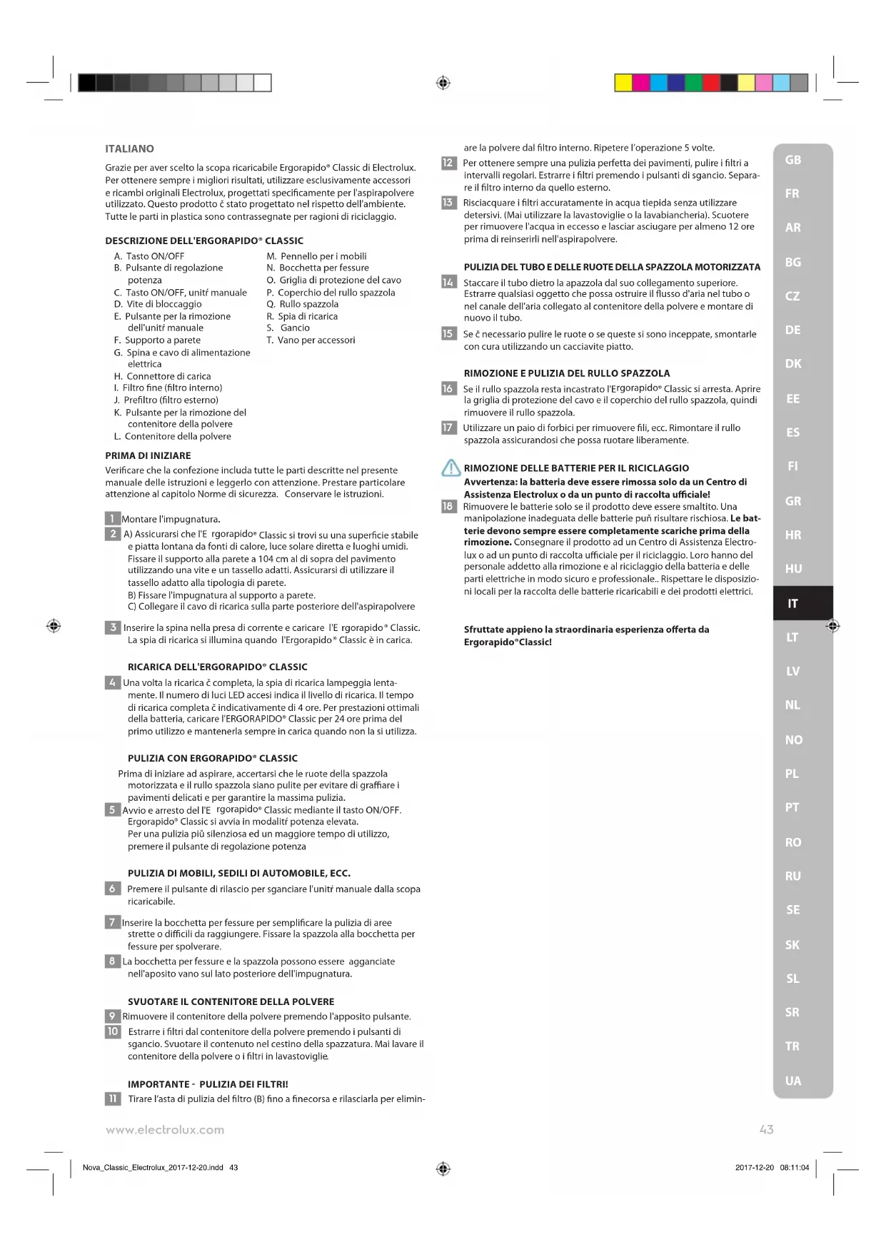 Nova_Classic_Electrolux_2017-12-20.indd 42 2017-12-20 08:11:04ITALIANO Grazie per aver scelto la scopa ricaricabile Ergorapido® Classic di Electrolux. Per ottenere sempre i migliori risultati, utilizzare esclusivamente accessori e ricambi originali Electrolux, progettati specicamente per l'aspirapolvere utilizzato. Questo prodotto č stato progettato nel rispetto dell'ambiente. Tutte le parti in plastica sono contrassegnate per ragioni di riciclaggio.