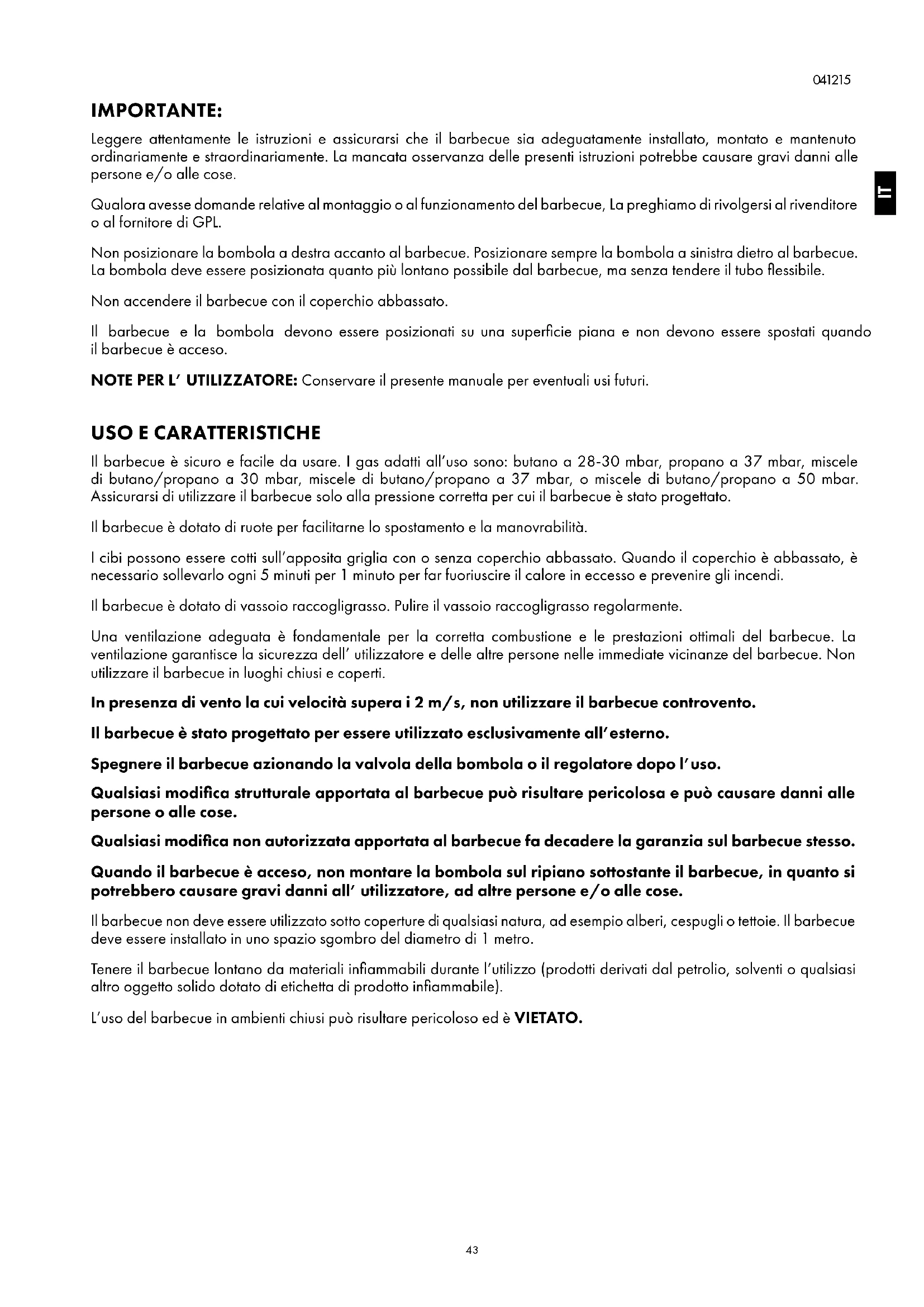 IMPORTANTE: Leggere attentamente le istruzioni e assicurarsi che il barbecue sia adeguatamente installato, montato e mantenuto ordinariamente e straordinariamente. La mancata osservanza delle presenti istruzioni potrebbe causare gravi danni alle persone e/o alle cose. Qualora avesse domande relative al montaggio o al funzionamento del barbecue, La preghiamo di rivolgersi al rivenditore o al fornitore di GPL. Non posizionare la bombola a destra accanto al barbecue. Posizionare sempre la bombola a sinistra dietro al barbecue. La bombola deve essere posizionata quanto più lontano possibile dal barbecue, ma senza tendere il tubo flessibile. Non accendere il barbecue con il coperchio abbassato. Il barbecue e la bombola devono essere posizionati su una superficie piana e non devono essere spostati quando ilbarbecue è acceso. NOTE PER L’ UTILIZZATORE: Conservare il presente manuale per eventuali usi futuri.