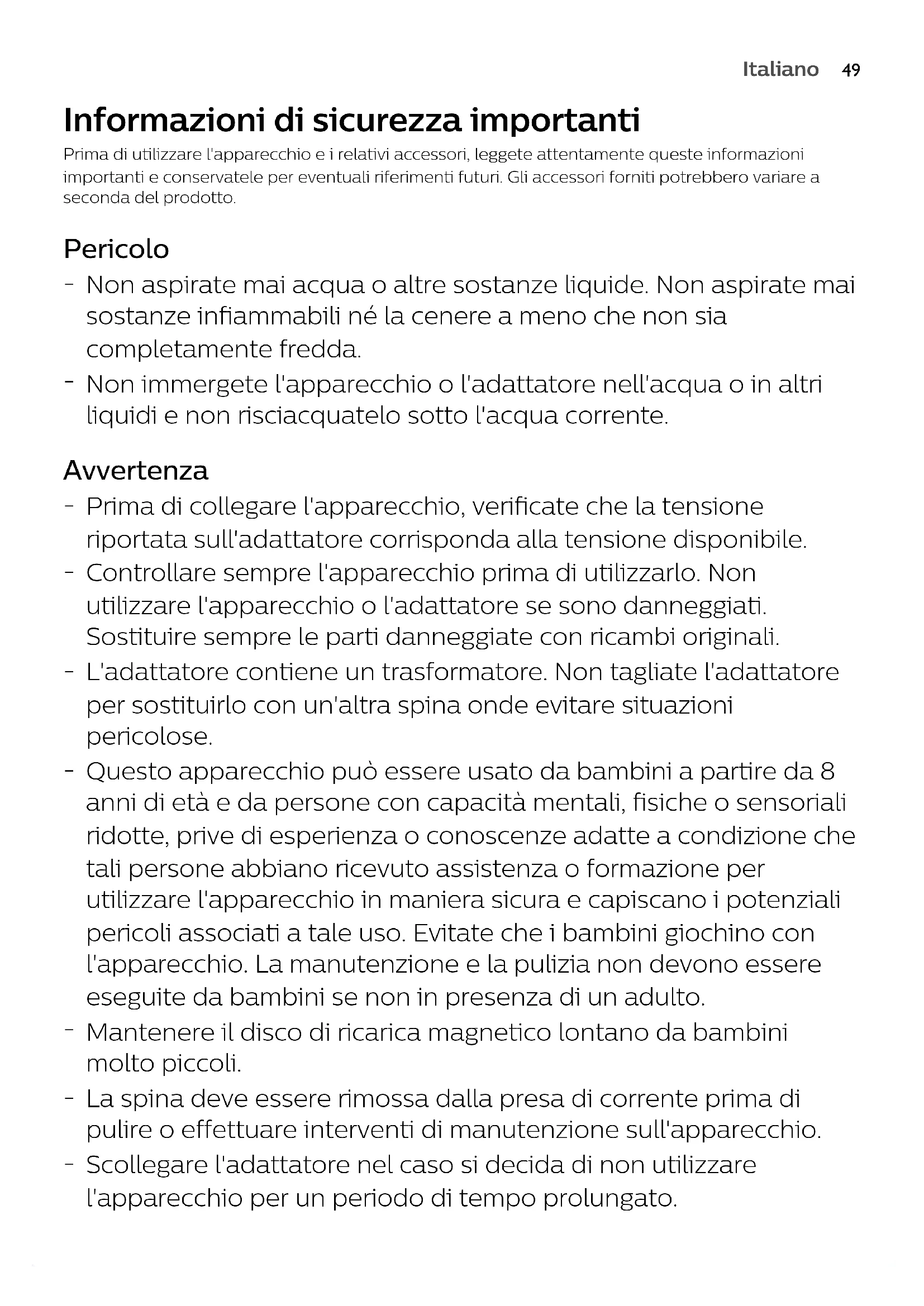 Non aspirate mai acqua o altre sostanze liquide. Non aspirate mai sostanze infiammabili né la cenere a meno che non sia completamente fredda.