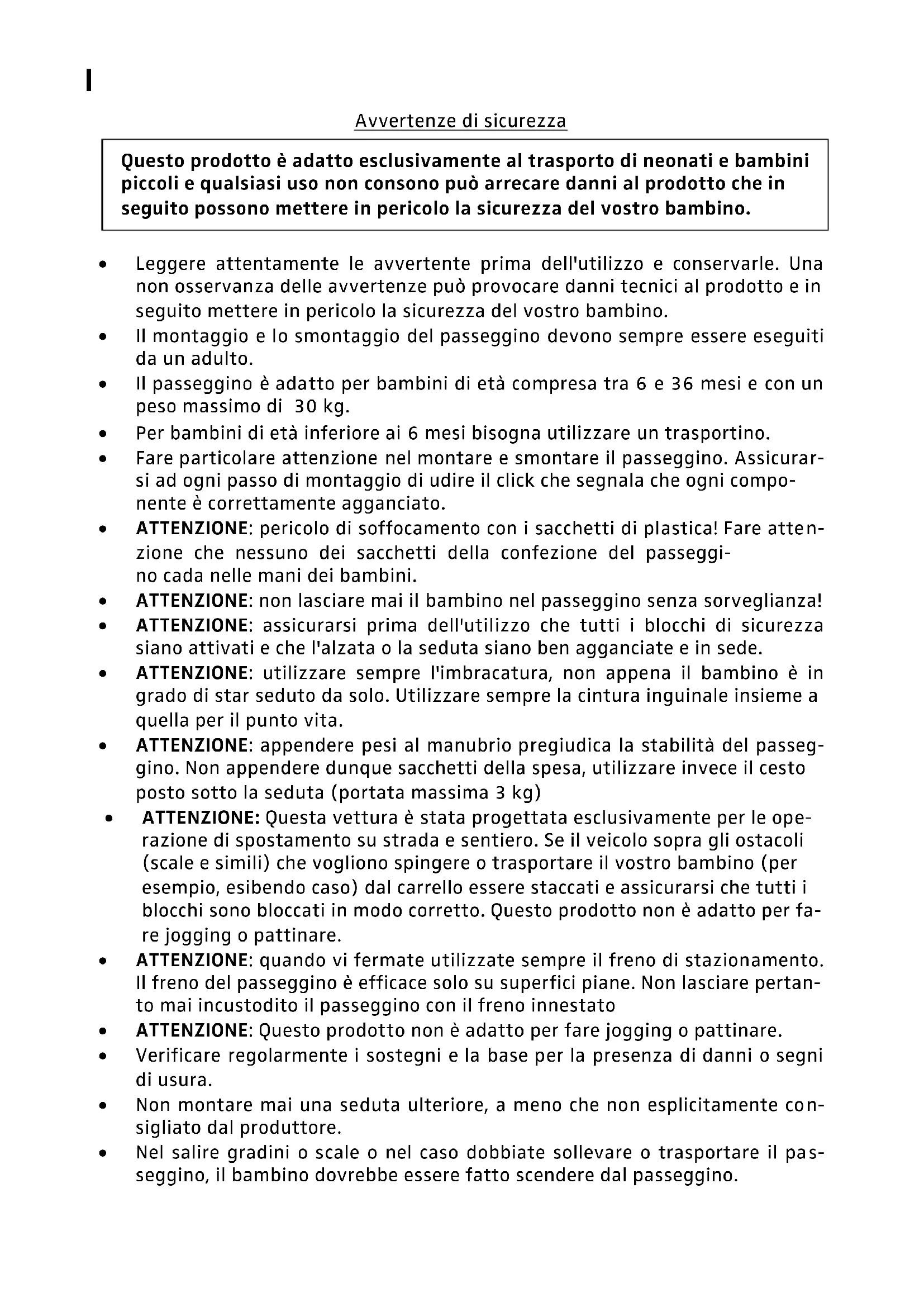 Leggere attentamente le avvertente prima dell'utilizzo e conservarle. Una non osservanza delle avvertenze può provocare danni tecnici al prodotto e in seguito mettere in pericolo la sicurezza del vostro bambino. Il montaggio e lo smontaggio del passeggino devono sempre essere eseguiti da un adulto. Il passeggino è adatto per bambini di età compresa tra 6 e 36 mesi e con un peso massimo di 30 kg. Per bambini di età inferiore ai 6 mesi bisogna utilizzare un trasportino. Fare particolare attenzione nel montare e smontare il passeggino. Assicurar- si ad ogni passo di montaggio di udire il click che segnala che ogni compo- nente è correttamente agganciato. ATTENZIONE: pericolo di soffocamento con i sacchetti di plastica! Fare atten- zione che nessuno dei sacchetti della confezione del passeggi- no cada nelle mani dei bambini. ATTENZIONE: non lasciare mai il bambino nel passeggino senza sorveglianza! ATTENZIONE: assicurarsi prima dell'utilizzo che tutti i blocchi di sicurezza siano attivati e che l'alzata o la seduta siano ben agganciate e in sede. ATTENZIONE: utilizzare sempre l'imbracatura, non appena il bambino è in grado di star seduto da solo. Utilizzare sempre la cintura inguinale insieme a quella per il punto vita. ATTENZIONE: appendere pesi al manubrio pregiudica la stabilità del passeg- gino. Non appendere dunque sacchetti della spesa, utilizzare invece il cesto posto sotto la seduta (portata massima 3 kg) ATTENZIONE: Questa vettura è stata progettata esclusivamente per le ope- razione di spostamento su strada e sentiero. Se il veicolo sopra gli ostacoli (scale e simili) che vogliono spingere o trasportare il vostro bambino (per esempio, esibendo caso) dal carrello essere staccati e assicurarsi che tutti i blocchi sono bloccati in modo corretto. Questo prodotto non è adatto per fa- re jogging o pattinare. ATTENZIONE: quando vi fermate utilizzate sempre il freno di stazionamento. Il freno del passeggino è efficace solo su superfici piane. Non lasciare pertan- to mai incustodito il passeggino con il freno innestato ATTENZIONE: Questo prodotto non è adatto per fare jogging o pattinare. Verificare regolarmente i sostegni e la base per la presenza di danni o segni di usura. Non montare mai una seduta ulteriore, a meno che non esplicitamente con- sigliato dal produttore. Nel salire gradini o scale o nel caso dobbiate sollevare o trasportare il pas- seggino, il bambino dovrebbe essere fatto scendere dal passeggino. Questo prodotto è adatto esclusivamente al trasporto di neonati e bambini piccoli e qualsiasi uso non consono può arrecare danni al prodotto che in seguito possono mettere in pericolo la sicurezza del vostro bambino. I Per quanto riguarda il carico sicuro del passeggino attenersi alle indicazioni del produttore oppure rivolgersi al proprio negozio specializzato. Conservare queste istruzioni per l'uso per tutto il tempo di utilizzo del pas- seggino e, nel caso il passeggino venga ceduto a altri, consegnate anche le istruzioni. Utilizzare soltanto le componenti originali o gli accessori espressamente consigliati dal produttore. Se il vostro passeggino dovesse disporre di un ulteriore freno di decelerazio- ne, quest'ultimo deve essere sempre impostato in modo da non bloccare la ruota frenata. Se il vostro passeggino è dotato di pneumatici, verificate regolarmente la pressione! (SUGGERIMENTO: premere leggermente con il pollice). La massima pressione d’aria consigliata viene indicata sulla ruota. SUGGERIMENTO: i pneumatici possono causare macchie indelebili su pavimenti in laminato, parquet e plastica! Cura e manutenzione del passeggino: Per le parti in tessuto estraibili e lavabili in base alle indicazioni del produttore seguire le istruzioni di lavaggio riportate nelle relative etichette. Per il lavaggio del rivestimento in tessuto, non utilizzare sostanze aggressive o abrasive, ma solo acqua saponata o uno detergente specifico per tessuti. Pulire anche le parti in plastica e il telaio con acqua saponata. Dopo aver utilizzato il passeggino con umidità e pioggia, pulire e asciugare accu- ratamente il telaio. Se il rivestimento di stoffa si bagna, appenderlo o stenderlo per farlo asciugare. Rimuovere regolarmente le ruote e trattare gli assi, i raccordi e le sospensioni con un olio privo di acidi (olio per macchine da cucire, WD40 o lubrificante privo di grassi). In questo modo il passeggino funzionerà agevolmente e senza rumori e i fenomeni di usura verranno ritardati. Evitare con una corretta manutenzione che il passeggino si ossidi, in quanto ciò non potrà costituire motivo di reclamo. ATTENZIONE: i materiali utilizzati sono soprattutto tessuti di poliestere o misto cotone, che rispettano le norme di legge vigenti. Se vengono sollecitate per un periodo prolungato (per esempio per un intenso irraggiamento solare), le fibre naturali possono perdere colore; ciò non costitui- sce tuttavia motivo di reclamo. Avvertenza importante: Adatto per un bambino con un peso massimo di ca. 15 kg. Leggere e conservare le istruzioni per l'uso! Conservare lo scontrino! Ci si riserva di apportare modifiche relativamente a quantità fornita, modifiche tecniche e varianti cliente-specifiche! I colori e la struttura del prodotto possono discostarsi dalle immagini mostrate. Conforme alla norma EN-1888 / 01.05.2012 Da 10.12.2012 IApertura: Disattivare il blocco di sicurezza (Ill.1a). Tirare la leva a spinta del tutto verso l'alto, cosicché il passeggino si apra completamente (Ill.1b). Montaggio / smontaggio dell'asse posteriore: Montaggio: infilare l'asse posteriore nel telaio (Ill.2a). Smontaggio: premere tutti e due i perni metallici di sicurezza nella parte interna (Ill.2b) e sollevare l'asse dal telaio. Montaggio / smontaggio delle ruote posteriori: Montaggio delle ruote posteriori: spingere la ruota sull'asse (Ill.3a). Smontaggio delle ruote posteriori: premere il pulsante di sblocco (Ill.3b) al centro della ruota e sollevare la ruota dall'asse. Montaggio / smontaggio delle ruote 
