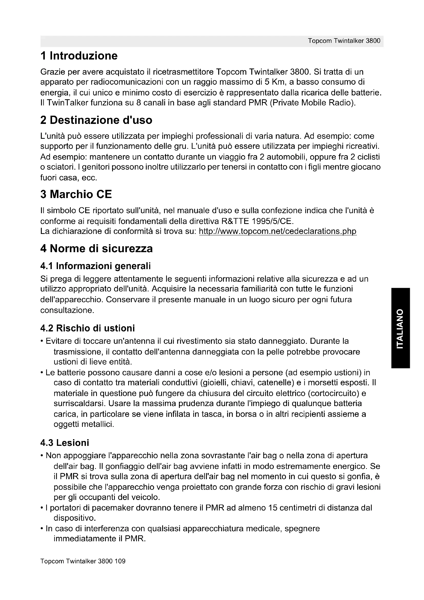 Takuu ei korvaa vääränlaisesta käsittelystä tai käytöstä johtuvia vaurioita eikä vaurioita, jotka johtuvat muiden kuin alkuperäisten tai Topcomin suosittelemien osien tai lisälaitteiden käytöstä. Takuu ei korvaa ulkopuolisten tekijöiden, kuten salama-, vesi- tai palovahinko, aiheuttamia vaurioita eikä kuljetuksen aikana aiheutuneita vaurioita. Takuu ei ole voimassa, jos laitteen sarjanumero on muutettu, poistettu tai tehty lukukelvottomaksi.Topcom Twintalker 3800 109 Topcom Twintalker 3800 ITALIANO 1 Introduzione Grazie per avere acquistato il ricetrasmettitore Topcom Twintalker 3800. Si tratta di un apparato per radiocomunicazioni con un raggio massimo di 5 Km, a basso consumo di energia, il cui unico e minimo costo di esercizio è rappresentato dalla ricarica delle batterie. Il TwinTalker funziona su 8 canali in base agli standard PMR (Private Mobile Radio). 2 Destinazione d'uso L'unità può essere utilizzata per impieghi professionali di varia natura. Ad esempio: come supporto per il funzionamento delle gru. L'unità può essere utilizzata per impieghi ricreativi. Ad esempio: mantenere un contatto durante un viaggio fra 2 automobili, oppure fra 2 ciclisti o sciatori. I genitori possono inoltre utilizzarlo per tenersi in contatto con i figli mentre giocano fuori casa, ecc. 3 Marchio CE Il simbolo CE riportato sull'unità, nel manuale d'uso e sulla confezione indica che l'unità è conforme ai requisiti fondamentali della direttiva R&TTE 1995/5/CE. La dichiarazione di conformità si trova su: http://www.topcom.net/cedeclarations.php 4 Norme di sicurezza