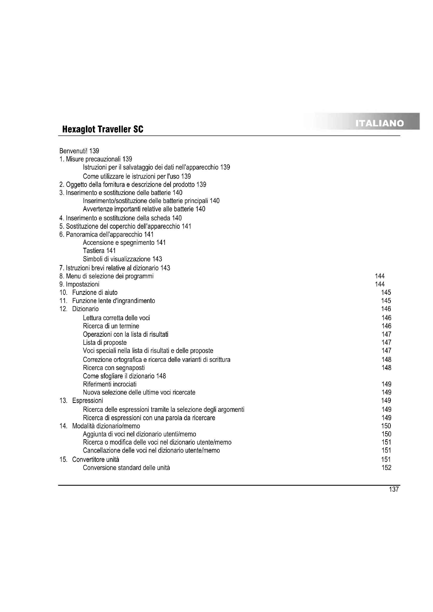 ITALIANO Benvenuti! Grazie per avere scelto Hexaglot Traveller SC. Vi preghiamo di dedicare alcuni minuti alla lettura attenta e completa delle presenti istruzioni per l'uso prima di iniziare a usare il prodotto, in modo da apprendere tutte le funzioni dell'apparecchio e sfruttare a pieno le sue potenzialità. Conservare le istruzioni per l'uso in un luogo sicuro per riferimento futuro. Hexaglot vi augura buon divertimento con Hexaglot Traveller SC!