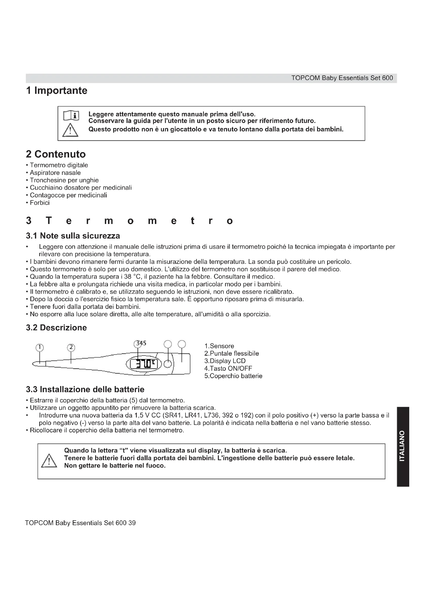Quando la lettera “t” viene visualizzata sul display, la batteria è scarica. Tenere le batterie fuori dalla portata dei bambini. L'ingestione delle batterie può essere letale. Non gettare le batterie nel fuoco. Baby Essentials Set 600.book Page 39 Friday, June 26, 2009 1:19 PMTOPCOM Baby Essentials Set 600 40 TOPCOM Baby Essentials Set 600