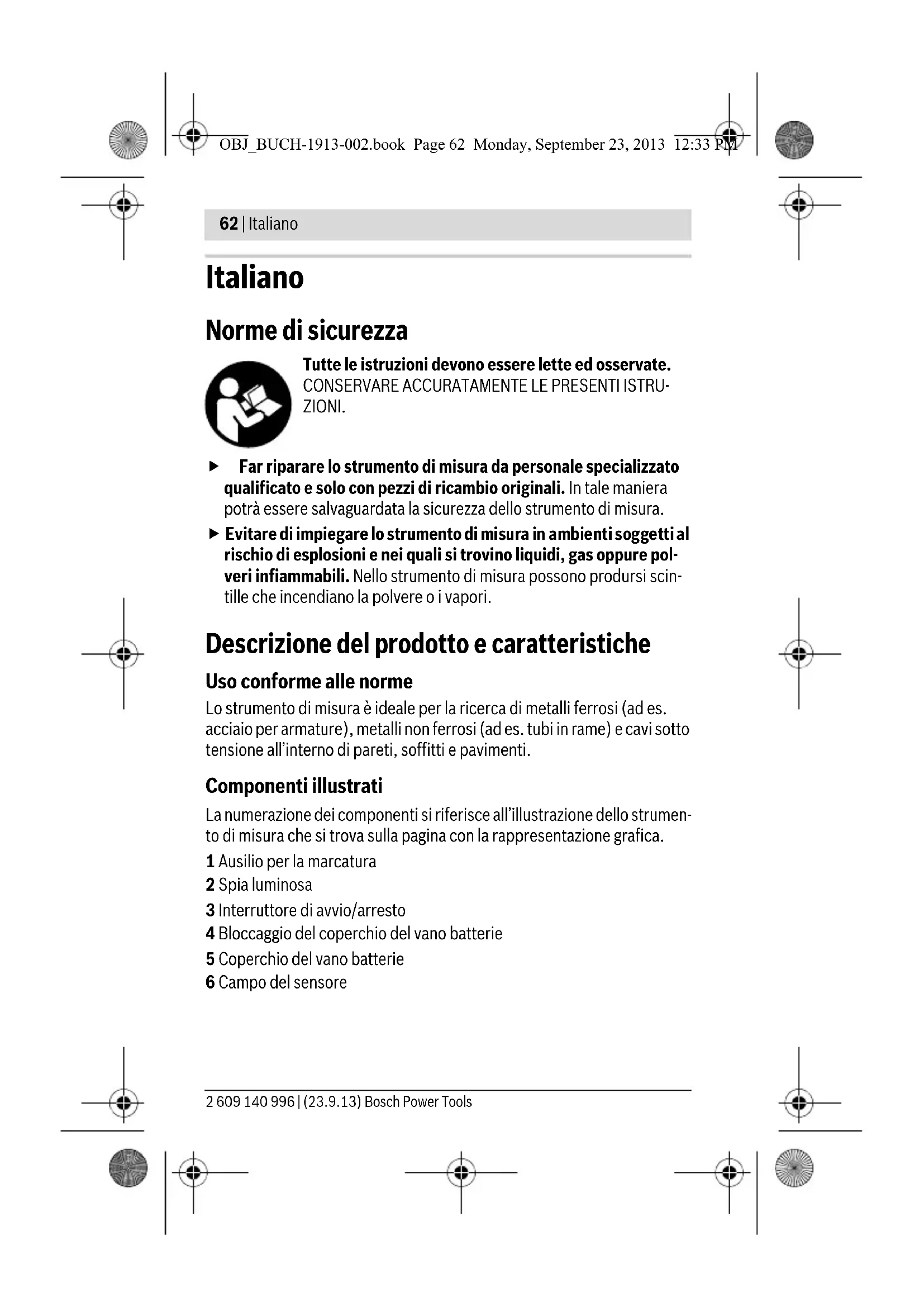 - in base al materiale e alla dimensione degli oggetti, oltre al materiale e alle condizioni del fondo (pareti, soffitti, pavimenti) ** ridotta profondità di localizzazione in caso di cavi non conduttori di tensione Un fondo con caratteristiche sfavorevoli può compromettere la precisione e la profondità di localizzazione del risultato di misurazione. Henk Becker Executive Vice President Engineering Helmut Heinzelmann Head of Product Certification PT/ETM9 OBJ_BUCH-1913-002.book Page 63 Monday, September 23, 2013 12:33 PM64 | Italiano 2 609 140 996 | (23.9.13) Bosch Power Tools Robert Bosch GmbH, Power Tools Division D-70745 Leinfelden-Echterdingen Leinfelden, 26.08.2013 Montaggio Applicazione/sostituzione delle batterie Per l’impiego dello strumento di misura si raccomanda di utilizzare batte- rie alcaline al manganese. Per aprire il coperchio del vano batterie 5 premere sul bloccaggio 4 ed sol- levare il coperchio del vano batterie. Inserire le batterie, facendo attenzio- ne alla corretta polarizzazione, conformemente all’illustrazione riportata sul lato interno del vano batterie. Se lo strumento di misura non viene impiegato per lunghi periodi, prelevare le batterie dallo strumento stesso. Un immagazzinaggio prolungato può comportare la corrosione o l’autoscaricamento delle batterie. Uso Messa in funzione Proteggere lo strumento di misura da liquidi e dall’esposizione di- retta ai raggi solari. Non esporre mai lo strumento di misura a temperature oppure a sbalzi di temperatura estremi. P.es. non lasciarlo per lungo tempo in macchina. In caso di elevati sbalzi di temperatura lasciare adattare alla temperatura ambientale lo strumento di misura prima di metterlo in funzione. Temperature oppure sbalzi di temperatura estremi possono pregiudicare la precisione dello strumento di misura. Evitare forti colpi e cadute dello strumento di misura. Accensione/spegnimento Prima di mettere in funzione lo strumento di misura accertarsi che il campo del sensore 6 non sia umido. In tal caso si consiglia di utiliz- zare un panno di stoffa per asciugare lo strumento. Per accendere lo strumento di misura, premere verso il basso l’interruttore di avvio/arresto 3. OBJ_BUCH-1913-002.book Page 64 Monday, September 23, 2013 12:33 PMItaliano | 65 Bosch Power Tools 2 609 140 996 | (23.9.13) Dopo un breve auto-test, lo strumento di misura sarà pronto all’uso. L’operatività dello strumento verrà indicata dall’illuminazione della spia di segnalazione 2. Se dopo l’accensione la spia di segnalazione 2 non si illu- mina, occorre sostituire le batterie. Per spegnere lo strumento di misura, premere verso l’alto l’in- terruttore di avvio/arresto 3. Se entro ca. 10 minuti non avviene alcuna misurazione, lo strumento di misura si spegne automaticamente per proteggere le batterie. Nota bene: Se lo strumento di misura si è spento automaticamente, l’in- terruttore di avvio/arresto 3 si troverà ancora in posizione «ON». Per riac- cendere lo strumento di misura, premere l’interruttore di avvio/arresto 3 dapprima in posizione «OFF», quindi nuovamente in posizione «ON». Modi operativi Lo strumento di misura rileva oggetti che si trovano al di sotto del campo del sensore 6. Prima di praticare fori, intagli o fresature nella parete, informarsi da ulteriori fonti riguardo ai possibili pericoli. Poiché influssi ambientali o le caratteristiche della parete possono ridurre la precisione e la profon- dità di localizzazione dello strumento di misura, può esservi rischio che nel raggio d’azione del sensore si trovino oggetti, sebbene il display non ne indichi la presenza (spia di segnalazione 2 accesa con luce verde). Spia di segnalazione Spiegazione Verde Nessun oggetto localizzato Giallo – Oggetto metallico in prossimità del sen- sore – Oggetto metallico piccolo o in profondità nel raggio d’azione del sensore, oppure – Cattive prestazioni del sensore a causa di caratteristiche sfavorevoli della parete Luce rossa e segnale acu- stico continuo Localizzato oggetto metallico nel raggio d’azione del sensore Luce rossa lampeggiante (lampeggio veloce) e se- quenza di segnali acustici ad impulsi Localizzato cavo sotto tensione OBJ_BUCH-1913-002.book Page 65 Monday, September 23, 2013 12:33 PM66 | Italiano 2 609 140 996 | (23.9.13) Bosch Power Tools Rilevazione di oggetti metallici Dopo l’accensione la spia luminosa 2 è illuminata in verde. Applicare lo strumento di misura sulla superficie da esaminare e spostarlo in direzione laterale. – Se nel fondo non è localizzabile alcun oggetto metallico, la spia di se- gnalazione 2 resterà accesa con luce verde e non verrà emesso alcun segnale acustico. – Se lo strumento di misura si avvicina ad un oggetto metallico, la spia di segnalazione 2 si accende dapprima con luce gialla e, all’avvicinarsi dell’oggetto metallico, passa a luce rossa. Quando la spia di segnalazio- ne passa a luce rossa, viene inoltre emesso un segnale acustico, la cui altezza di tonalità aumenta all’avvicinarsi dell’oggetto metallico. – Quando lo strumento si trova sopra un oggetto metallico, la spia di se- gnalazione 2 si accende con luce rossa e viene emesso un segnale acu- stico con altezza di tonalità massima. Anche quando la spia di segnalazione 2 è accesa con colore giallo, un oggetto metallico potrebbe trovarsi sotto il raggio d’azione del sensore. Oggetti metallici piccoli o in profondità si trovano in prossimi- tà del sensore, oppure le caratteristiche della parete compromettono il risultato di misurazione. Al primo passaggio sopra l’oggetto metallico, la sua po- sizione verrà indicata in modo approssimativo. Pas- sando più volte lo strumento di misura sopra l’oggetto metallico, l’oggetto verrà localizzato in modo sempre più preciso. Dopo ripetuti passaggi sopra l’oggetto (senza sollevare lo strumento di misura dal fondo), la posizione dell’oggetto metallico sarà visualizzabile con precisione: quando la spia di segnalazione 2 s