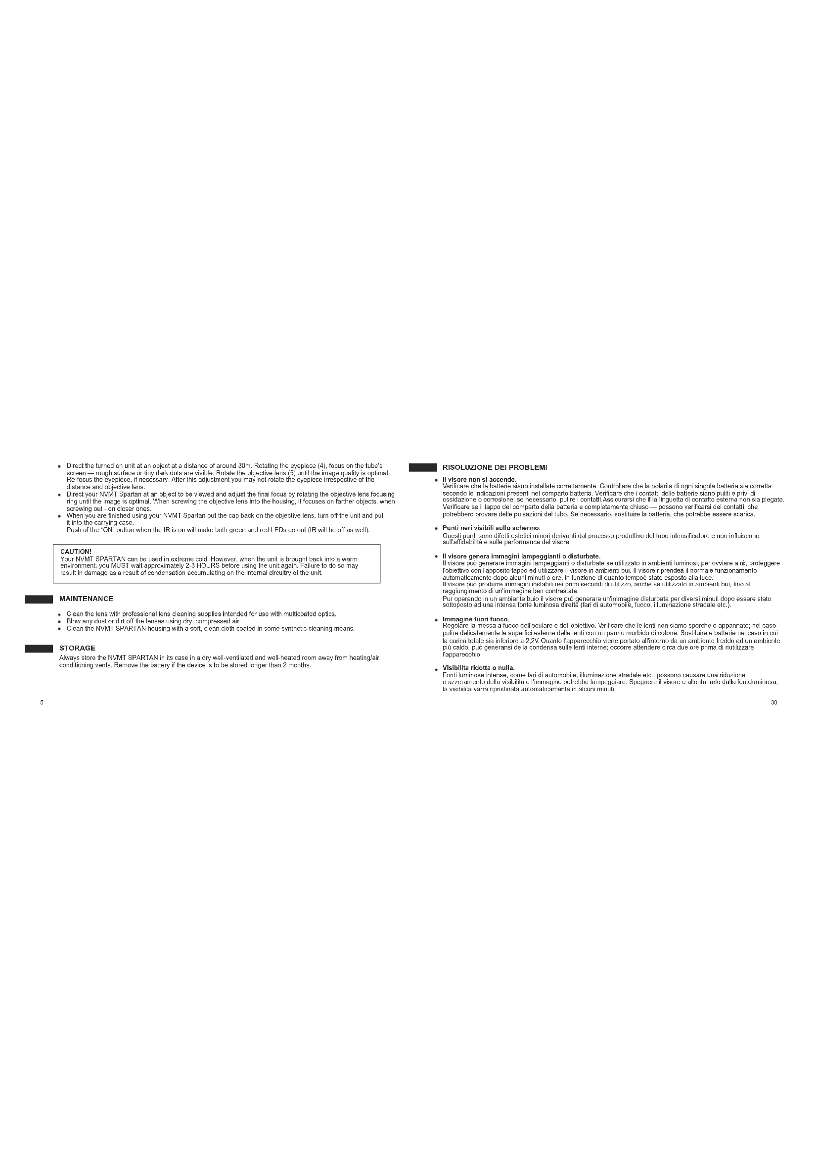ATTENZIONE! Il vostro visore NVMT Spartan può essere utilizzato in ambienti estremamente freddi. Tuttavia, quando l'apparecchio e riportato in ambienti caldi, occorre aspettare approssimativamente 2-3 ore prima di riutilizzarlo. Il non rispetto di questa avvertenza puo causare il danneggiamento del visore causato dalla condensa accumulata nei circuiti interni del visore. Pulire le lenti con detergente specifico per ottiche con trattamenti multipli. Togliere la polvere o lo sporco dalle lenti usando aria compressa, secca. Pulire il corpo dell'NVMT SPARTAN con uno pulire il corpo dello NVMT SPARTAN con un panno pulito e morbido. MANUTENZIONE CONSERVAZIONE The scope will not turn on... Check that the battery is installed properly. Install the battery according to the (+) and (-) polarity, ensuring that the markings on the battery and battery compartment correspond with one another. Check the battery contact to ensure it is clean and free of corrosion; if necessary, clean the contact. Make sure that the external contact lug is not bent. If necessary, replace the battery as it may be depleted. Also, be sure that the power is in the “ON” position when trying to turn on the scope. Distinct black dots appear on the screen... These dots are minor cosmetic blemishes resulting from tube production processes and do not interfere with the reliability or performance of the scope. The scope flickers, flashes or “snows”... The scope may flicker or flash when used in a bright environment; to correct this, place the cap over the objective lens and enter a dark environment. The scope will restore itself to a natural functioning state in several minutes or hours, depending on how long the scope had been exposed to the light. The scope may flicker for the first several seconds of use, even when in a dark environment, before the scope corrects itself and functions properly. The scope may “snow” for several minutes after being exposed to a bright light source (daylight, a car's headlights, fire, etc.) even if being operated in complete darkness. The image is not focused... Adjust the focus of the eyepiece and the objective (see Use and Testing). Check that the lenses are not foggy or dusty; if they are, carefully clean the external surfaces of lenses with a soft cotton fabric. Replace the battery if the total battery charge is less than 2.0 V. When the unit is brought into a warm environment from a cold one, condensation may appear on the internal lenses; you must wait two hours before using the unit. Visibility decreases or disappears... Bright light sources, such as headlights, may cause visibility to decrease or disappear and the image to flicker. Turn the power off and turn the scope away from the light source; visibility will restore itself in several minutes. Attivare l'apparecchio premendo il tasto ON (3). Puntare l'apparecchio acceso verso un oggetto ad una distanza di circa 30m. Ruotare l'oculare (4), mettere a fuoco sullo schermo del tubo — e visibile una superficie irregolare o dei piccoli punti neri. Ruotare la lente frontale finche la qualita dell'immagine e soddisfacente. Correggere la messa a fuoco dell'oculare, se necessario. Dopo questa regolazione potrebbe non essere necessario ruotare l'oculare al variare della distanza. Puntare il NVMT SPARTAN su un oggetto e regolare la messa a fuoco finale, ruotando la lente frontale fino ad ottenere una immagine nitida. Ruotando la lente dell'obiettivo verso il corpo si mettono a fuoco oggetti lontani, ruotandola in direzione opposta si mettono a fuoco oggetti piu vicini. Dopo l'uso, riposizionare il coprilente, spegnere l'apparecchio e riporre l'apparecchio nella sua custodia. La pressione del tasto “ON” quando l'illuminatore IR è acceso fa spegnare sia il led rosso che quello verde (anche l'IR si spegne). Conservare sempre il NVMT SPARTAN il suo caschetto nella custodia, in un luogo asciutto e ben ventilato, lontano da fonti di calore o da condizionatori d'aria. Togliere la batteria qualora si preveda un tempo di inutilizzo superiore a due mesi.28 Se il soggetto da riprendere si trova in ambiente completamente buio o in zona in ombra, attivare l'illuminatore ad infrarossi premendo il tasto IR (2) situato accanto al tasto ON.
