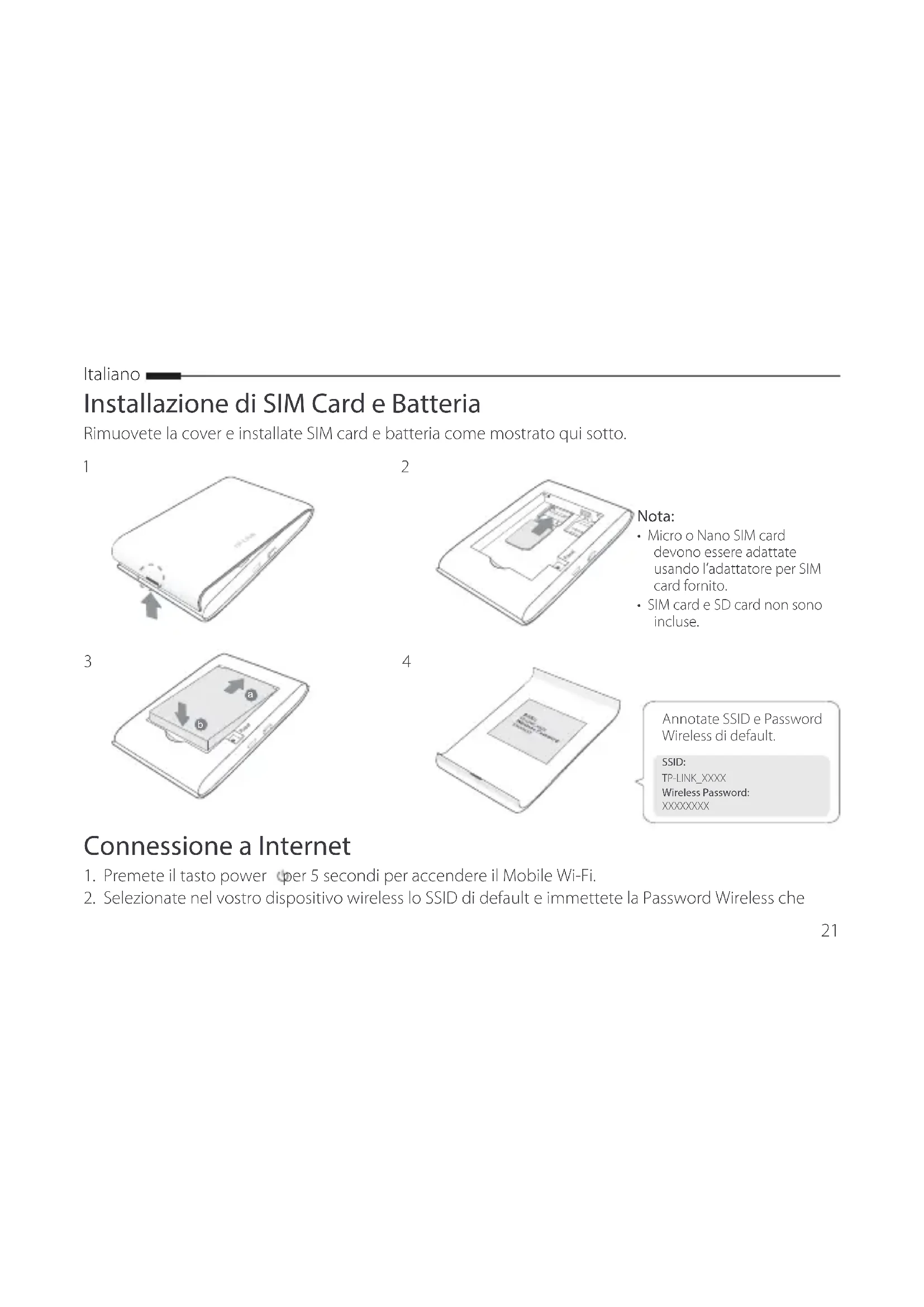 - SIM card e SD card non sono incluse. SSID:TP-LINK_XXXXWireless Password: XXXXXXXX22 Italiano avete annotato. Nota: Si consiglia di modicare nome wireless e password di default per la sicurezza della rete. Fatto! Nota: