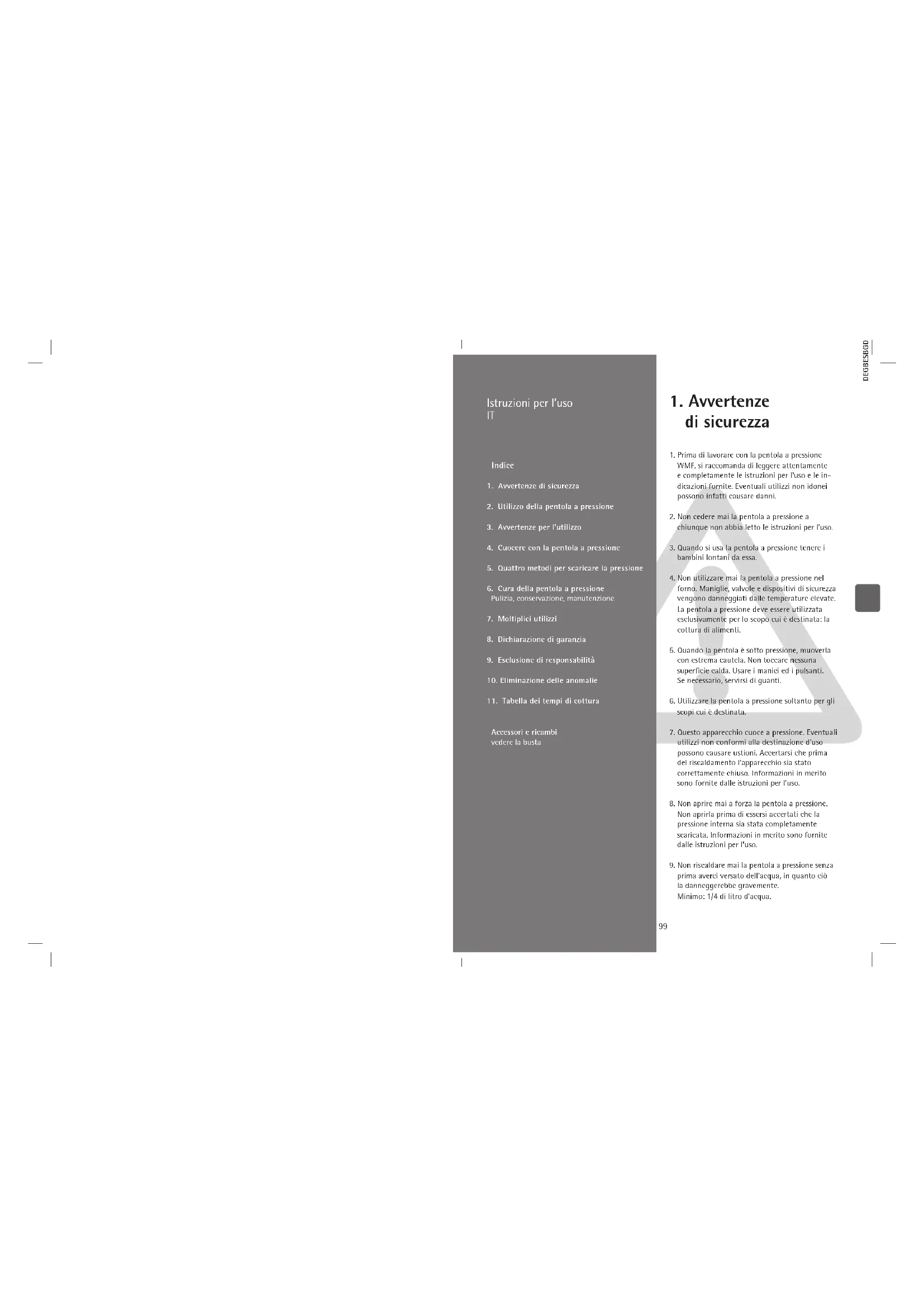 di danneggiamento o deformazione della stessa o di una delle sue parti, oppure in caso di funzionamento non conforme a quanto riportato nelle istruzioni per l’uso. In questo caso rivolgersi al negozio specializzato WMF più vicino o al servizio clienti del WMF Group GmbH. Si raccomanda di conservare accuratamente le presenti istruzioni per l’uso.103 DEGBESBGDKFIFRGRITNLNOPLPTRUSESKSICZTRHUHR non deve essere più visibile nemmeno l’anello di pressione giallo. Se l’anello giallo rimane visibile (K), il dispositivo di sicurezza pressione residua è scattato. Per sbloc- carlo, spingere brevemente il cursore (7) sulla posizione ZU/LOCKED. Se il vapore non fuoriesce più, scuotere breve- mente la pentola. In questo modo si distaccano infatti dai cibi eventuali bolle di vapore presenti soprattutto nel caso di alimenti liquidi e pastosi e che, a coperchio tolto, possono essere spruzzate fuori. A questo punto girare verso destra il manico del coperchio come illustrato ed aprire la pentola. 4.6. Avvertenza per i piani di cottura a induzione Il fondo universale TransTherm® (11) è indicato per tutti i tipi di piani di cottura, anche per quelli a induzione. Per i piani di cottura a induzione, ai livelli di cottura alti si può percepire un ronzio. Questo rumore è determinato da cause tecniche e non indica un difetto del fornello o della pentola a pressione. La misura della pentola e del piano di cottura de- vono coincidere, in quanto altrimenti – soprattutto per i diametri ridotti – è possibile che il piano di cottura (campo magnetico) non reagisca al fondo della pentola