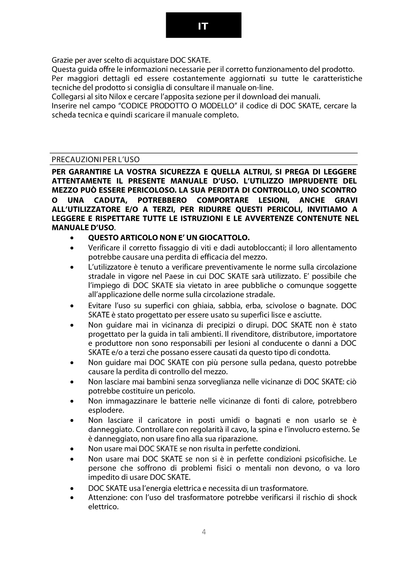Grazie per aver scelto di acquistare DOC SKATE. Questa guida offre le informazioni necessarie per il corretto funzionamento del prodotto. Per maggiori dettagli ed essere costantemente aggiornati su tutte le caratteristiche tecniche del prodotto si consiglia di consultare il manuale on-line. Collegarsi al sito Nilox e cercare l’apposita sezione per il download dei manuali. Inserire nel campo “CODICE PRODOTTO O MODELLO” il codice di DOC SKATE, cercare la scheda tecnica e quindi scaricare il manuale completo.