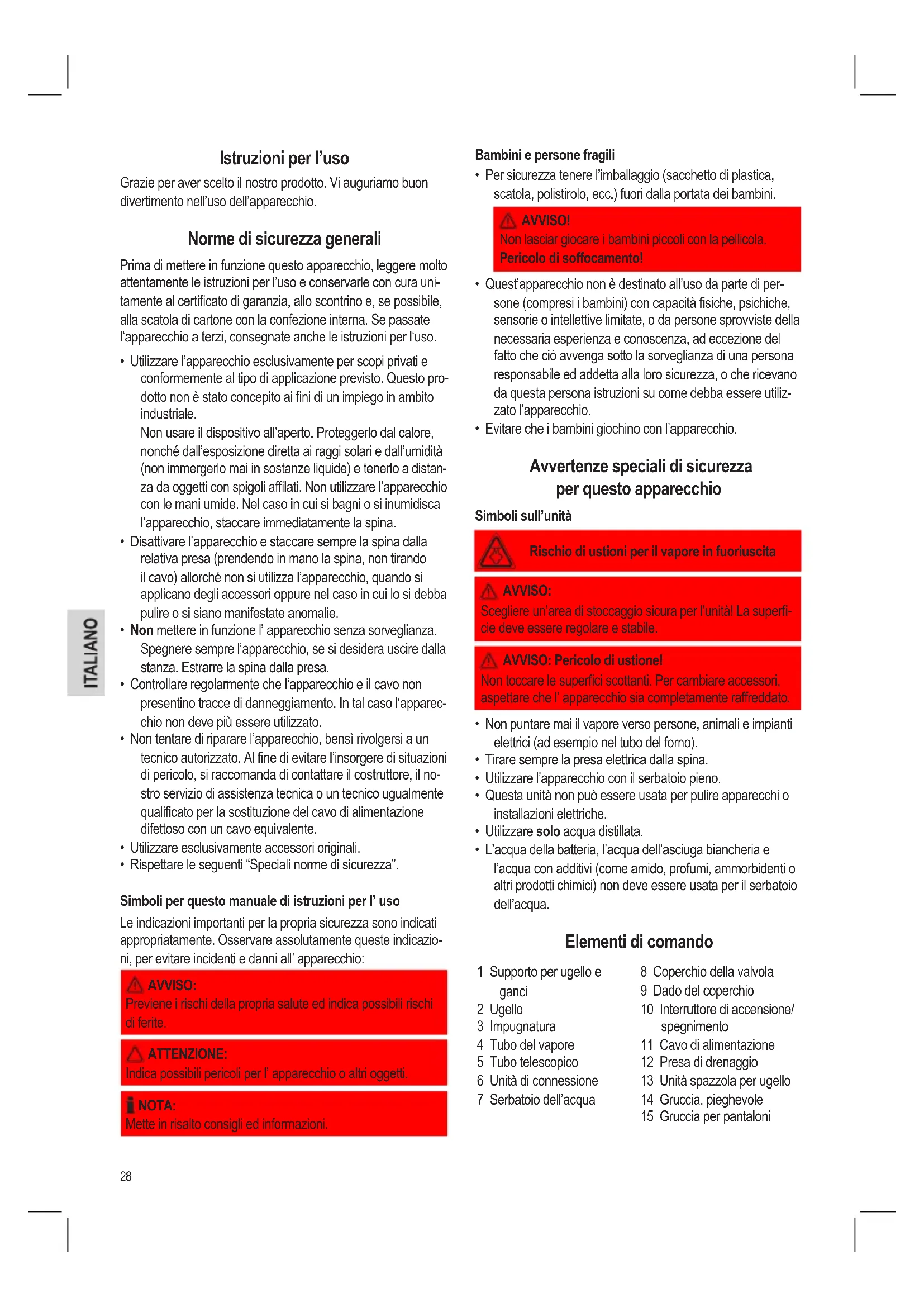 - Evitare che i bambini giochino con l’apparecchio. Avvertenze speciali di sicurezza per questo apparecchio Simboli sull’unità Rischio di ustioni per il vapore in fuoriuscita AVVISO: Scegliere un’area di stoccaggio sicura per l’unità! La super- cie deve essere regolare e stabile. AVVISO: Pericolo di ustione! Non toccare le superci scottanti. Per cambiare accessori, aspettare che l’ apparecchio sia completamente raffreddato.