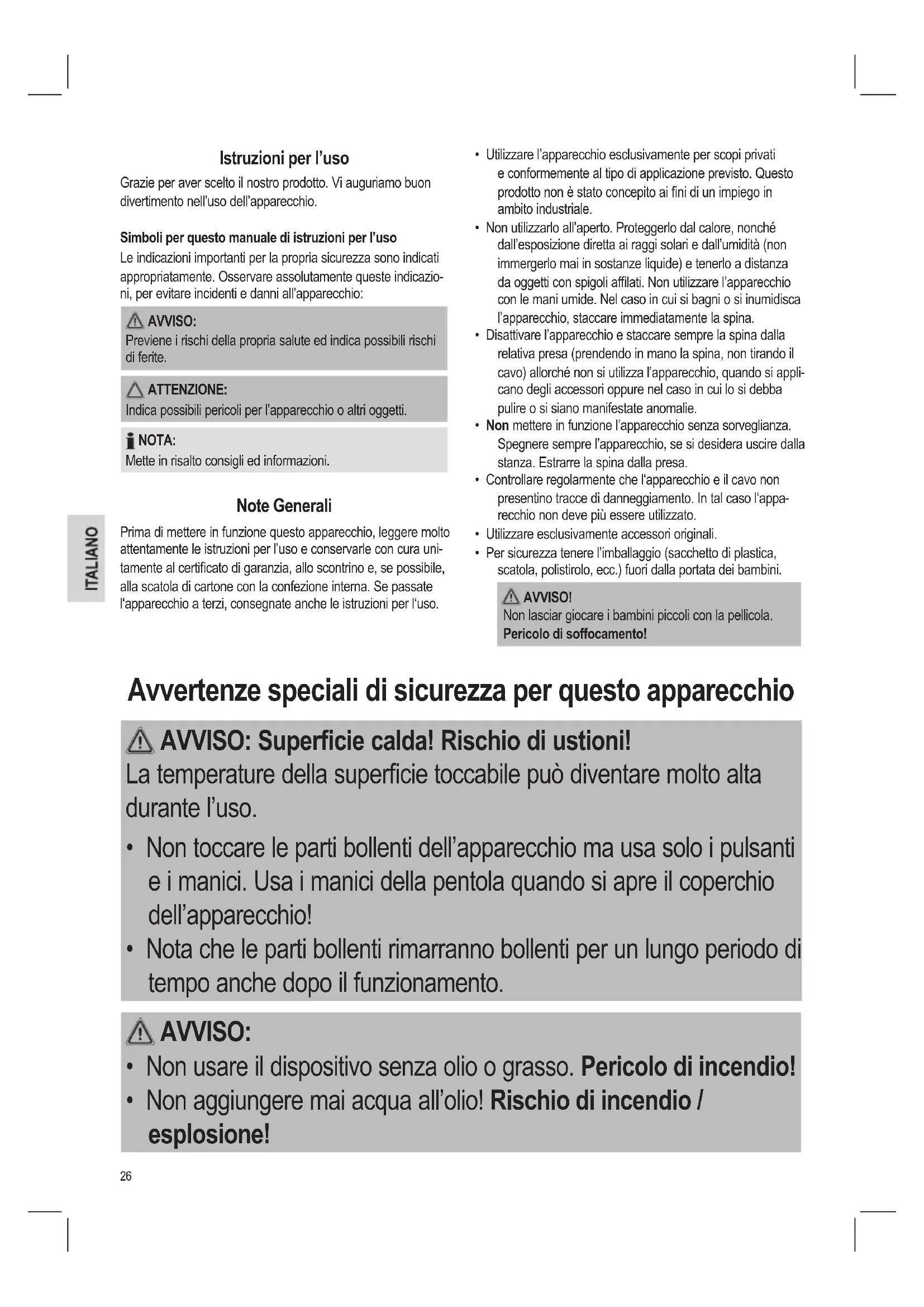 - Non toccare le parti bollenti dell'apparecchio ma usa solo i pulsanti e i manici. Usa i manici della pentola quando si apre il coperchio dell'apparecchio!