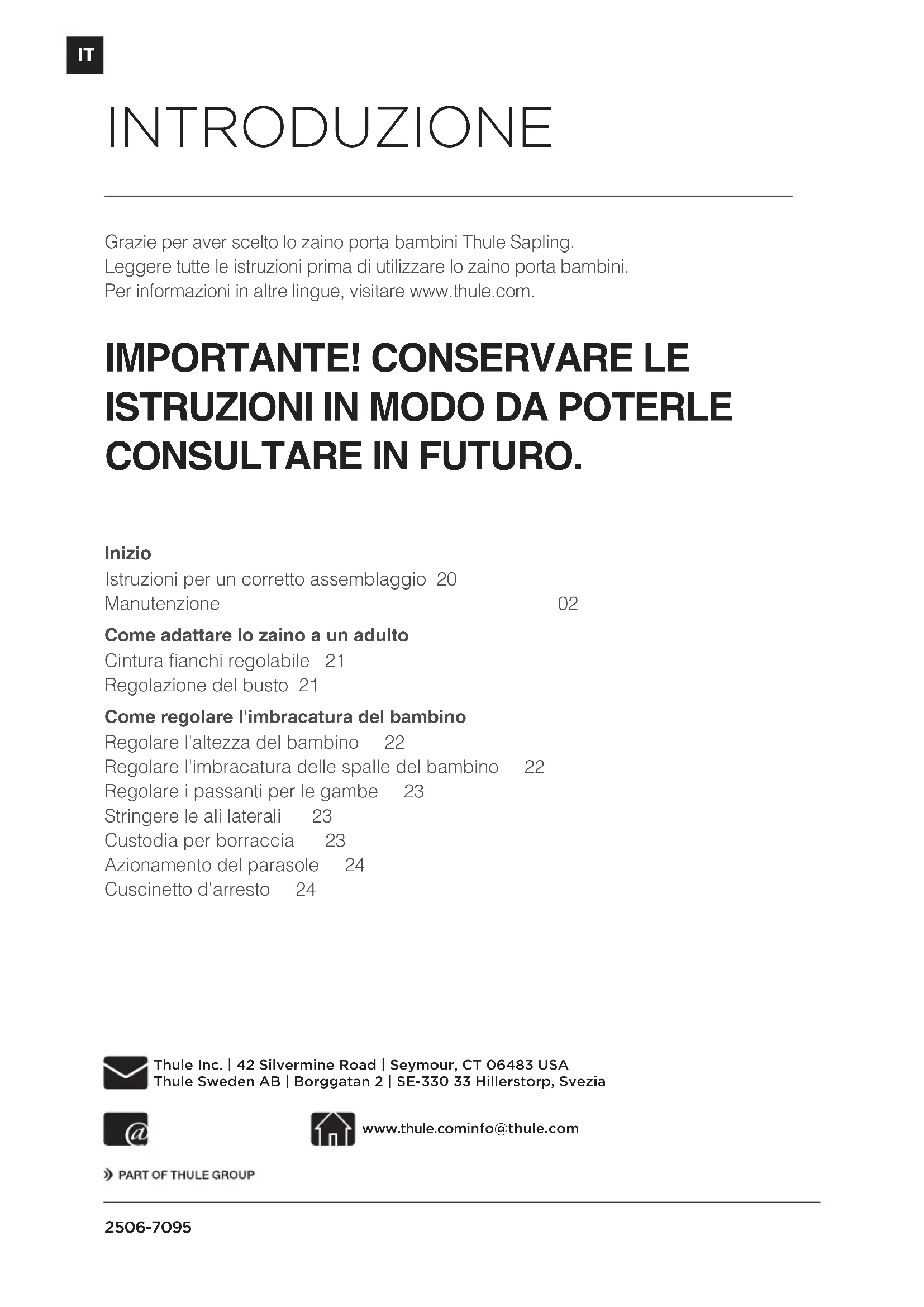 CONSULTARE IN FUTURO. Inizio Istruzioni per un corretto assemblaggio 20 Manutenzione 02 Come adattare lo zaino a un adulto Cintura fianchi regolabile 21 Regolazione del busto 21 Come regolare l'imbracatura del bambino Regolare l'altezza del bambino 22 Regolare l'imbracatura delle spalle del bambino 22 Regolare i passanti per le gambe 23 Stringere le ali laterali 23 Custodia per borraccia 23 Azionamento del parasole 24 Cuscinetto d'arresto 24 INTRODUZIONEIT 3506-7095 AVVERTENZA Rischio di caduta o strangolamento. Per un utilizzo sicuro, il bambino deve essere in grado di sedere dritto senza assistenza e pesare almeno 7,3 kg. Non lasciare il bambino incustodito all'interno dello zaino. Non collocare lo zaino porta bambini su ripiani, tavoli o altre superfici rialzate. All'interno dello zaino il bambino potrebbe trovarsi in una posizione più elevata rispetto a quella dell'adulto. Fare attenzione a rischi come quelli rappresentati da rami, telai delle porte, ecc. Prima di ogni utilizzo, controllare che tutte le fibbie, le cinghie e i supporti siano fissati e regolati in base alle istruzioni. Prima di ogni utilizzo, per evitare ferite serie derivate da cadute o scivolamenti usare sempre il sistema di sicurezza per il bambino e assicurarsi che sia regolato e allacciato in base alle istruzioni. Quando utilizza lo zaino porta bambini, l'adulto deve sapere che: - L'equilibrio potrebbe subire delle variazioni dovute ai movimenti del bambino e dell'adulto. - È necessario prestare grande attenzione quando ci si piega, ci si china inavanti o si compiono movimenti improvvisi. - Lo zaino può essere utilizzato durante lo svolgimento di attività ricreative ma non di quelle sportive. - Lo zaino deve essere infilato o rimosso con attenzione. Per quanto riguarda tutte le fibbie, assicurarsi di udire un clic quando la fibbia viene agganciata e tirarla per essere certi che sia stata collegata correttamente. Massimo carico: 22 kg (peso combinato di bambino e attrezzatura). All'interno dello zaino il bambino potrebbe stancarsi; è consigliabile fare frequenti pause. All'interno dello zaino, il bambino potrebbe risentire degli effetti delle condizioni meteorologiche e climatiche prima dell'adulto che lo trasporta. È necessario porre particolare attenzione per evitare di procurare ferite aipiedi del bambino quando lo zaino si trova sul o vicino al suolo. Le parti aggiuntive o sostitutive devono provenire esclusivamente daThuleInc/Sweden AB.4 506-7095