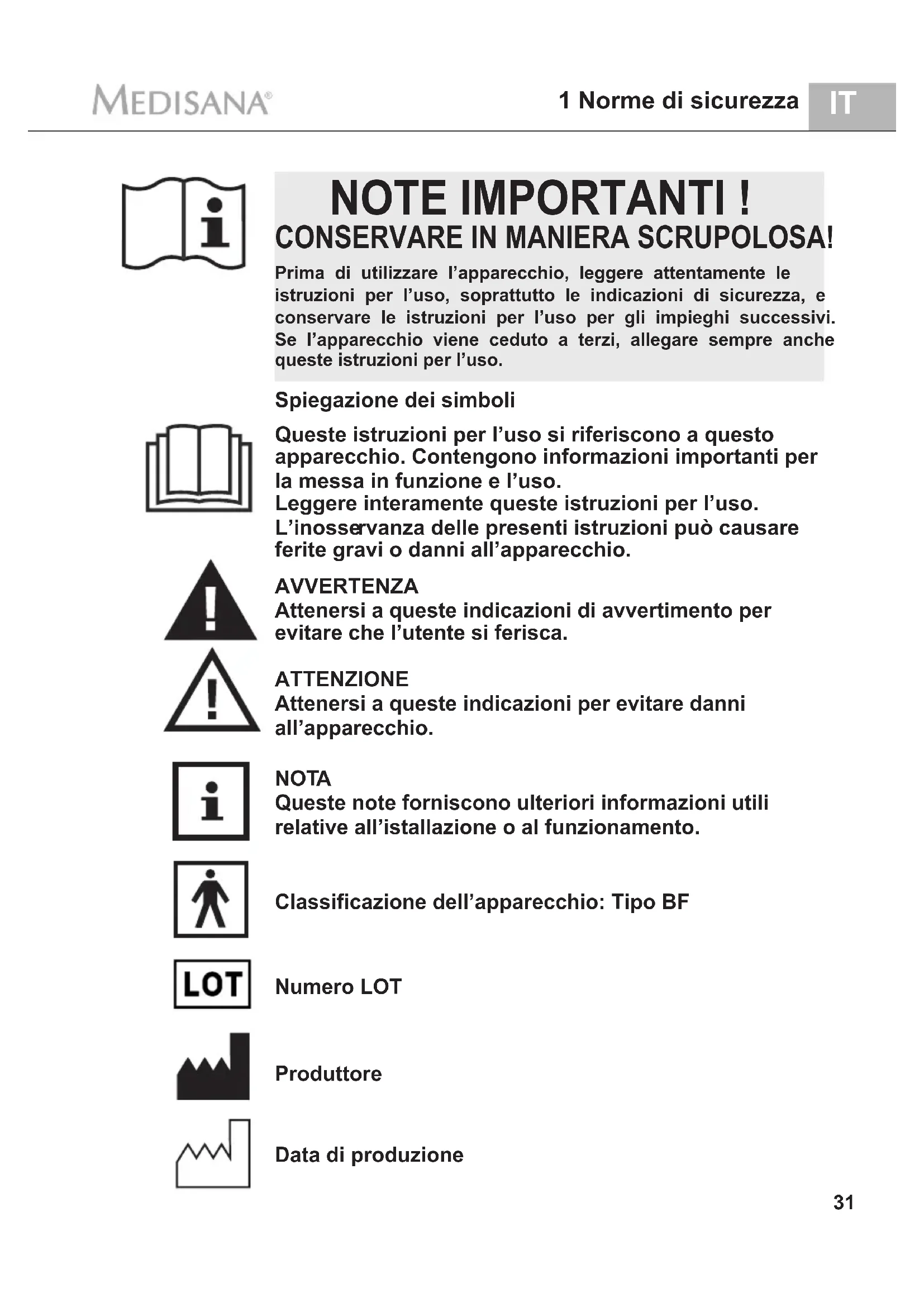 - I prodotti MEDISANA hanno una garanzia di tre anni a partire nella data di vendita. La data di acquisto deve essere comprovata in caso di garanzia alla ricevuta di acquisto o alla fattura.