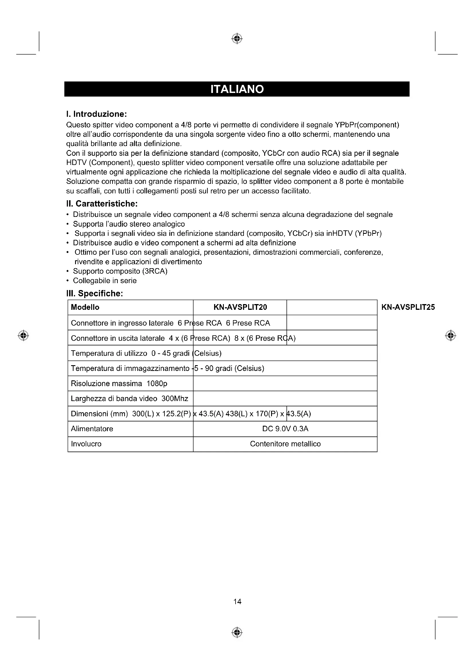 Modello KN-AVSPLIT20 KN-AVSPLIT25 Connettore in ingresso laterale 6 Prese RCA 6 Prese RCA Connettore in uscita laterale 4 x (6 Prese RCA) 8 x (6 Prese RCA) Temperatura di utilizzo 0 - 45 gradi (Celsius) Temperatura di immagazzinamento -5 - 90 gradi (Celsius) Risoluzione massima 1080p Larghezza di banda video 300Mhz Dimensioni (mm) 300(L) x 125.2(P) x 43.5(A) 438(L) x 170(P) x 43.5(A) Alimentatore DC 9.0V 0.3A Involucro Contenitore metallico15