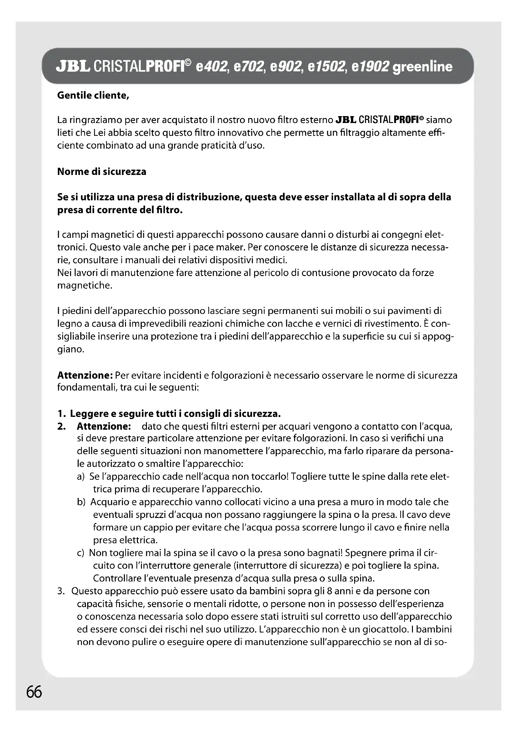 siamo lieti che Lei abbia scelto questo filtro innovativo che permette un filtraggio altamente effi-ciente combinato ad una grande praticità d’uso. Norme di sicurezzaSe si utilizza una presa di distribuzione, questa deve esser installata al di sopra della presa di corrente del filtro.I campi magnetici di questi apparecchi possono causare danni o disturbi ai congegni elet-tronici. Questo vale anche per i pace maker. Per conoscere le distanze di sicurezza necessa-rie, consultare i manuali dei relativi dispositivi medici.Nei lavori di manutenzione fare attenzione al pericolo di contusione provocato da forze magnetiche.I piedini dell’apparecchio possono lasciare segni permanenti sui mobili o sui pavimenti di legno a causa di imprevedibili reazioni chimiche con lacche e vernici di rivestimento. È con-sigliabile inserire una protezione tra i piedini dell’apparecchio e la superficie su cui si appog-giano. Attenzione: Per evitare incidenti e folgorazioni è necessario osservare le norme di sicurezza fondamentali, tra cui le seguenti:1. Leggere e seguire tutti i consigli di sicurezza.2. Attenzione: dato che questi filtri esterni per acquari vengono a contatto con l’acqua, si deve prestare particolare attenzione per evitare folgorazioni. In caso si verifichi una delle seguenti situazioni non manomettere l’apparecchio, ma farlo riparare da persona-le autorizzato o smaltire l’apparecchio: a) Se l’apparecchio cade nell’acqua non toccarlo! Togliere tutte le spine dalla rete elet-trica prima di recuperare l’apparecchio. b) Acquario e apparecchio vanno collocati vicino a una presa a muro in modo tale che eventuali spruzzi d’acqua non possano raggiungere la spina o la presa. Il cavo deve formare un cappio per evitare che l’acqua possa scorrere lungo il cavo e finire nella presa elettrica.c) Non togliere mai la spina se il cavo o la presa sono bagnati! Spegnere prima il cir-cuito con l’interruttore generale (interruttore di sicurezza) e poi togliere la spina. Controllare l’eventuale presenza d’acqua sulla presa o sulla spina.3. Questo apparecchio può essere usato da bambini sopra gli 8 anni e da persone con capacità fisiche, sensorie o mentali ridotte, o persone non in possesso dell’esperienza o conoscenza necessaria solo dopo essere stati istruiti sul corretto uso dell’apparecchio ed essere consci dei rischi nel suo utilizzo. L’apparecchio non è un giocattolo. I bambini non devono pulire o eseguire opere di manutenzione sull’apparecchio se non al di so-67 pra degli 8 anni, tenuti sotto controllo.