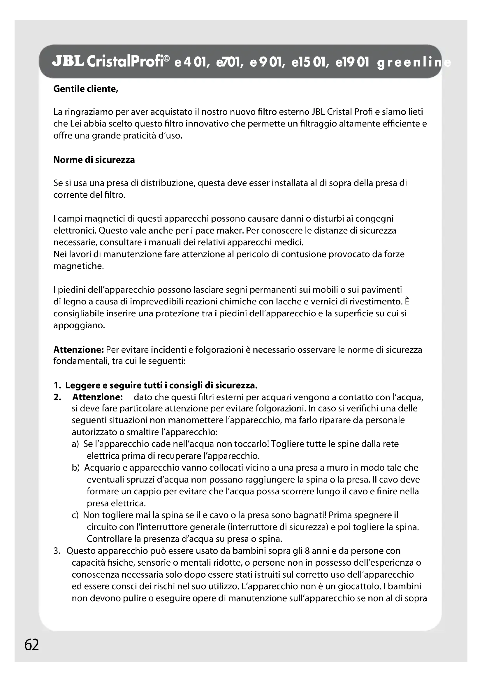 e 4 01, e701, e 9 01, e15 01, e19 01 g r e e n l i n e Gentile cliente, La ringraziamo per aver acquistato il nostro nuovo filtro esterno JBL Cristal Profi e siamo lieti che Lei abbia scelto questo filtro innovativo che permette un filtraggio altamente efficiente e offre una grande praticità d’uso. Norme di sicurezza Se si usa una presa di distribuzione, questa deve esser installata al di sopra della presa di corrente del filtro. I campi magnetici di questi apparecchi possono causare danni o disturbi ai congegni elettronici. Questo vale anche per i pace maker. Per conoscere le distanze di sicurezza necessarie, consultare i manuali dei relativi apparecchi medici. Nei lavori di manutenzione fare attenzione al pericolo di contusione provocato da forze magnetiche. I piedini dell’apparecchio possono lasciare segni permanenti sui mobili o sui pavimenti di legno a causa di imprevedibili reazioni chimiche con lacche e vernici di rivestimento. È consigliabile inserire una protezione tra i piedini dell’apparecchio e la superficie su cui si appoggiano. Attenzione: Per evitare incidenti e folgorazioni è necessario osservare le norme di sicurezza fondamentali, tra cui le seguenti: