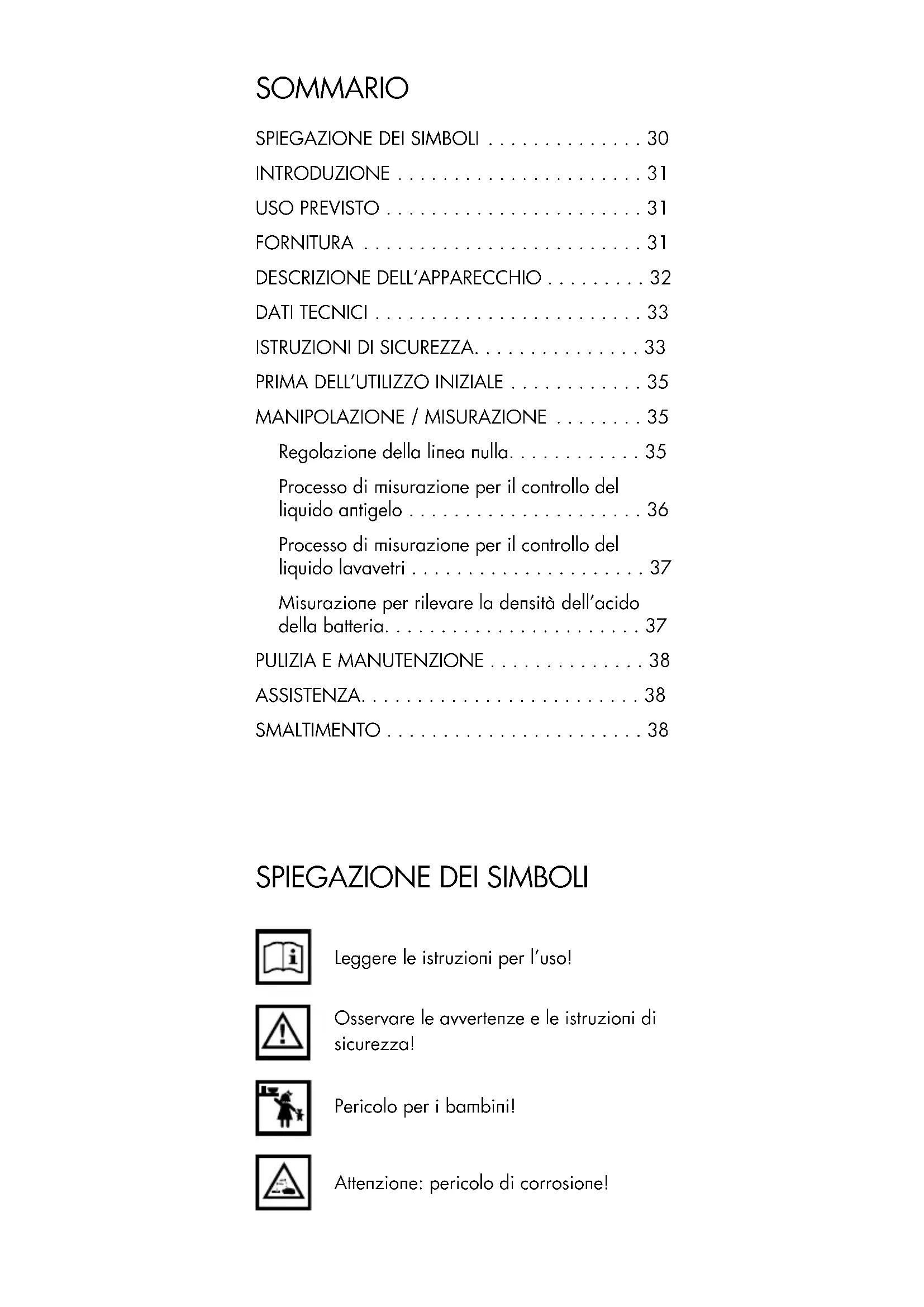 Leggere le istruzioni per l’uso! Osservare le avvertenze e le istruzioni di sicurezza! Pericolo per i bambini! Attenzione: pericolo di corrosione!31