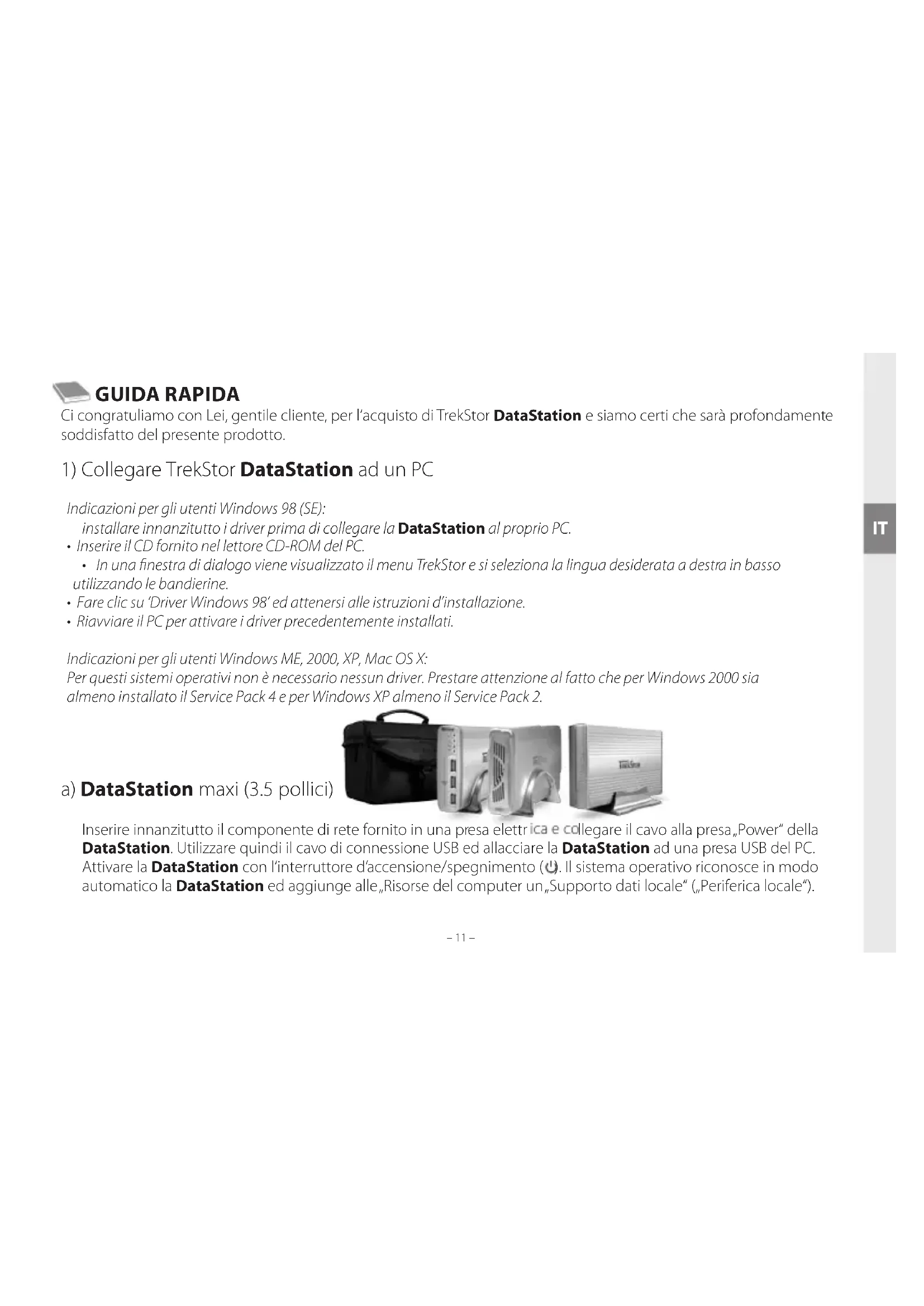 a) DataStation maxi (3.5 pollici) Inserire innanzitutto il componente di rete fornito in una presa elettrica e collegare il cavo alla presa „Power“ della DataStation. Utilizzare quindi il cavo di connessione USB ed allacciare la DataStation ad una presa USB del PC. Attivare la DataStation con l‘interruttore d‘accensione/spegnimento ( ). Il sistema operativo riconosce in modo automatico la DataStation ed aggiunge alle „Risorse del computer un „Supporto dati locale“ („Periferica locale“). – 11 – ITb) DataStation pocket (2.5 pollici) Utilizzare il cavo di connessione USB Y per collegare la DataStation al PC. Connettere lo spinotto USB A Mini a DataStation pocket ed entrambi gli spinotti USB A alle prese USB del PC. Il sistema operativo riconosce in modo automatico la DataStation ed aggiunge alle „Risorse del computer“ la DataStation come „Supporto dati locale“ (o „Periferica locale“). Indicazione: TrekStor consiglia vivamente di collegare sempre entrambi gli spinotti USB. Un‘alimentazione di corrente insuciente, come non si può escludere nel caso di un funzionamento con un solo spinotto, può eventualmente provocare eventuali perdite di dati o persino il malfunzionamento del disco rigido. TrekStor non si assume nessuna responsabilità e non fornisce nessuna garanzia per i danni alla DataStation che devono essere ricondotti ad un‘alimentazione di corrente insuciente.