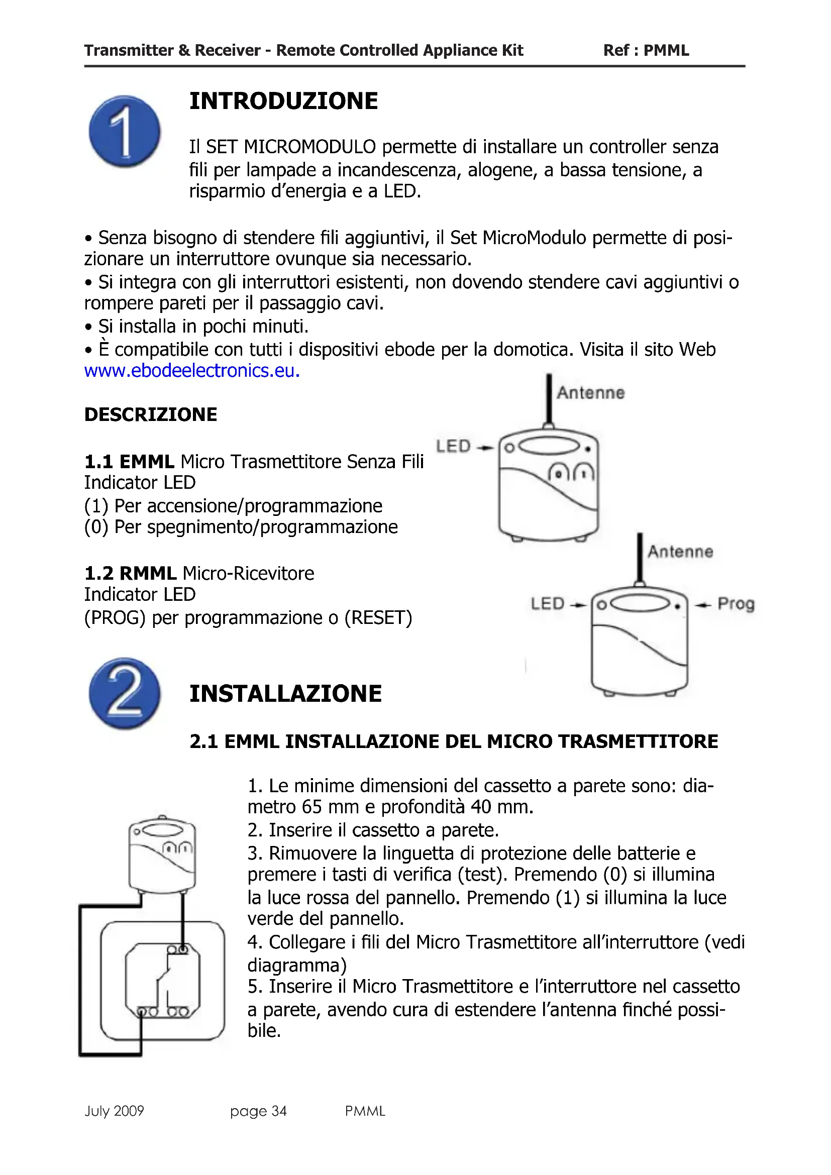 remoto: il LED del Micro Ricevitore smetterà di lampeggiare, confermando la ricezione del comando. La programmazione è conclusa! NOTA Il Micro Ricevitore RMML è in grado di riconoscere altrettanti Micro-Trasmettitori e interruttori comandati da remoto. VERIFICA Vericare la funzionalità dell’interruttore On/Off. È necessario attendere circa un secondo tra ogni comando On / Off. Durante il cambio batterie, il codice registrato sarà mantenuto dal Micro Tras- mettitore. Diagnostica guasti - controllare le domande più frequenti (FAQ) e il supporto tecnico su www.ebodeelectronics.euTransmitter & Receiver - Remote Controlled Appliance Kit Ref : PMMLJuly 2009 page 38 PMML