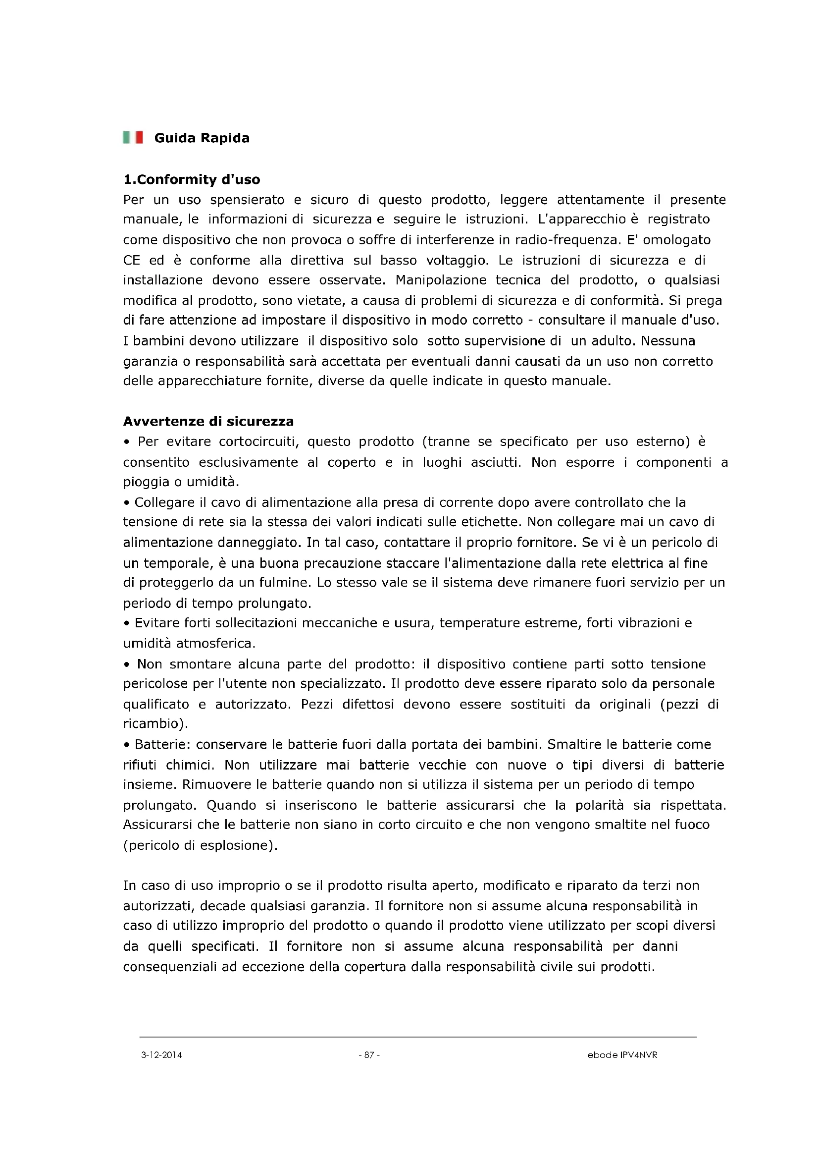 - Batterie: conservare le batterie fuori dalla portata dei bambini. Smaltire le batterie come rifiuti chimici. Non utilizzare mai batterie vecchie con nuove o tipi diversi di batterie insieme. Rimuovere le batterie quando non si utilizza il sistema per un periodo di tempo prolungato. Quando si inseriscono le batterie assicurarsi che la polarità sia rispettata. Assicurarsi che le batterie non siano in corto circuito e che non vengono smaltite nel fuoco (pericolo di esplosione). In caso di uso improprio o se il prodotto risulta aperto, modificato e riparato da terzi non autorizzati, decade qualsiasi garanzia. Il fornitore non si assume alcuna responsabilità in caso di utilizzo improprio del prodotto o quando il prodotto viene utilizzato per scopi diversi da quelli specificati. Il fornitore non si assume alcuna responsabilità per danni consequenziali ad eccezione della copertura dalla responsabilità civile sui prodotti.3-12-2014 - 88 - ebode IPV4NVR