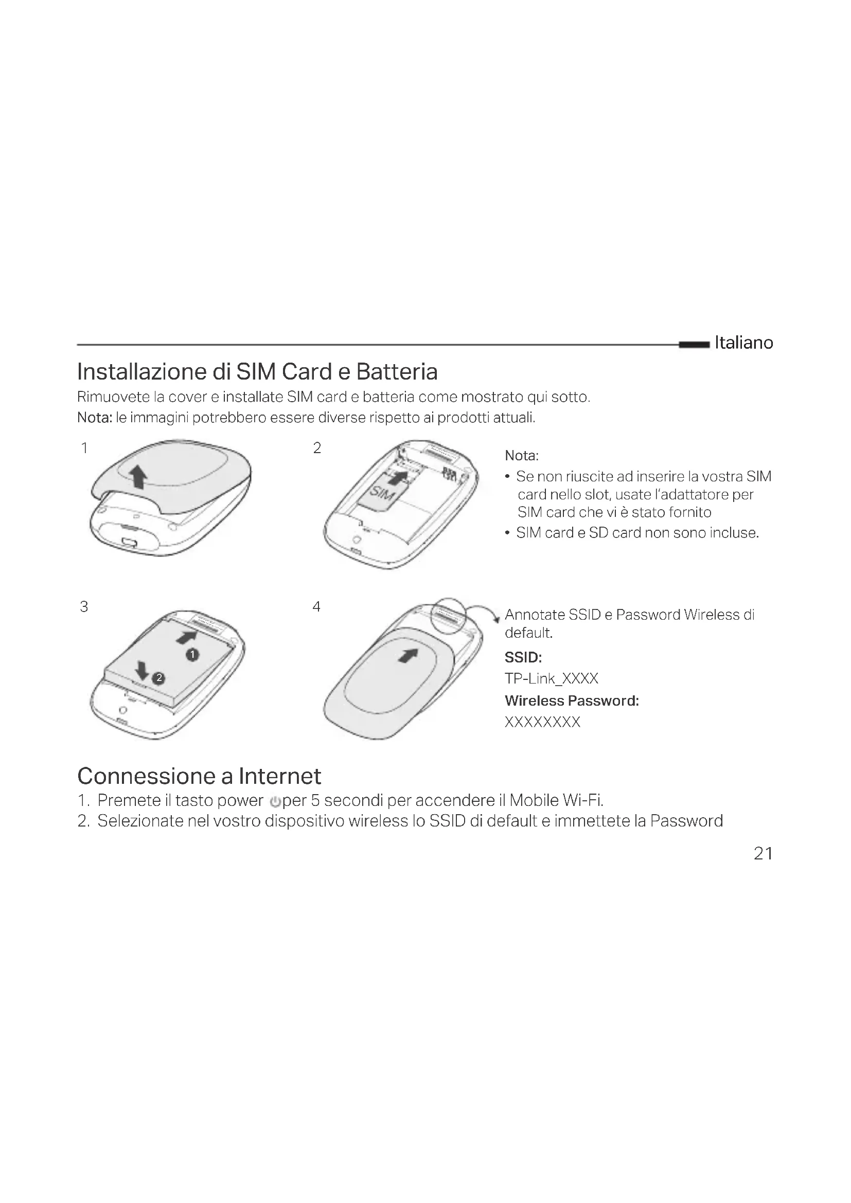 - SIM card e SD card non sono incluse. Annotate SSID e Password Wireless di default. SSID: TP-Link_XXXX Wireless Password: XXXXXXXX22 Italiano Wireless che avete annotato. Nota: Si consiglia di modicare nome wireless e password di default per la sicurezza della rete. Fatto! Nota: