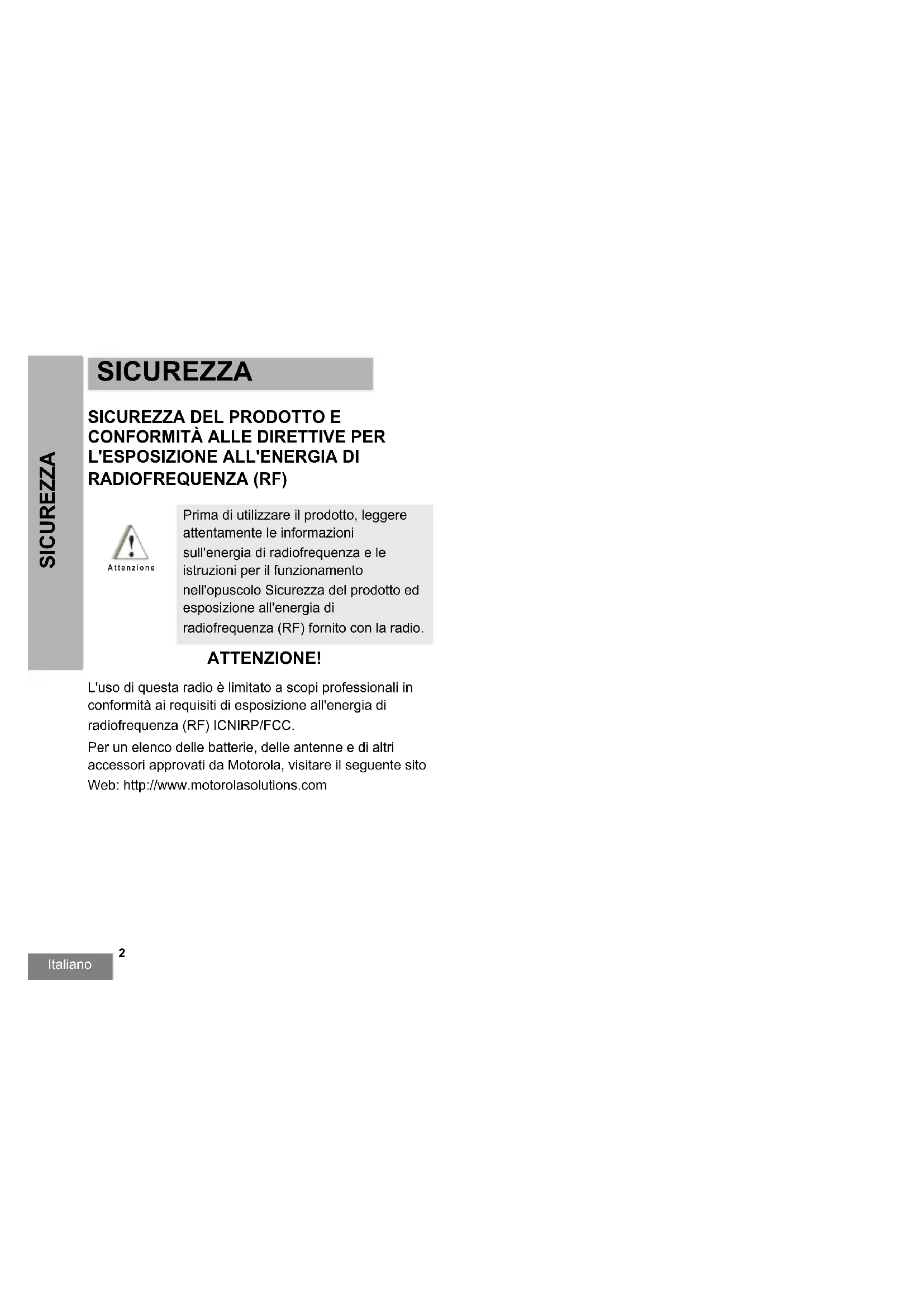 RADIOFREQUENZA (RF) ATTENZIONE! L'uso di questa radio è limitato a scopi professionali in conformità ai requisiti di esposizione all'energia di radiofrequenza (RF) ICNIRP/FCC. Per un elenco delle batterie, delle antenne e di altri accessori approvati da Motorola, visitare il seguente sito Web: http://www.motorolasolutions.com Prima di utilizzare il prodotto, leggere attentamente le informazioni sull'energia di radiofrequenza e le istruzioni per il funzionamento nell'opuscolo Sicurezza del prodotto ed esposizione all'energia di radiofrequenza (RF) fornito con la radio.