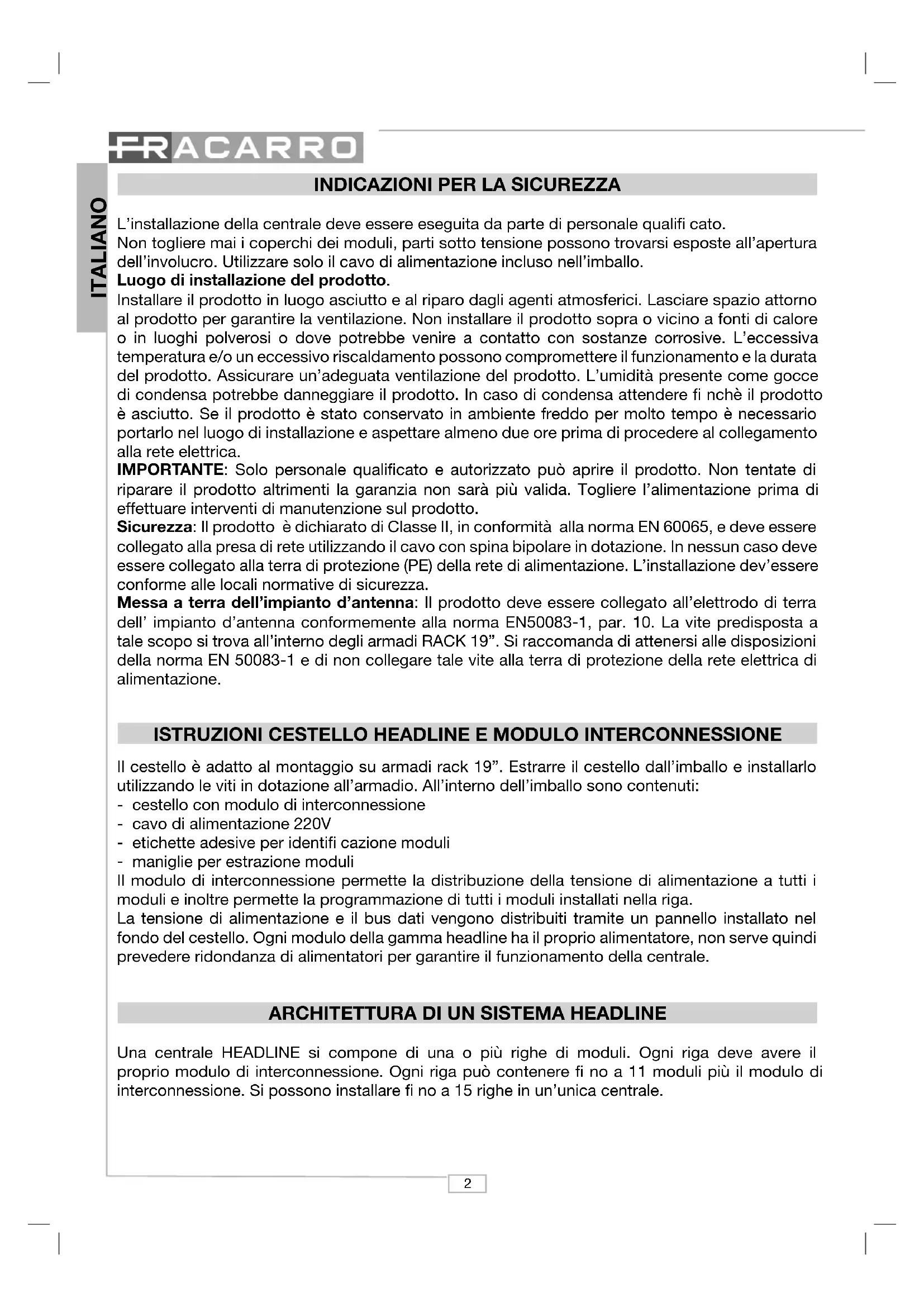 L’installazione della centrale deve essere eseguita da parte di personale qualifi cato. Non togliere mai i coperchi dei moduli, parti sotto tensione possono trovarsi esposte all’apertura dell’involucro. Utilizzare solo il cavo di alimentazione incluso nell’imballo. Luogo di installazione del prodotto. Installare il prodotto in luogo asciutto e al riparo dagli agenti atmosferici. Lasciare spazio attorno al prodotto per garantire la ventilazione. Non installare il prodotto sopra o vicino a fonti di calore o in luoghi polverosi o dove potrebbe venire a contatto con sostanze corrosive. L’eccessiva temperatura e/o un eccessivo riscaldamento possono compromettere il funzionamento e la durata del prodotto. Assicurare un’adeguata ventilazione del prodotto. L’umidità presente come gocce di condensa potrebbe danneggiare il prodotto. In caso di condensa attendere fi nchè il prodotto è asciutto. Se il prodotto è stato conservato in ambiente freddo per molto tempo è necessario portarlo nel luogo di installazione e aspettare almeno due ore prima di procedere al collegamento alla rete elettrica. IMPORTANTE: Solo personale qualifi cato e autorizzato può aprire il prodotto. Non tentate di riparare il prodotto altrimenti la garanzia non sarà più valida. Togliere l’alimentazione prima di effettuare interventi di manutenzione sul prodotto. Sicurezza: Il prodotto è dichiarato di Classe II, in conformità alla norma EN 60065, e deve essere collegato alla presa di rete utilizzando il cavo con spina bipolare in dotazione. In nessun caso deve essere collegato alla terra di protezione (PE) della rete di alimentazione. L’installazione dev’essere conforme alle locali normative di sicurezza. Messa a terra dell’impianto d’antenna: Il prodotto deve essere collegato all’elettrodo di terra dell’ impianto d’antenna conformemente alla norma EN50083-1, par. 10. La vite predisposta a tale scopo si trova all’interno degli armadi RACK 19”. Si raccomanda di attenersi alle disposizioni della norma EN 50083-1 e di non collegare tale vite alla terra di protezione della rete elettrica di alimentazione.