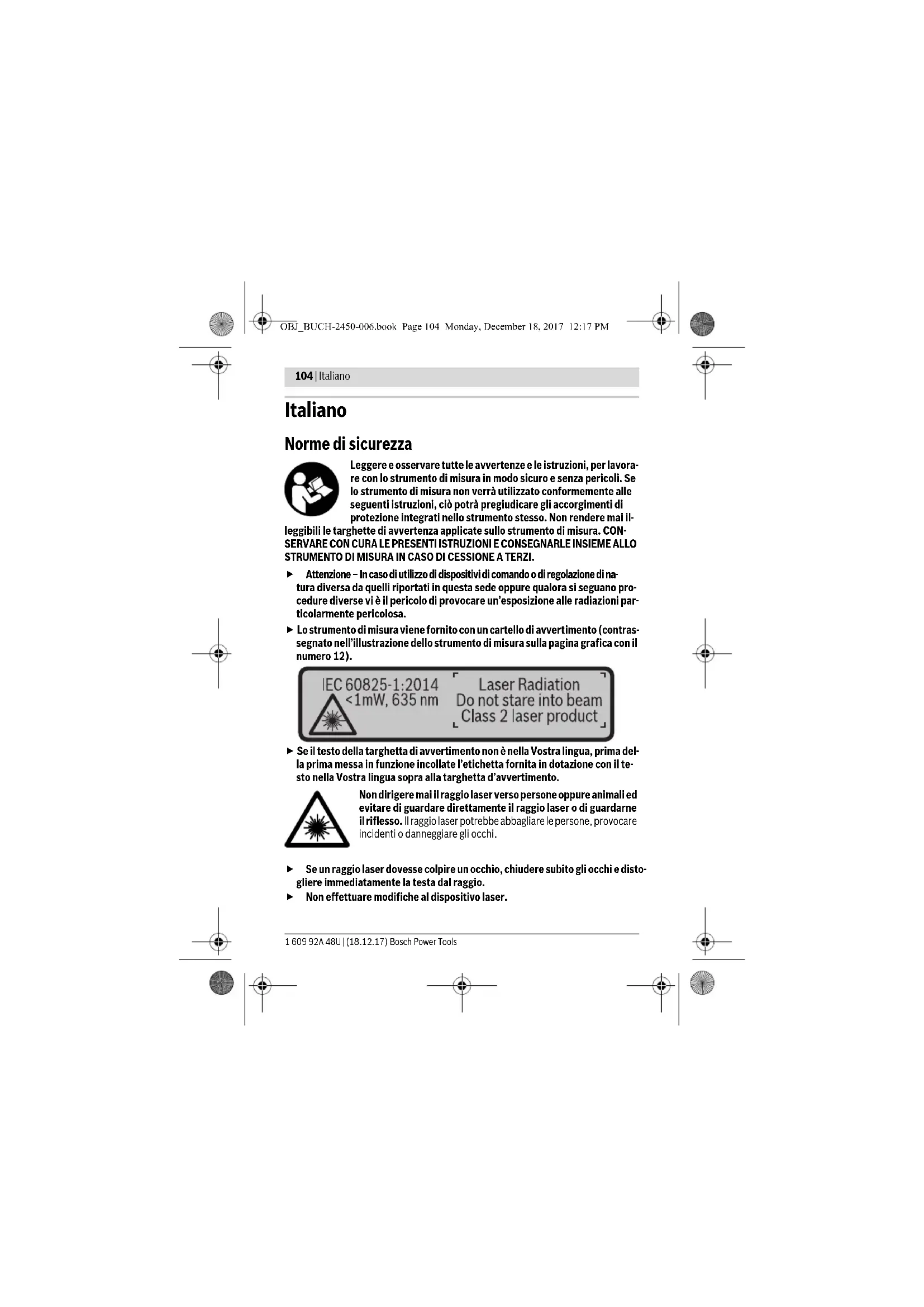 - L’accessorio illustrato o descritto nelle istruzioni per l’uso non è compreso nella fornitura standard. Elementi di visualizzazione (selezione) a Stato Bluetooth® b Piano di riferimento della misurazione c Indicatore del livello di carica della batteria d Righe valori misurati e Riga risultato f Funzioni di misurazione Bluetooth® attivato, nessuna connessione creata Bluetooth® attivato, connessione creata OBJ_BUCH-2450-006.book Page 108 Monday, December 18, 2017 12:17 PMItaliano | 109 Bosch Power Tools 1 609 92A 48U | (18.12.17) g Indicazione angolo di inclinazione h Barra di stato i Impostazioni di base Montaggio Applicazione/sostituzione delle batterie Per il funzionamento dello strumento di misura si consiglia l’impiego di batterie alca- line al manganese oppure batterie ricaricabili. Con batterie da 1,2 V sarà possibile effettuare un minor numero di misurazioni rispet- to a quello con batterie da 1,5 V. Per aprire il coperchio del vano batterie 9 premere il bloccaggio 10 e rimuovere il co- perchio del vano batterie. Inserire le batterie oppure le batterie ricaricabili, facendo attenzione alla corretta polarizzazione, conformemente all’illustrazione riportata sul lato interno del vano batterie. Quando sul display verrà visualizzato per la prima volta il simbolo della batteria vuota, sarà ancora possibile eseguire circa 100 misurazioni. Quando il simbolo della batteria apparirà vuoto e lampeggerà di colore rosso, non sarà più possibile effettuare misura- zioni. Sostituire le batterie/le batterie ricaricabili. Sostituire sempre contemporaneamente tutte le batterie oppure le batterie ricarica- bili. Utilizzare esclusivamente batterie oppure batterie ricaricabili dello stesso pro- duttore e con la stessa capacità. In caso di non utilizzo per lunghi periodi, estrarre le batterie oppure le batte- rie ricaricabili dallo strumento di misura. In caso di lunghi periodi di deposito, le batterie e le batterie ricaricabili possono subire corrosioni e scaricarsi. Uso Messa in funzione Non lasciare mai lo strumento di misura senza custodia quando è acceso ed avere cura di spegnere lo strumento di misura subito dopo l’utilizzo. Vi è il pe- ricolo che altre persone potrebbero essere abbagliate dal raggio laser. Proteggere lo strumento di misura da liquidi e dall’esposizione diretta ai raggi solari. Non esporre mai lo strumento di misura a temperature oppure a sbalzi di tem- peratura estremi. P.es. non lasciarlo per lungo tempo in macchina. In caso di ele- vati sbalzi di temperatura lasciare adattare alla temperatura ambientale lo stru- OBJ_BUCH-2450-006.book Page 109 Monday, December 18, 2017 12:17 PM110 | Italiano 1 609 92A 48U | (18.12.17) Bosch Power Tools mento di misura prima di metterlo in funzione. Temperature oppure sbalzi di temperatura estremi possono pregiudicare la precisione dello strumento di misu- ra. Evitare urti violenti oppure cadute dello strumento di misura. In caso che lo strumento di misura abbia subito forti influssi esterni, prima di rimetterlo in funzio- ne è necessario eseguire prima un controllo della precisione (vedi «Controllo della precisione della misurazione delle distanze», pagina 120). Accensione/spegnimento –Per l’accensione dello strumento di misura e del laser, premere brevemente il ta- sto di misurazione 2 []. –Per l’accensione dello strumento di misura senza laser, premere brevemente il ta- sto ON/OFF 5 []. Non dirigere mai il raggio laser su persone oppure su animali ed evitare di guardare direttamente il raggio laser anche da distanze maggiori. Per lo spegnimento dello strumento di misura, mantenere premuto il tasto ON/OFF 5 []. Allo spegnimento dello strumento di misura, i valori e le impostazioni dello strumento presenti in memoria verranno conservati. Misurazione Una volta acceso, lo strumento di misura si troverà in modalità di funzionamento Mi- surazione delle lunghezze. Per passare ad un’altra funzione di misurazione, premere il tasto 7 [Func]. Selezionare la funzione di misurazione desiderata con il tasto 3 [+], oppure con il tasto 8 [–] (vedere «Funzioni di misurazione», pagina 111). Attivare la funzione di misurazione con il tasto 7 [Func] oppure con il tasto di misurazione 2 []. Dopo l’accensione lo spigolo posteriore dello strumento di misura è selezionato quale piano di riferimento per la misurazione. Per cambiare il piano di riferimento vedi «Se- lezione del piano di riferimento», pagina 110. Sistemare lo strumento di misura sul punto iniziale desiderato della misurazione (ad es. su una parete). Nota bene: Se lo strumento di misura è stato acceso con il tasto ON/OFF 5 [] pre- mere brevemente il tasto di misurazione 2 [ ] per accendere il laser. Per attivare la misurazione, premere brevemente il tasto di misurazione 2 []. Dopo di ciò, il raggio laser verrà spento. Per eseguire una seconda misurazione, ripetere ta- le procedura. OBJ_BUCH-2450-006.book Page 110 Monday, December 18, 2017 12:17 PMItaliano | 111 Bosch Power Tools 1 609 92A 48U | (18.12.17) Non dirigere mai il raggio laser su persone oppure su animali ed evitare di guardare direttamente il raggio laser anche da distanze maggiori. Nota bene: Di norma, il valore di misurazione verrà visualizzato entro 0,5 s, al massi- mo dopo circa 4 s. La durata della misurazione dipenderà dalla distanza, dalle condi- zioni di luce e dalle caratteristiche di riflessione della superficie obiettivo. A misura- zione terminata, il raggio laser verrà spento automaticamente. Selezione del piano di riferimento (vedi figura A) Per la misurazione è possibile scegliere tra tre differenti piani di riferimento: – il bordo posteriore dello strumento di misura (p.es. in caso di applicazione su pa- reti), – il bordo anteriore dello strumento di misura (p.es. in caso di misurazione da un bordo del tavolo), – al centro della filettatura 13 (p.es. per misurazioni con treppiede). Per selezionare il punto di partenza della misura, premere il tasto 4. Selezionare
