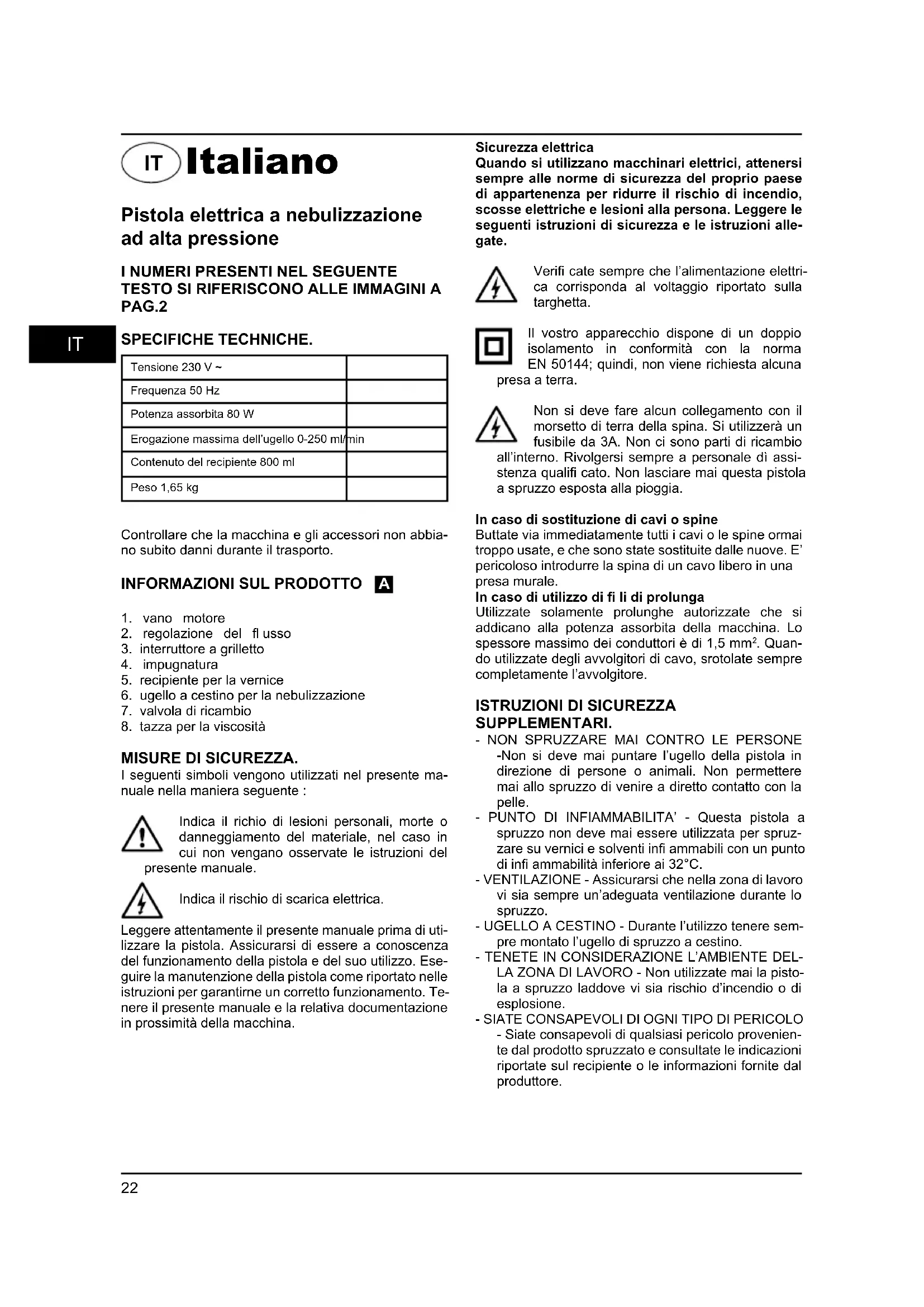 MISURE DI SICUREZZA. I seguenti simboli vengono utilizzati nel presente ma- nuale nella maniera seguente : Indica il richio di lesioni personali, morte o danneggiamento del materiale, nel caso in cui non vengano osservate le istruzioni del presente manuale. Indica il rischio di scarica elettrica. Leggere attentamente il presente manuale prima di uti- lizzare la pistola. Assicurarsi di essere a conoscenza del funzionamento della pistola e del suo utilizzo. Ese- guire la manutenzione della pistola come riportato nelle istruzioni per garantirne un corretto funzionamento. Te- nere il presente manuale e la relativa documentazione in prossimità della macchina. Sicurezza elettrica Quando si utilizzano macchinari elettrici, attenersi sempre alle norme di sicurezza del proprio paese di appartenenza per ridurre il rischio di incendio, scosse elettriche e lesioni alla persona. Leggere le seguenti istruzioni di sicurezza e le istruzioni alle- gate. Verifi cate sempre che l’alimentazione elettri- ca corrisponda al voltaggio riportato sulla targhetta. Il vostro apparecchio dispone di un doppio isolamento in conformità con la norma EN 50144; quindi, non viene richiesta alcuna presa a terra. Non si deve fare alcun collegamento con il morsetto di terra della spina. Si utilizzerà un fusibile da 3A. Non ci sono parti di ricambio all’interno. Rivolgersi sempre a personale dì assi- stenza qualifi cato. Non lasciare mai questa pistola a spruzzo esposta alla pioggia. In caso di sostituzione di cavi o spine Buttate via immediatamente tutti i cavi o le spine ormai troppo usate, e che sono state sostituite dalle nuove. E’ pericoloso introdurre la spina di un cavo libero in una presa murale. In caso di utilizzo di fi li di prolunga Utilizzate solamente prolunghe autorizzate che si addicano alla potenza assorbita della macchina. Lo spessore massimo dei conduttori è di 1,5 mm