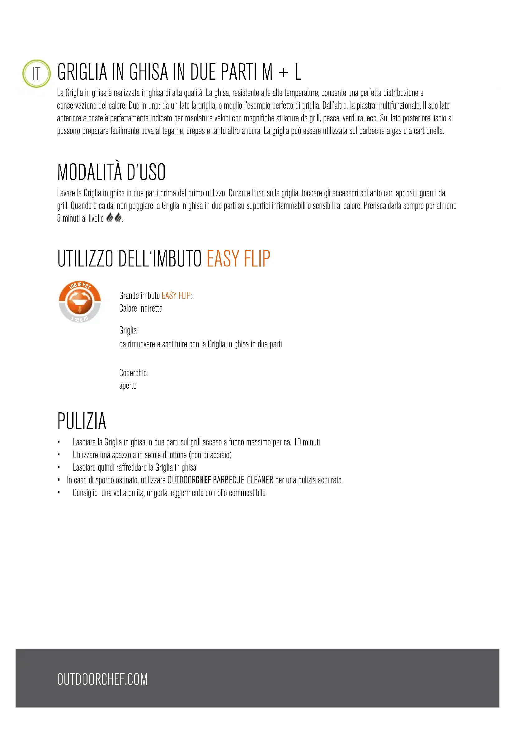 Grande imbuto EASY FLIP: Calore indiretto Griglia: da rimuovere e sostituire con la Griglia in ghisa in due parti Coperchio: aperto
