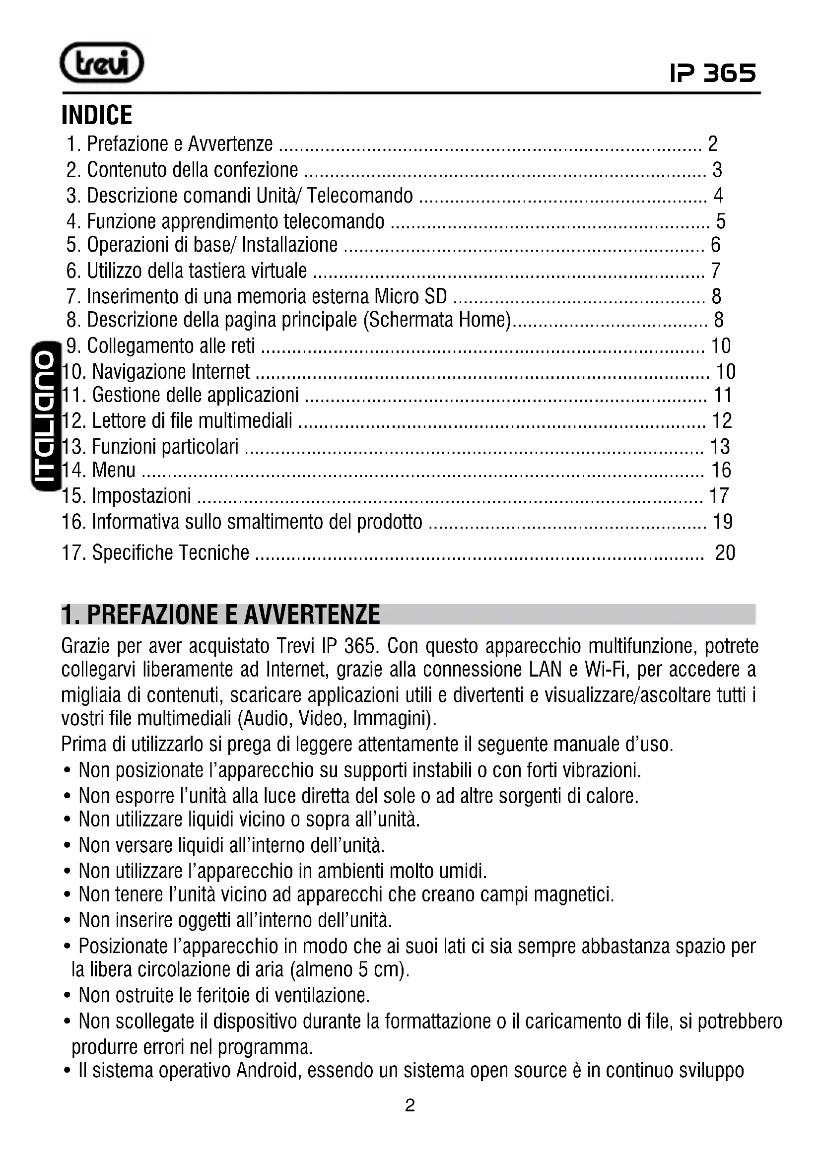 Grazie per aver acquistato Trevi IP 365. Con quello apparecchio multifunzione, potrete collegarvi liberamente ad Internet, grazie alla connessione LAN e Wi-Fi, per accederate a miglioria di contentuti, scaricare applicazioni utili e divertenti e visualizzare/ascoltare tutti i vosri file multimediali (Audio, Video, Immagini).