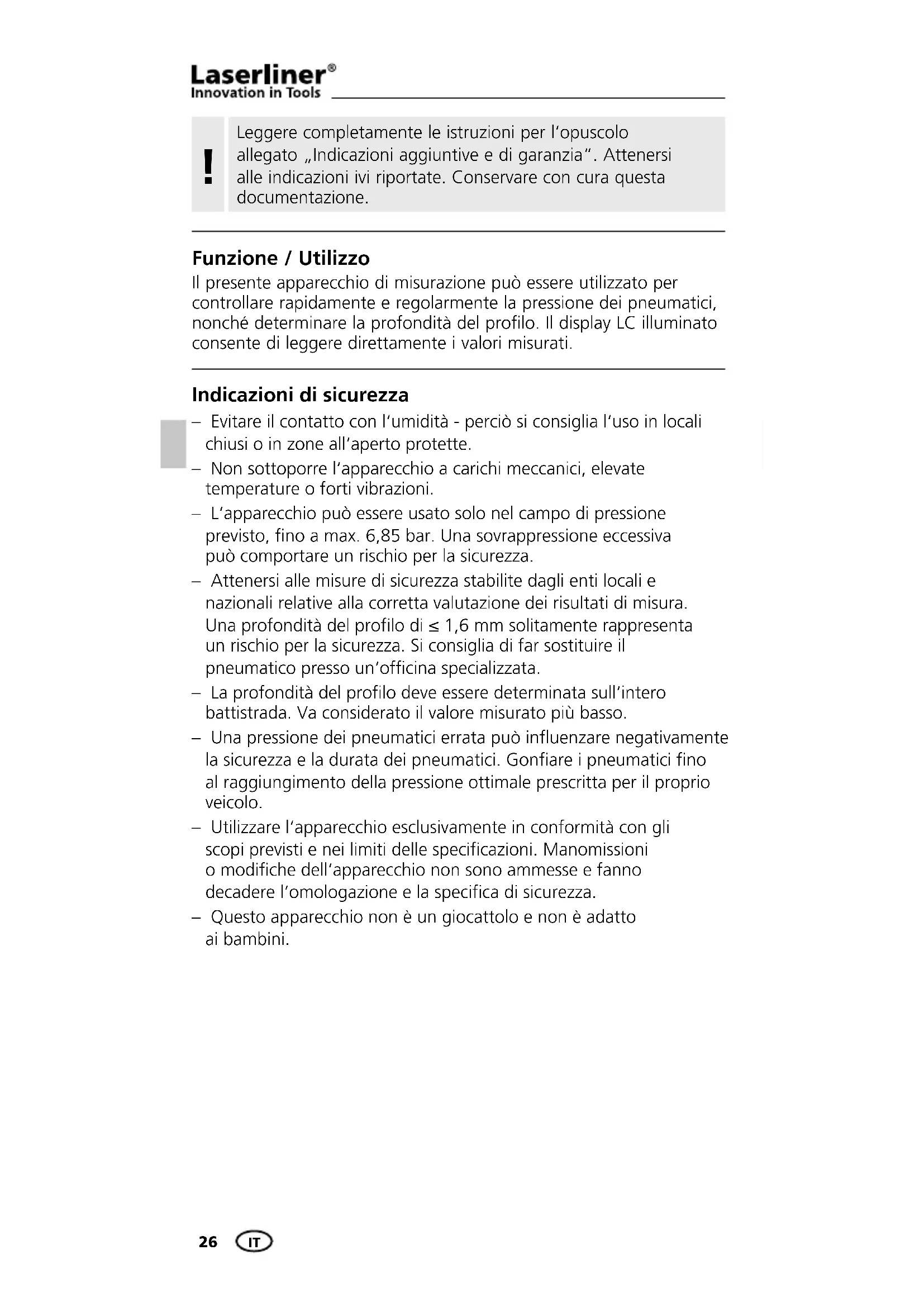 Funzione / Utilizzo Il presente apparecchio di misurazione può essere utilizzato per controllare rapidamente e regolarmente la pressione dei pneumatici, nonché determinare la profondità del profilo. Il display LC illuminato consente di leggere direttamente i valori misurati. Indicazioni di sicurezza – Evitare il contatto con l‘umidità - perciò si consiglia l‘uso in locali chiusi o in zone all‘aperto protette. – Non sottoporre l‘apparecchio a carichi meccanici, elevate temperature o forti vibrazioni. – L‘apparecchio può essere usato solo nel campo di pressione previsto, fino a max. 6,85 bar. Una sovrappressione eccessiva può comportare un rischio per la sicurezza. – Attenersi alle misure di sicurezza stabilite dagli enti locali e nazionali relative alla corretta valutazione dei risultati di misura. Una profondità del profilo di ≤ 1,6 mm solitamente rappresenta un rischio per la sicurezza. Si consiglia di far sostituire il pneumatico presso un‘officina specializzata. – La profondità del profilo deve essere determinata sull‘intero battistrada. Va considerato il valore misurato più basso. – Una pressione dei pneumatici errata può influenzare negativamente la sicurezza e la durata dei pneumatici. Gonfiare i pneumatici fino al raggiungimento della pressione ottimale prescritta per il proprio veicolo. – Utilizzare l‘apparecchio esclusivamente in conformità con gli scopi previsti e nei limiti delle specificazioni. Manomissioni o modifiche dell‘apparecchio non sono ammesse e fanno decadere l‘omologazione e la specifica di sicurezza. – Questo apparecchio non è un giocattolo e non è adatto ai bambini.TireCheck