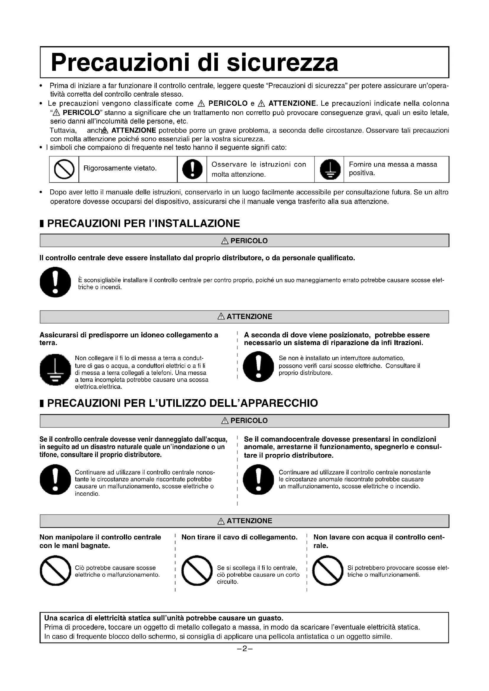 - Dopo aver letto il manuale delle istruzioni, conservarlo in un luogo facilmente accessibile per consultazione futura. Se un altro operatore dovesse occuparsi del dispositivo, assicurarsi che il manuale venga trasferito alla sua attenzione. Non manipolare il controllo centrale con le mani bagnate. Non tirare il cavo di collegamento. Precauzioni di sicurezza Osservare le istruzioni con molta attenzione. Rigorosamente vietato. ATTENZIONE Ciò potrebbe causare scosse elettriche o malfunzionamento. Se si scollega il fi lo centrale, ciò potrebbe causare un corto circuito. Fornire una messa a massa positiva.