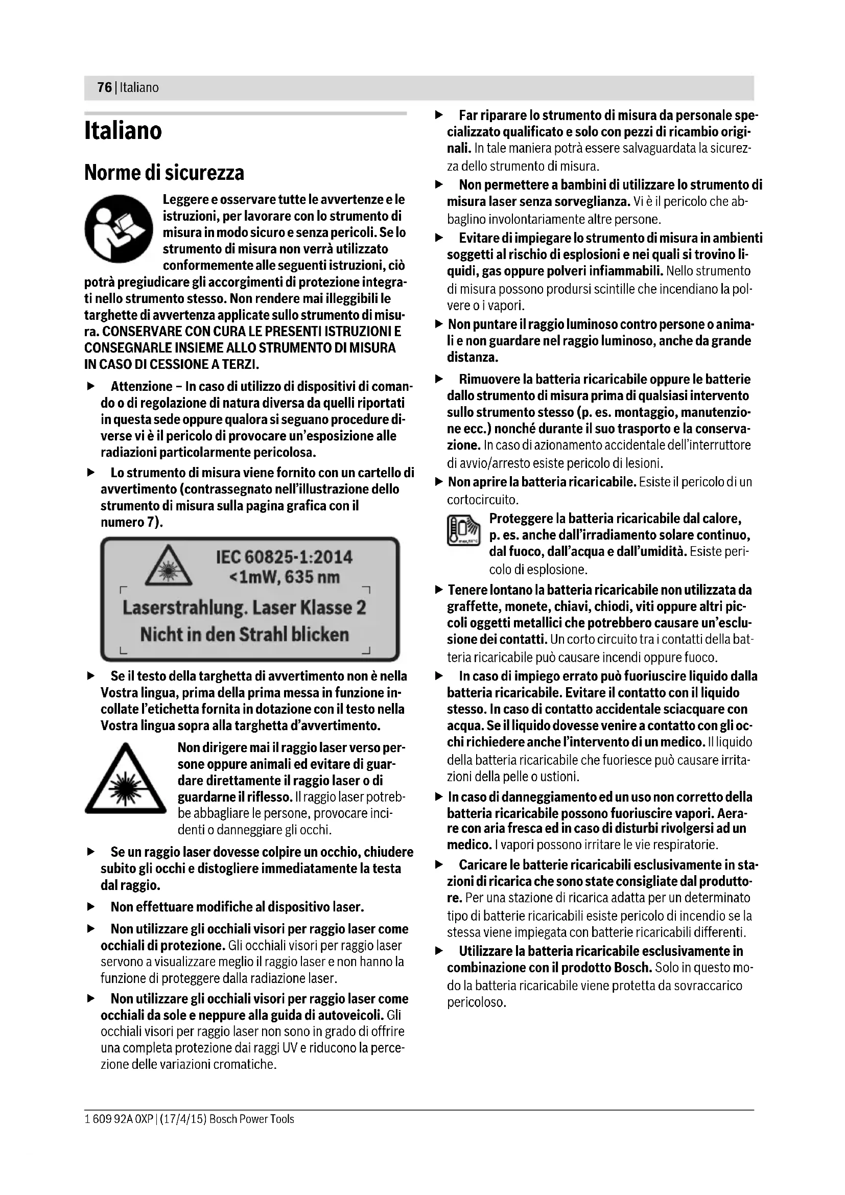 IN CASO DI CESSIONE A TERZI. Attenzione – In caso di utilizzo di dispositivi di coman- do o di regolazione di natura diversa da quelli riportati in questa sede oppure qualora si seguano procedure di- verse vi è il pericolo di provocare un’esposizione alle radiazioni particolarmente pericolosa. Lo strumento di misura viene fornito con un cartello di avvertimento (contrassegnato nell’illustrazione dello strumento di misura sulla pagina grafica con il numero 7). Se il testo della targhetta di avvertimento non è nella Vostra lingua, prima della prima messa in funzione in- collate l’etichetta fornita in dotazione con il testo nella Vostra lingua sopra alla targhetta d’avvertimento. Non dirigere mai il raggio laser verso per- sone oppure animali ed evitare di guar- dare direttamente il raggio laser o di guardarne il riflesso. Il raggio laser potreb- be abbagliare le persone, provocare inci- denti o danneggiare gli occhi. Se un raggio laser dovesse colpire un occhio, chiudere subito gli occhi e distogliere immediatamente la testa dal raggio. Non effettuare modifiche al dispositivo laser. Non utilizzare gli occhiali visori per raggio laser come occhiali di protezione. Gli occhiali visori per raggio laser servono a visualizzare meglio il raggio laser e non hanno la funzione di proteggere dalla radiazione laser. Non utilizzare gli occhiali visori per raggio laser come occhiali da sole e neppure alla guida di autoveicoli. Gli occhiali visori per raggio laser non sono in grado di offrire una completa protezione dai raggi UV e riducono la perce- zione delle variazioni cromatiche. Far riparare lo strumento di misura da personale spe- cializzato qualificato e solo con pezzi di ricambio origi- nali. In tale maniera potrà essere salvaguardata la sicurez- za dello strumento di misura. Non permettere a bambini di utilizzare lo strumento di misura laser senza sorveglianza. Vi è il pericolo che ab- baglino involontariamente altre persone. Evitare di impiegare lo strumento di misura in ambienti soggetti al rischio di esplosioni e nei quali si trovino li- quidi, gas oppure polveri infiammabili. Nello strumento di misura possono prodursi scintille che incendiano la pol- vere o i vapori. Non puntare il raggio luminoso contro persone o anima- li e non guardare nel raggio luminoso, anche da grande distanza. Rimuovere la batteria ricaricabile oppure le batterie dallo strumento di misura prima di qualsiasi intervento sullo strumento stesso (p. es. montaggio, manutenzio- ne ecc.) nonché durante il suo trasporto e la conserva- zione. In caso di azionamento accidentale dell’interruttore di avvio/arresto esiste pericolo di lesioni. Non aprire la batteria ricaricabile. Esiste il pericolo di un cortocircuito. Proteggere la batteria ricaricabile dal calore, p. es. anche dall’irradiamento solare continuo, dal fuoco, dall’acqua e dall’umidità. Esiste peri- colo di esplosione. Tenere lontano la batteria ricaricabile non utilizzata da graffette, monete, chiavi, chiodi, viti oppure altri pic- coli oggetti metallici che potrebbero causare un’esclu- sione dei contatti. Un corto circuito tra i contatti della bat- teria ricaricabile può causare incendi oppure fuoco. In caso di impiego errato può fuoriuscire liquido dalla batteria ricaricabile. Evitare il contatto con il liquido stesso. In caso di contatto accidentale sciacquare con acqua. Se il liquido dovesse venire a contatto con gli oc- chi richiedere anche l’intervento di un medico. Il liquido della batteria ricaricabile che fuoriesce può causare irrita- zioni della pelle o ustioni. In caso di danneggiamento ed un uso non corretto della batteria ricaricabile possono fuoriuscire vapori. Aera- re con aria fresca ed in caso di disturbi rivolgersi ad un medico. I vapori possono irritare le vie respiratorie. Caricare le batterie ricaricabili esclusivamente in sta- zioni di ricarica che sono state consigliate dal produtto- re. Per una stazione di ricarica adatta per un determinato tipo di batterie ricaricabili esiste pericolo di incendio se la stessa viene impiegata con batterie ricaricabili differenti. Utilizzare la batteria ricaricabile esclusivamente in combinazione con il prodotto Bosch. Solo in questo mo- do la batteria ricaricabile viene protetta da sovraccarico pericoloso. OBJ_BUCH-2270-002.book Page 76 Friday, April 17, 2015 9:48 AMItaliano | 77 Bosch Power Tools 1 609 92A 0XP | (17/4/15) Utilizzare esclusivamente batterie ricaricabili originali Bosch dotate della tensione indicata sulla targhetta di identificazione dello strumento di misura. In caso di im- piego di altre batterie ricaricabili, p. es. imitazioni, batterie ricaricabili rigenerate oppure prodotti di terzi, esiste il pe- ricolo di lesioni e di danni alle cose causate da batterie ri- caricabili che esplodono. Se si usano oggetti appuntiti, come ad es. chiodi o un cacciavite, oppure se si esercita forza dall’esterno, la batteria ricaricabile può danneggiarsi. Può verificarsi un cortocircuito interno e la batteria ricaricabile può incen- diarsi, emettere fumo, esplodere o surriscaldarsi. Attenzione! L’impiego dello strumento di misura con si- stema Bluetooth® può causare disturbi ad altri appa- recchi ed impianti, a velivoli e ad apparecchiature me- dicali (ad esempio pacemaker o apparecchi acustici). Non si possono altresì escludere lesioni a persone e ad animali nelle immediate vicinanze. Non impiegare lo strumento di misura con sistema Bluetooth® in prossi- mità di apparecchiature medicali, stazioni di riforni- mento, impianti chimici, aree a rischio di esplosione ed aree di brillamento. Non impiegare lo strumento di mi- sura con sistema Bluetooth® all’interno di velivoli. Evi- tare l’impiego prolungato nelle immediate vicinanze del corpo. Il wordmark Bluetooth®, così come i simboli grafici (lo- ghi), sono marchi di fabbrica registrati e sono di proprietà della Bluetooth SIG, Inc. Qualsivoglia utilizzo di questi wordmark/loghi da parte di Robert Bosch GmbH avvie