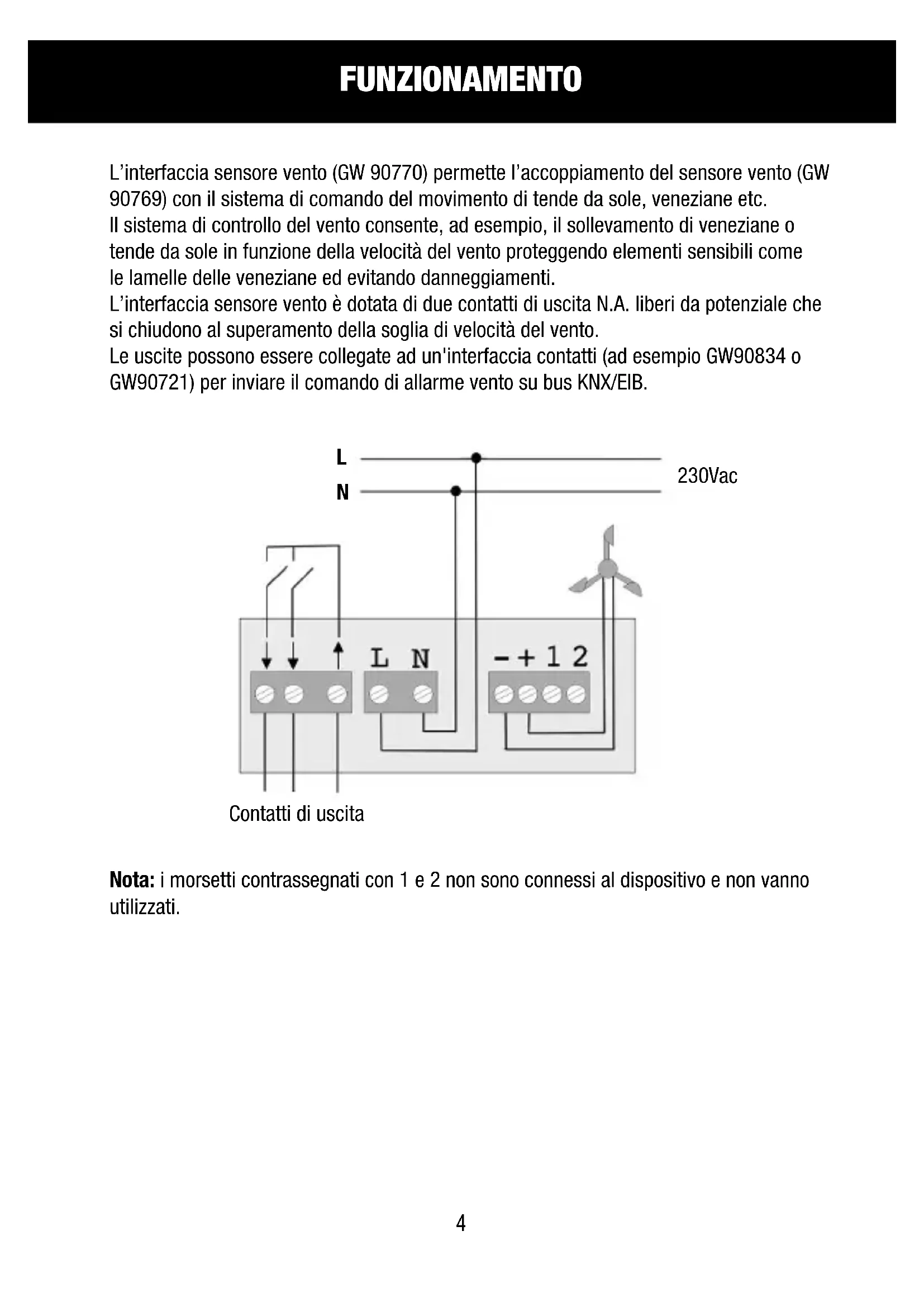 L'interfaccia sensore vento è dotata di due contatti di uscita N.A. liberi da potenziale che si chiudono al superamento della soglia di velocità del vento.