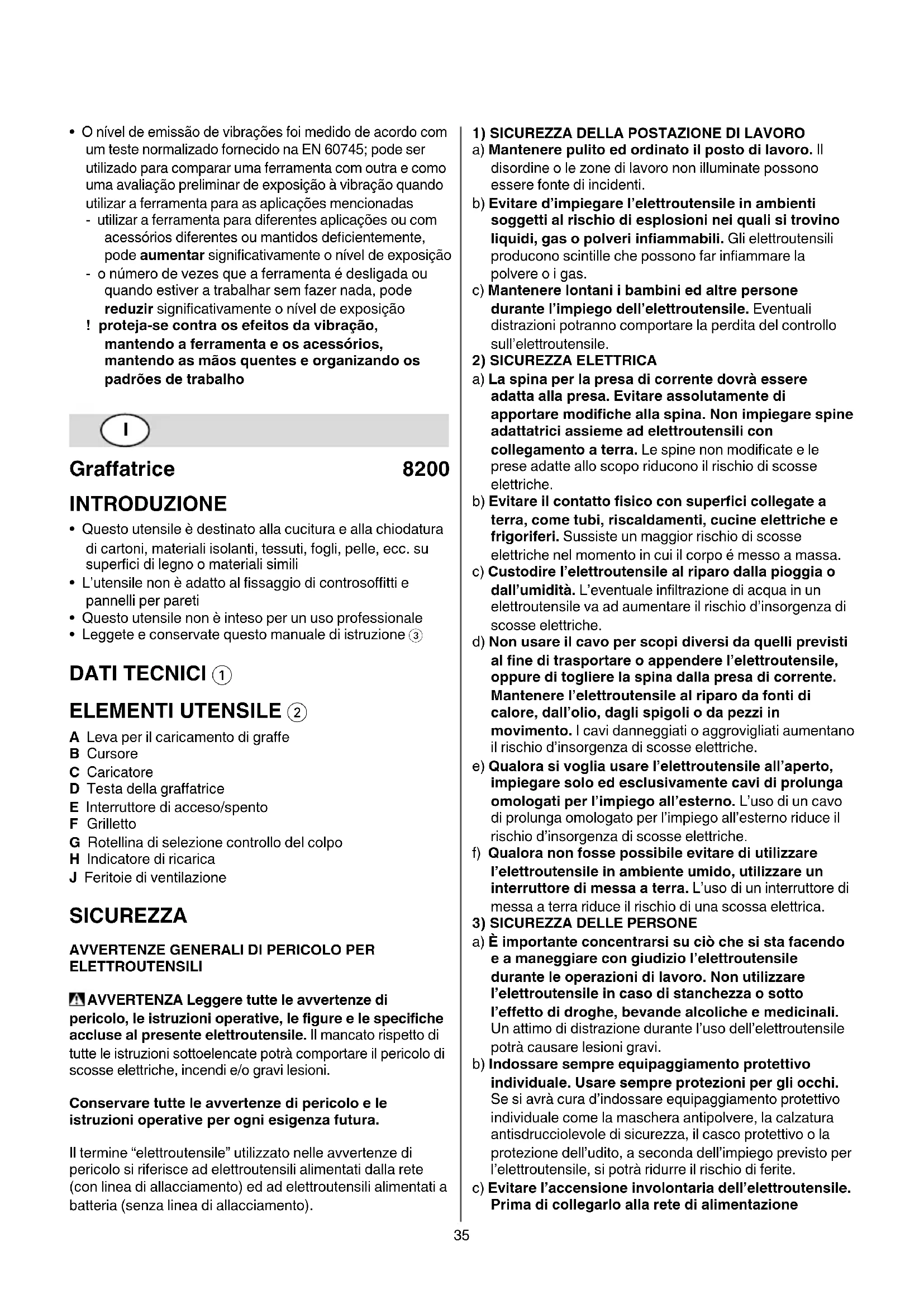 - Leggete e conservate questo manuale di istruzione 3 DATI TECNICI 1 ELEMENTI UTENSILE 2 A Leva per il caricamento di grae B Cursore C Caricatore D Testa della graatrice E Interruttore di acceso/spento F Grilletto G Rotellina di selezione controllo del colpo H Indicatore di ricarica J Feritoie di ventilazione SICUREZZA