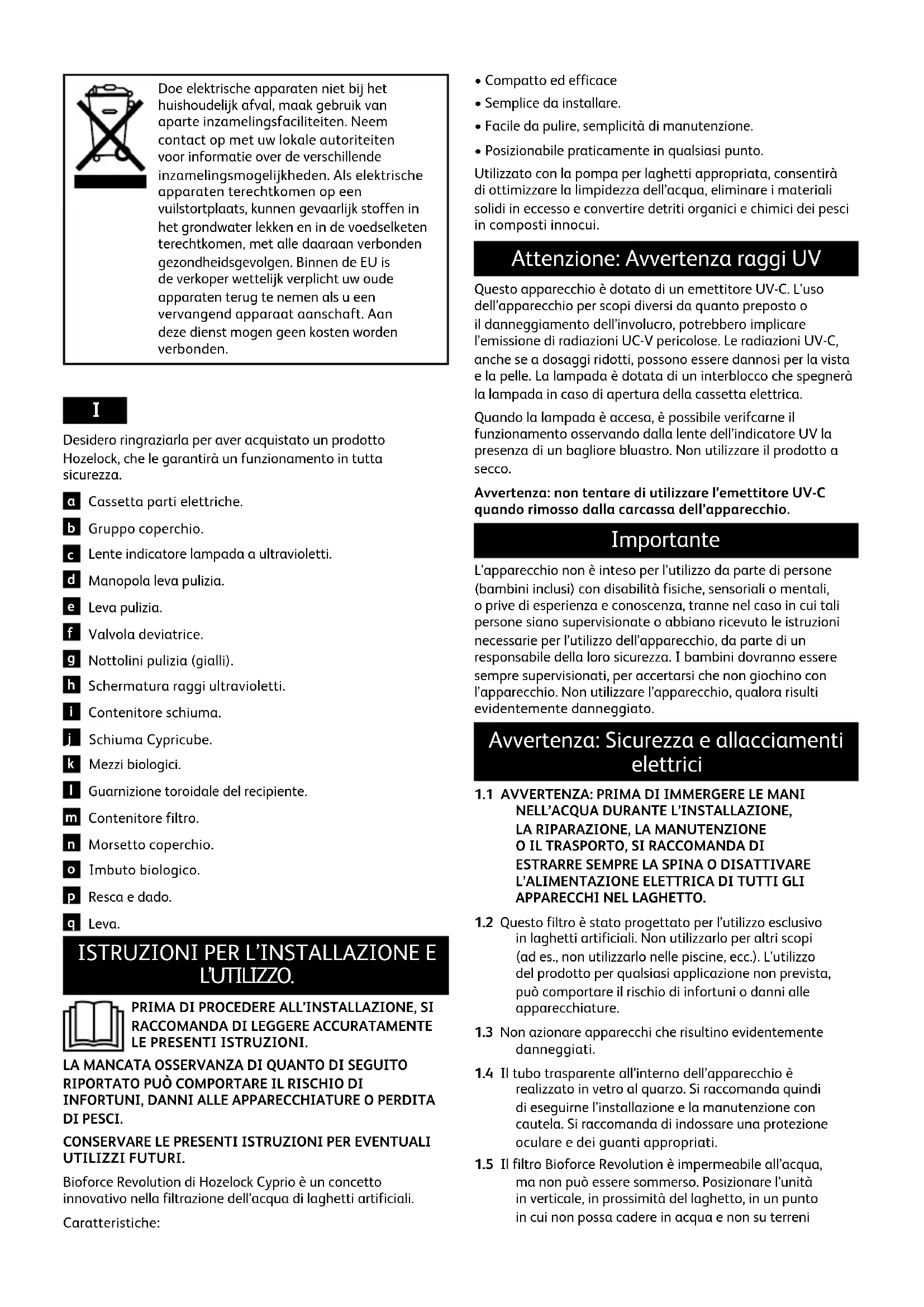 attivi e la crescita delle alghe si interrompe) è possibile spegnere l’unità. L’unità deve essere rimossa, lavata a fondo, pulita, asciugata e conservata in un luogo asciutto e al riparo dal gelo. Riporre sempre l’unità con il coperchio aperto, per garantire una ventilazione e un’asciugatura appropriate.Localizzazione guasti/Domande frequenti (FAQ)questions Problema Causa probabile Azione correttiva Nessun flusso d'acqua dal filtro al laghetto. Pompa d'alimentazione non attivata o non funzionante. Verificare che la pompa funzioni e sia attivata. Flessibile d'alimentazione bloccato. Verificare che non vi siano ostruzioni a livello dei flessibili d'alimentazione e di ritorno al laghetto. Valvola deviatrice impostata su “Waste” (Scarico) Ruotare la valvola deviatrice su “Pond” (Laghetto) Flusso ridotto attraverso il filtro Schiuma bloccata. Pulire il filtro (vedere il paragrafo “Pulizia”). Flessibile d'alimentazione bloccato. Verificare che non vi siano ostruzioni a livello dei flessibili d'alimentazione e di ritorno al laghetto. Problema Causa probabile Azione correttiva Acqua non trasparente Il nuovo filtro non è ancora a livello di maturazione. La trasparenza dell'acqua del laghetto inizierà a migliorare entro 2-3 settimane, ma la maturazione biologica completa, a garanzia di totale efficacia del filtro, sarà completata entro circa 6-8 settimane. Filtro di dimensioni non appropriate per il laghetto. Accertarsi che il filtro sia appropriato per la struttura del laghetto. Pompa di alimentazione di dimensioni non adeguate. Verificare la portata. Vedere il punto 2.2. Lampada UV bruciata. Verificare la lente dell'indicatore UV. Sostituire la lampada UV. Lampada UV usurata. Sostituire la lampada UV ogni 12 mesi. Necessità di pulizia delle schiume espanse. Pulire il filtro (vedere il paragrafo “Pulizia”). L'uscita del flessibile di ritorno del laghetto è ubicata sopra la pompa d'alimentazione. Spostare la pompa o l'uscita del flessibile di ritorno del laghetto, in modo da distanziarle quanto più possibile. Eccessivo popolamento di pesci nel laghetto. Ridurre la quantità di pesci nel laghetto. Alimentazione pesci eccessiva. Alimentare i pesci solamente con una quantità consumabile in alcuni minuti. Provvedere all'alimentazione una sola volta al giorno. La leva per la pulizia non ruota. La pompa si attiva all'inizio della fase di pulizia. Disattivare la pompa. Ruotare la leva più volte in entrambe le direzioni. Attivare la pompa (vedere paragrafo “Pulizia”). Garanzia Clearwater di Hozelock Cyprio ACQUA PULITA O RIMBORSATI. Questa garanzia copre il filtro Bioforce Revolution Hozelock Cyprio quanto utilizzato con la pompa appropriata. La garanzia è valida 12 mesi della data d’acquisto, premesso che: