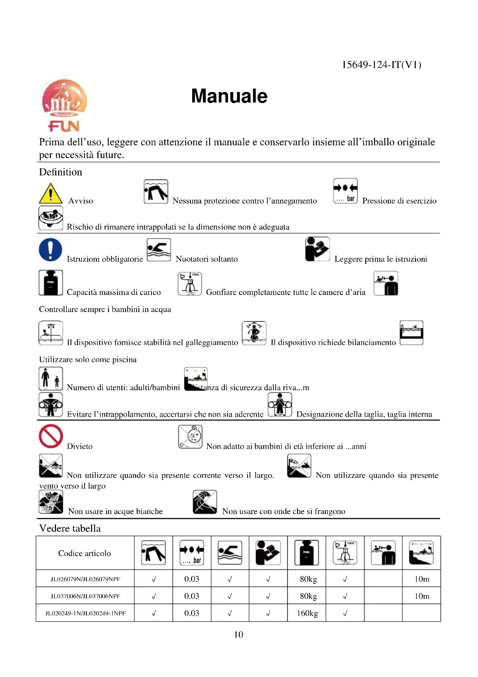 Shanghai Jilong Plastic Products Co. Ltd. No. 460 Lanxue Road, Huanglou, Pudong Area, Shanghai, 201205, P.R. China Tel: +86-21-58942200 E-mail: info@jilong.com Web: www.jilong.com10 Prima dell’uso, leggere con attenzione il manuale e conservarlo insieme all’imballo originale per necessità future. Definition Avviso Nessuna protezione contro l’annegamento Pressione di esercizio Rischio di rimanere intrappolati se la dimensione non è adeguata Istruzioni obbligatorie Nuotatori soltanto Leggere prima le istruzioni Capacità massima di carico Gonfiare completamente tutte le camere d’aria Controllare sempre i bambini in acqua Il dispositivo fornisce stabilità nel galleggiamento Il dispositivo richiede bilanciamento Utilizzare solo come piscina Numero di utenti: adulti/bambini Distanza di sicurezza dalla riva...m Evitare l’intrappolamento, accertarsi che non sia aderente Designazione della taglia, taglia interna Divieto Non adatto ai bambini di età inferiore ai ...anni Non utilizzare quando sia presente corrente verso il largo. Non utilizzare quando sia presente vento verso il largo Non usare in acque bianche Non usare con onde che si frangono Vedere tabella Codice articolo