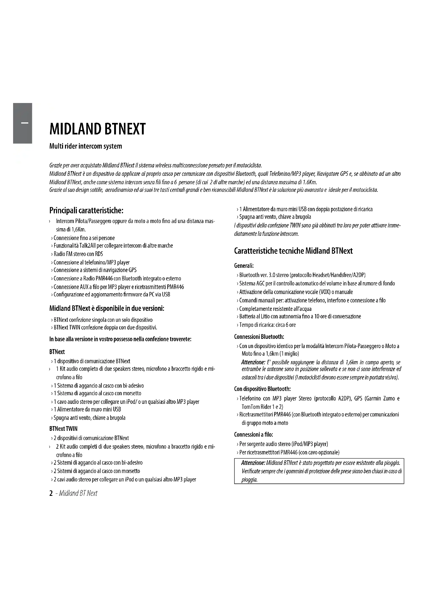MIDLAND BTNEXT Multi rider intercom system Grazie per aver acquistato Midland BTNext il sistema wireless multiconnessione pensato per il motociclista. Midland BTNext è un dispositivo da applicare al proprio casco per comunicare con dispositivi Bluetooth, quali Telefonino/MP3 player, Navigatore GPS e, se abbinato ad un altro Midland BTNext, anche come sistema intercom senza li no a 6 persone (di cui 2 di altre marche) ed una distanza massima di 1.6Km. Grazie al suo design sottile, aerodinamico ed ai suoi tre tasti centrali grandi e ben riconoscibili Midland BTNext è la soluzione più avanzata e ideale per il motociclista. Principali caratteristiche: › Intercom Pilota/Passeggero oppure da moto a moto no ad una distanza mas- sima di 1,6Km. › Connessione no a sei persone › Funzionalità Talk2All per collegare intercom di altre marche › Radio FM stereo con RDS › Connessione al telefonino/MP3 player › Connessione a sistemi di navigazione GPS › Connessione a Radio PMR446 con Bluetooth integrato o esterno › Connessione AUX a lo per MP3 player e ricetrasmittenti PMR446 › Congurazione ed aggiornamento rmware da PC via USB Midland BTNext è disponibile in due versioni: › BTNext confezione singola con un solo dispositivo › BTNext TWIN confezione doppia con due dispositivi.In base alla versione in vostro possesso nella confezione troverete:BTNext › 1 dispositivo di comunicazione BTNext › 1 Kit audio completo di due speakers stereo, microfono a braccetto rigido e mi- crofono a lo › 1 Sistema di aggancio al casco con bi-adesivo › 1 Sistema di aggancio al casco con morsetto › 1 cavo audio stereo per collegare un iPod/ o un qualsiasi altro MP3 player › 1 Alimentatore da muro mini USB › Spugna anti vento, chiave a brugolaBTNext TWIN › 2 dispositivi di comunicazione BTNext › 2 Kit audio completi di due speakers stereo, microfono a braccetto rigido e mi- crofono a lo › 2 Sistemi di aggancio al casco con bi-adesivo › 2 Sistemi di aggancio al casco con morsetto › 2 cavi audio stereo per collegare un iPod o un qualsiasi altro MP3 player › 1 Alimentatore da muro mini USB con doppia postazione di ricarica › Spugna anti vento, chiave a brugolaI dispositivi della confezione TWIN sono già abbinati tra loro per poter attivare imme-diatamente la funzione Intercom. Caratteristiche tecniche Midland BTNext Generali: › Bluetooth ver. 3.0 stereo (protocollo Headset/Handsfree/A2DP) › Sistema AGC per il controllo automatico del volume in base al rumore di fondo › Attivazione della comunicazione vocale (VOX) o manuale › Comandi manuali per: attivazione telefono, interfono e connessione a lo › Completamente resistente all’acqua › Batteria al Litio con autonomia no a 10 ore di conversazione › Tempo di ricarica: circa 6 oreConnessioni Bluetooth: › Con un dispositivo identico per la modalità Intercom Pilota-Passeggero o Moto a Moto no a 1,6km (1 miglio) Attenzione: E’ possibile raggiungere la distanza di 1,6km in campo aperto, se entrambe le antenne sono in posizione sollevata e se non ci sono interferenze ed ostacoli tra i due dispositivi (i motociclisti devono essere sempre in portata visiva).Con dispositivo Bluetooth: › Telefonino con MP3 player Stereo (protocollo A2DP), GPS (Garmin Zumo e TomTom Rider 1 e 2) › Ricetrasmettitori PMR446 (con Bluetooth integrato o esterno) per comunicazioni di gruppo moto a motoConnessioni a filo: › Per sorgente audio stereo (iPod/MP3 player) › Per ricetrasmettitori PMR446 (con cavo opzionale) Attenzione: Midland BTNext è stato progettato per essere resistente alla pioggia. Vericate sempre che i gommini di protezione delle prese siano ben chiusi in caso di pioggia.I Midland BT Next - 3 Ricarica delle batterie Assicuratevi che il dispositivo di comunicazione sia completamente carico prima di iniziare ad utilizzarlo. La prima volta sono necessarie almeno 8 ore. Successi- vamente il tempo si riduce mediamente a 4/6 ore per una ricarica completa. Per ragioni di comodità, il dispositivo può essere rimosso dal casco prima di essere ricaricato. Per caricare il dispositivo di comunicazione, sollevate la protezione in gomma della presa di ricarica e collegate ad essa lo spinotto del caricatore, quindi innestate la spina CA del caricatore ad una presa di rete elettrica. Il LED rosso lampeggerà per tutto il tempo della ricarica. Lasciate l’apparecchio collegato no a che il LED rosso si spegne o il LED blu rimane acceso sso. Quando la carica è completa, (LED rosso non più lampeggiante) scollegate il di- spositivo dal caricatore. Attenzione: ogni volta che viene inserito (o disinserito) il connettore di ricarica, il di- spositivo si spegne (per utilizzarlo mentre è in carica è necessario quindi riaccenderlo con il connettore inserito). Descrizione dispositivo e sistema di fissaggio Descrizione BTNext Il dispositivo BTNext è dotato di 5 pulsanti, tutti nella parte frontale. I tre pulsanti principali sono pulsanti multifunzione: pulsante Avanti (a sinistra), pulsante Centrale e pulsante Indietro (a destra). I due pulsanti rotondi più piccoli, in alto a destra, sono invece il Volume + ed il volume -. Descrizione delle connessioni a filo Presa Ricarica: Permette la ricarica del dispositivo tramite alimentatore mini USB standard Presa Audio Kit: Permette la connessione del kit audio (cue stereo e microfono) Presa audio ausiliaria (AUX): Permette la connessione di una sorgente audio come un iPod/MP3 player stereo o un ricetrasmettitore PMR446 Inne il BTNext è dotato di un’antenna sollevabile, posizionata sulla parte alta del dispositivo, che, se spostata in posizione verticale, permette di ottenere le massime prestazioni in distanza. Per sollevare l’antenna è suciente fare una leggera pressione verso il casco, que- sta si sgancerà ed immediatamente si posizionerà in verticale. Per chiudere l’antenna basta riportarla nella posizione orizzontale e fare una leggera pressione verso l’esterno in modo che si incast