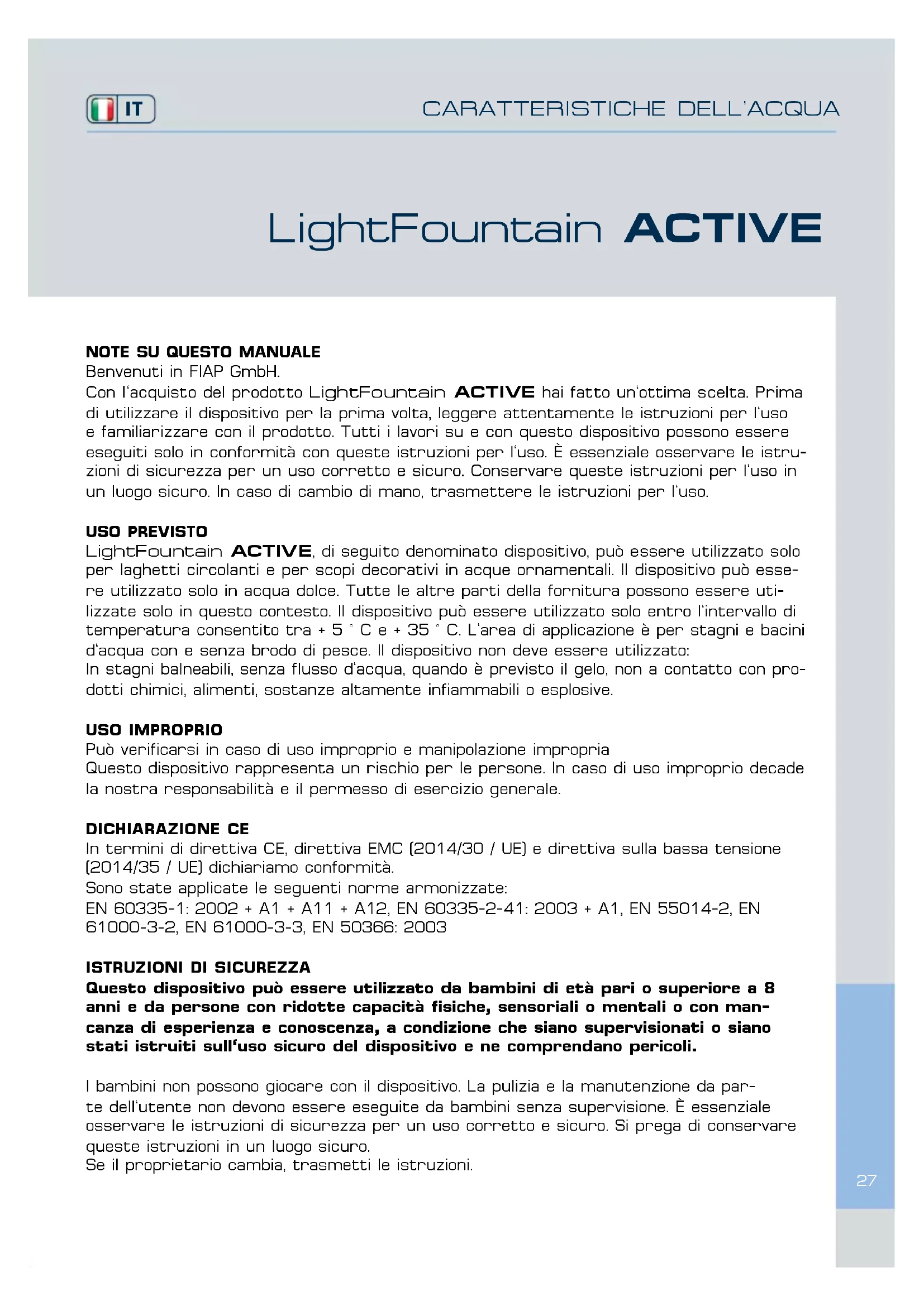 Con l'acquisto del prodotto LightFountain ACTIVE hai fatto un'ottima scelta. Prima di utilizzare il dispositivo per la prima volta, leggere attentamente le istruzioni per l'uso e familiarizzare con il prodotto. Tutti i lavori su e con questo dispositivo possono essere eseguiti solo in conformità con queste istruzioni per l'uso. È essenziale osservare le istruzioni di sicurezza per un uso corretto e sicuro. Conservare queste istruzioni per l'uso in un luogo sicuro. In caso di cambio di mano, trasmettere le istruzioni per l'uso.