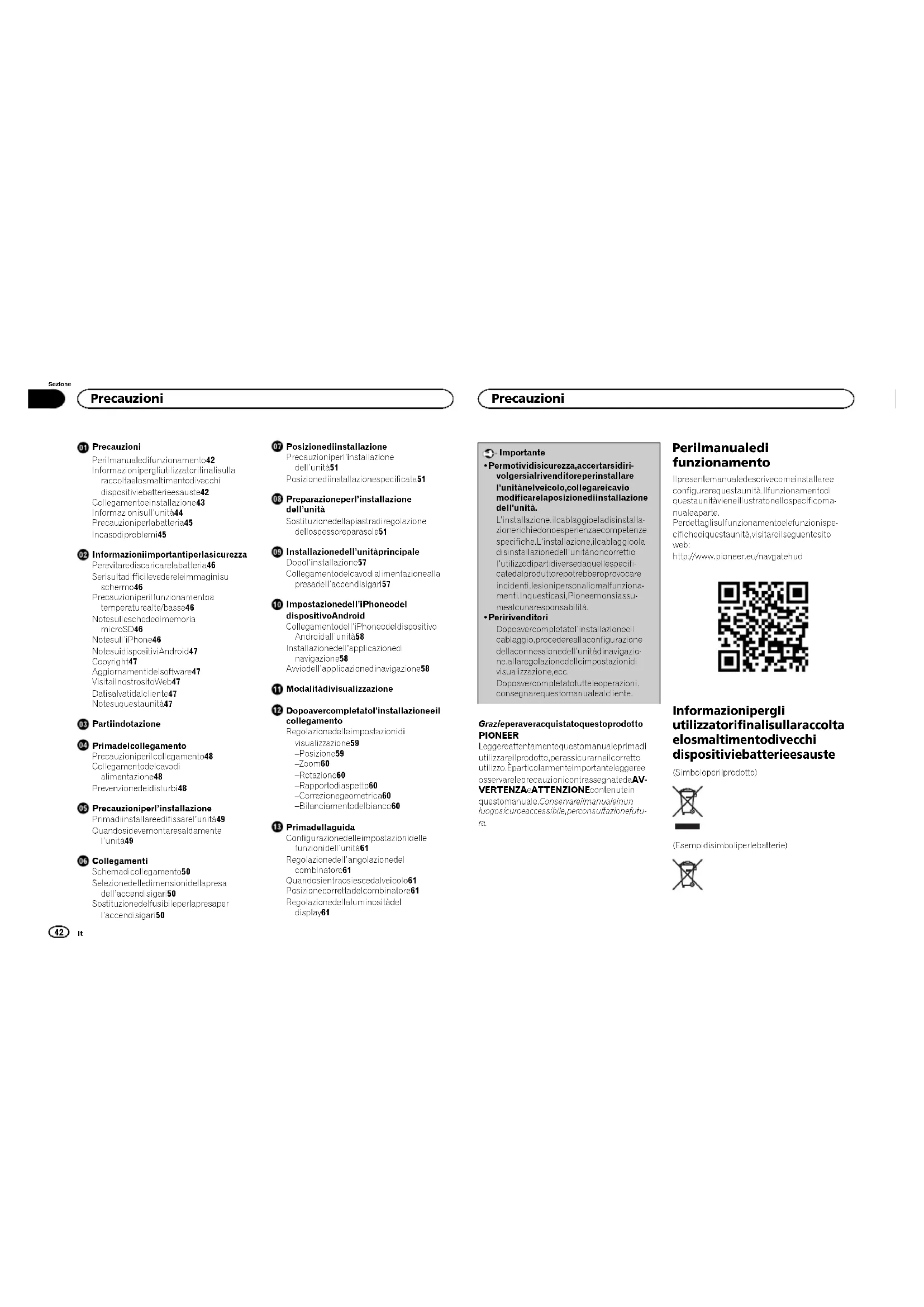 <CRD4765-A>41Black plate (42,1) Precauzioni Per il manuale di funzionamento 42 Informazioni per gli utilizzatori finali sulla raccolta e lo smaltimento di vecchi dispositivi e batterie esauste 42 Collegamento e installazione 43 Informazioni sull’unità 44 Precauzioni per la batteria 45 In caso di problemi 45 Informazioni importanti per la sicurezza Per evitare di scaricare la batteria 46 Se risulta difficile vedere le immagini su schermo 46 Precauzioni per il funzionamento a temperature alte/basse 46 Note sulle schede di memoria microSD 46 Note sull’iPhone 46 Note sui dispositivi Android 47 Copyright 47 Aggiornamenti del software 47 Visita il nostro sito Web 47 Dati salvati dal cliente 47 Note su questa unità 47 Parti in dotazione Prima del collegamento Precauzioni per il collegamento 48 Collegamento del cavo di alimentazione 48 Prevenzione dei disturbi 48 Precauzioni per l’installazione Prima di installare e di fissare l’unità 49 Quando si deve montare saldamente l’unità 49 Collegamenti Schema di collegamento 50 Selezione delle dimensioni della presa dell’accendisigari 50 Sostituzione del fusibile per la presa per l’accendisigari 50 Posizione di installazione Precauzioni per l’installazione dell’unità 51 Posizione di installazione specificata 51 Preparazione per l ’installazione dell’unità Sostituzione della piastra di regolazione dello spessore parasole 51 Installazione dell’unità principale Dopo l’installazione 57 Collegamento del cavo di alimentazione alla presa dell’accendisigari 57 Impostazione dell’iPhone o del dispositivo Android Collegamento dell’iPhone o del dispositivo Android all’unità 58 Installazione dell’applicazione di navigazione 58 Avvio dell’applicazione di navigazione 58 Modalità di visualizzazione Dopo aver completato l’installazione e il collegamento Regolazione delle impostazioni di visualizzazione 59 – Posizione 59 – Zoom 60 – Rotazione 60 – Rapporto di aspetto 60 – Correzione geometrica 60 – Bilanciamento del bianco 60 Prima della guida Configurazione delle impostazioni delle funzioni dell’unità 61 Regolazione dell’angolazione del combinatore 61 Quando si entra o si esce dal veicolo 61 Posizione corretta del combinatore 61 Regolazione della luminosità del display 61 Importante ! Per motivi di sicurezza, accertarsi di ri- volgersi al rivenditore per installare l’unità nel veicolo, collegare i cavi o modificare la posizione di installazione dell’unità. L’installazione, il cablaggio e la disinstalla- zione richiedono esperienza e competenze specifiche. L’installazione, il cablaggio o la disinstallazione dell’unità non corretti o l’utilizzo di parti diverse da quelle specifi- cate dal produttore potrebbero provocare incidenti, lesioni personali o malfunziona- menti. In questi casi, Pioneer non si assu- me alcuna responsabilità. ! Per i rivenditori Dopo aver completato l’installazione e il cablaggio, procedere alla configurazione della connessione dell’unità di navigazio- ne, alla regolazione delle impostazioni di visualizzazione, ecc. Dopo aver completato tutte le operazioni, consegnare questo manuale al cliente. Grazie per aver acquistato questo prodotto PIONEER Leggere attentamente questo manuale prima di utilizzare il prodotto, per assicurarne il corretto utilizzo. È particolarmente importante leggere e osservare le precauzioni contrassegnate da AV- VERTENZA e ATTENZIONE contenute in questo manuale. Conservare il manuale in un luogo sicuro e accessibile, per consultazione futu- ra. Per il manuale di funzionamento Il presente manuale descrive come installare e configurare questa unità. Il funzionamento di questa unità viene illustrato nello specifico ma- nuale a parte. Per dettagli sul funzionamento e le funzioni spe- cifiche di questa unità, visitare il seguente sito web: http://www.pioneer.eu/navgatehud Informazioni per gli utilizzatori finali sulla raccolta e lo smaltimento di vecchi dispositivi e batterie esauste (Simbolo per il prodotto) (Esempi di simboli per le batterie) Precauzioni
